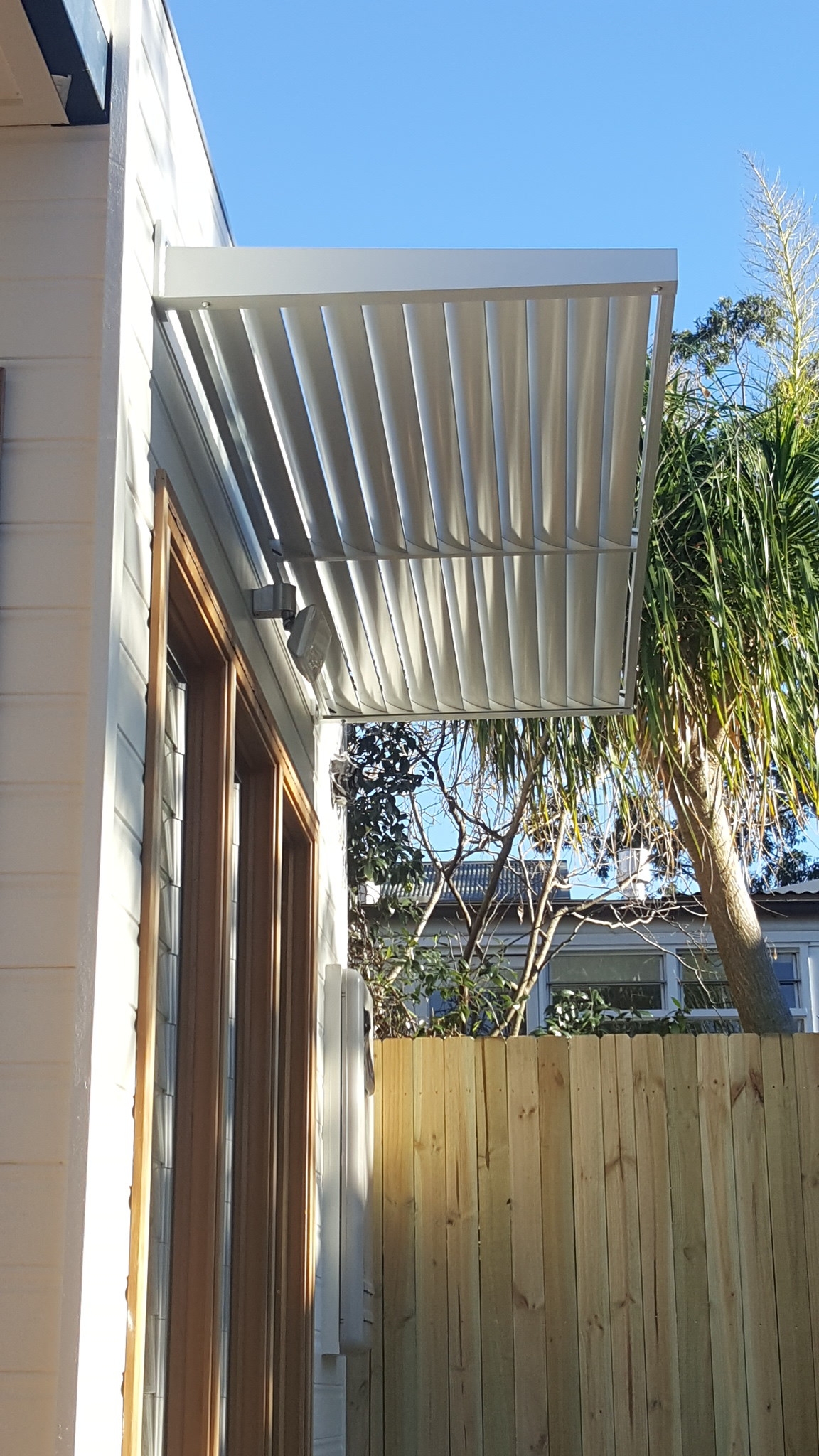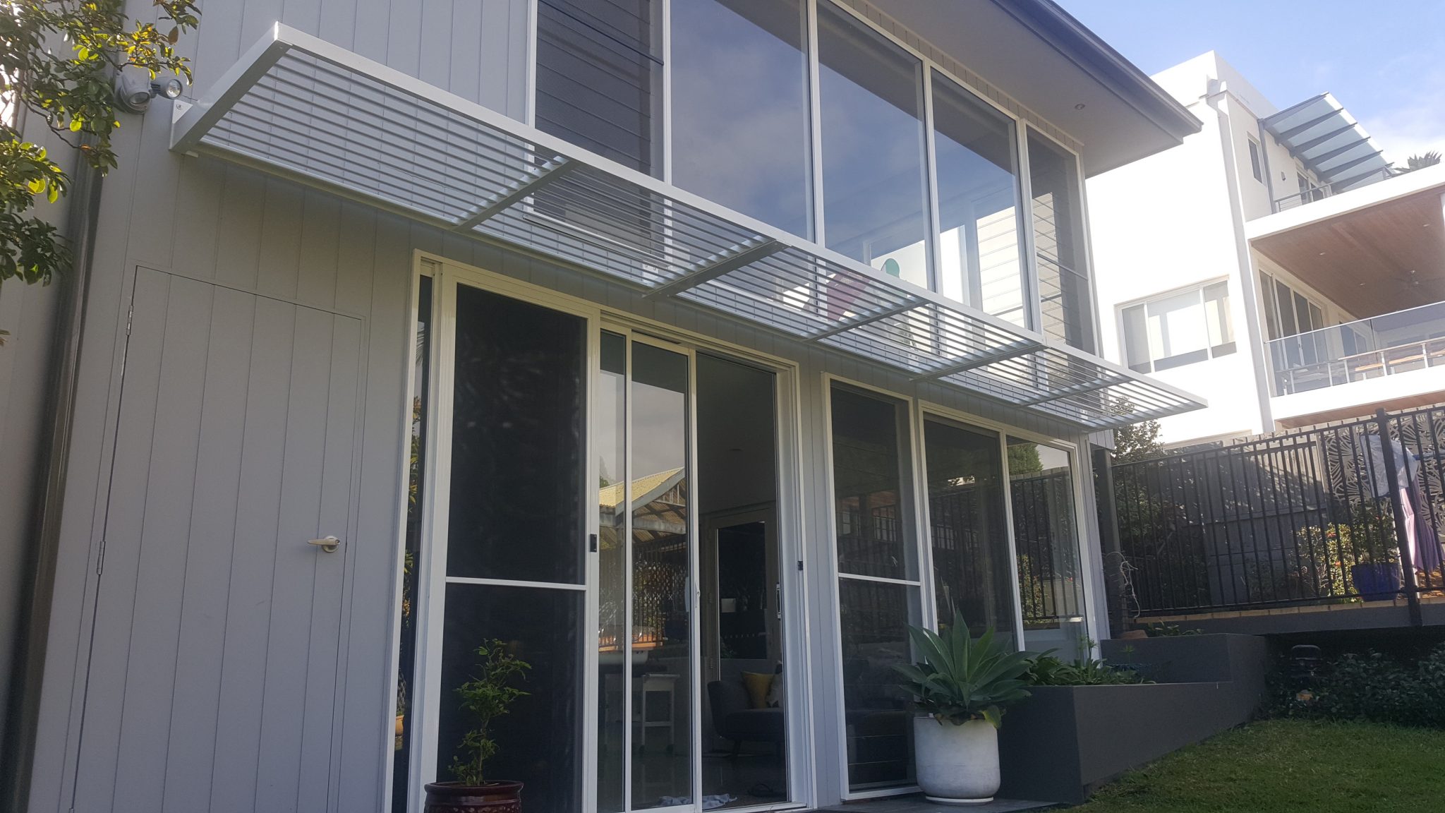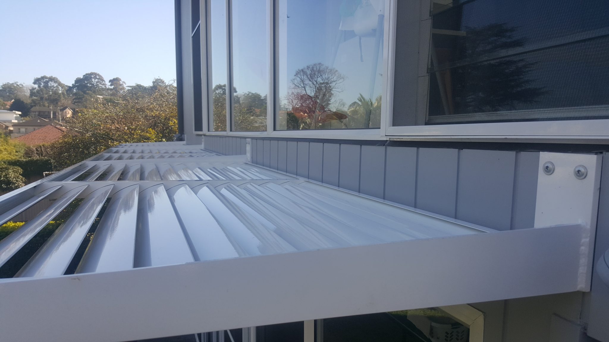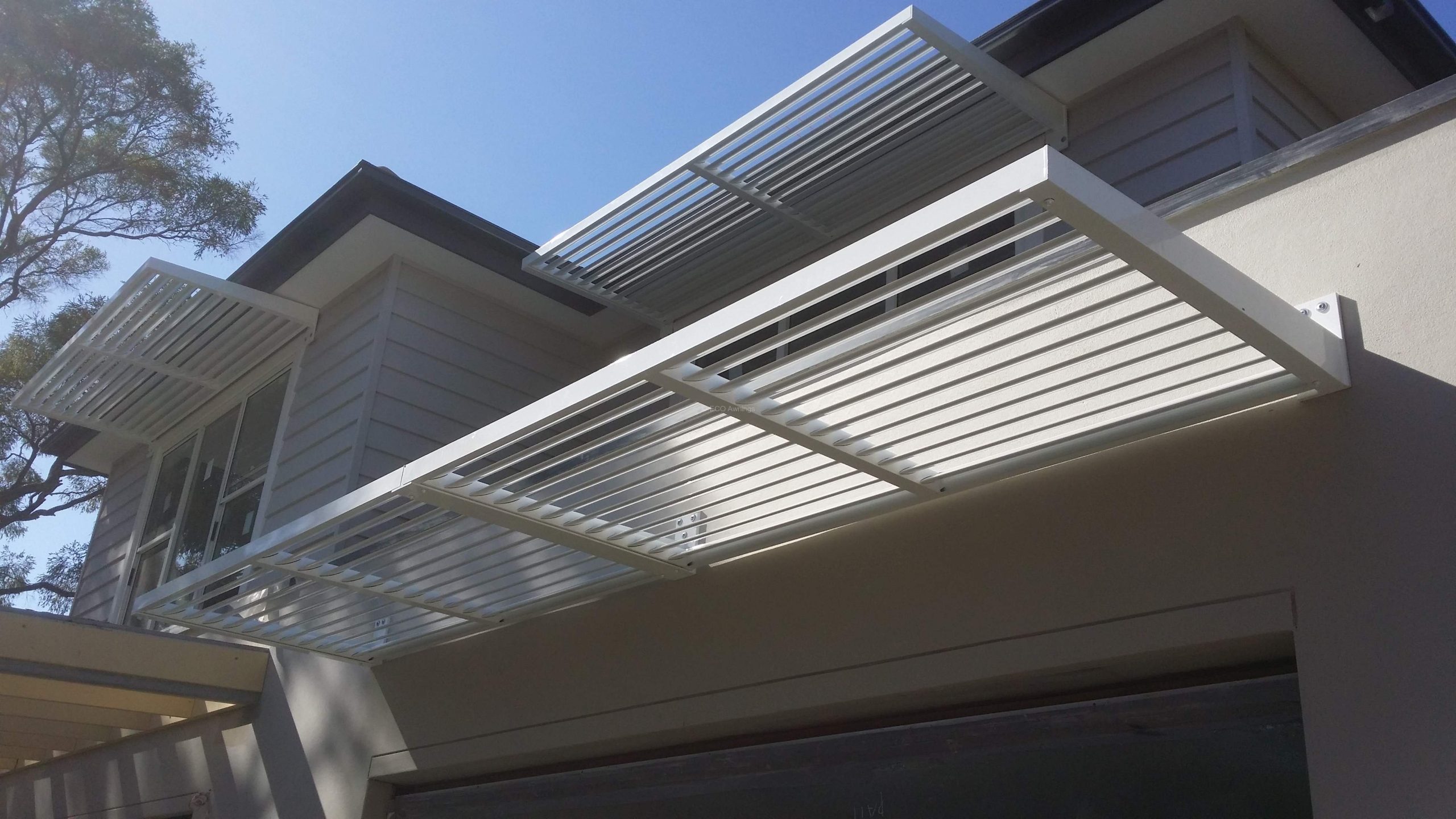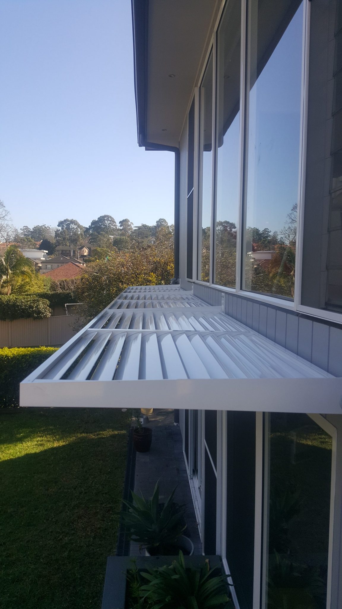 Aluminium cantilever louvres over sliding doors and windows, white powder coat, no front posts, Sydney home