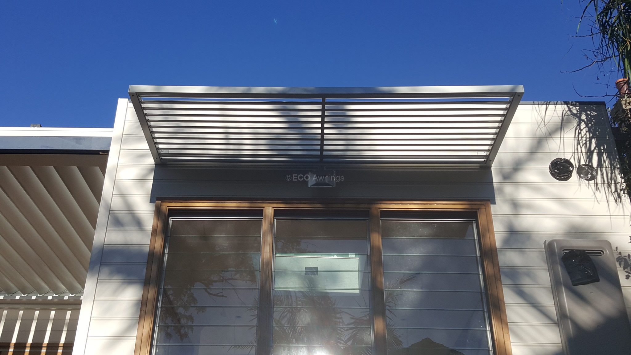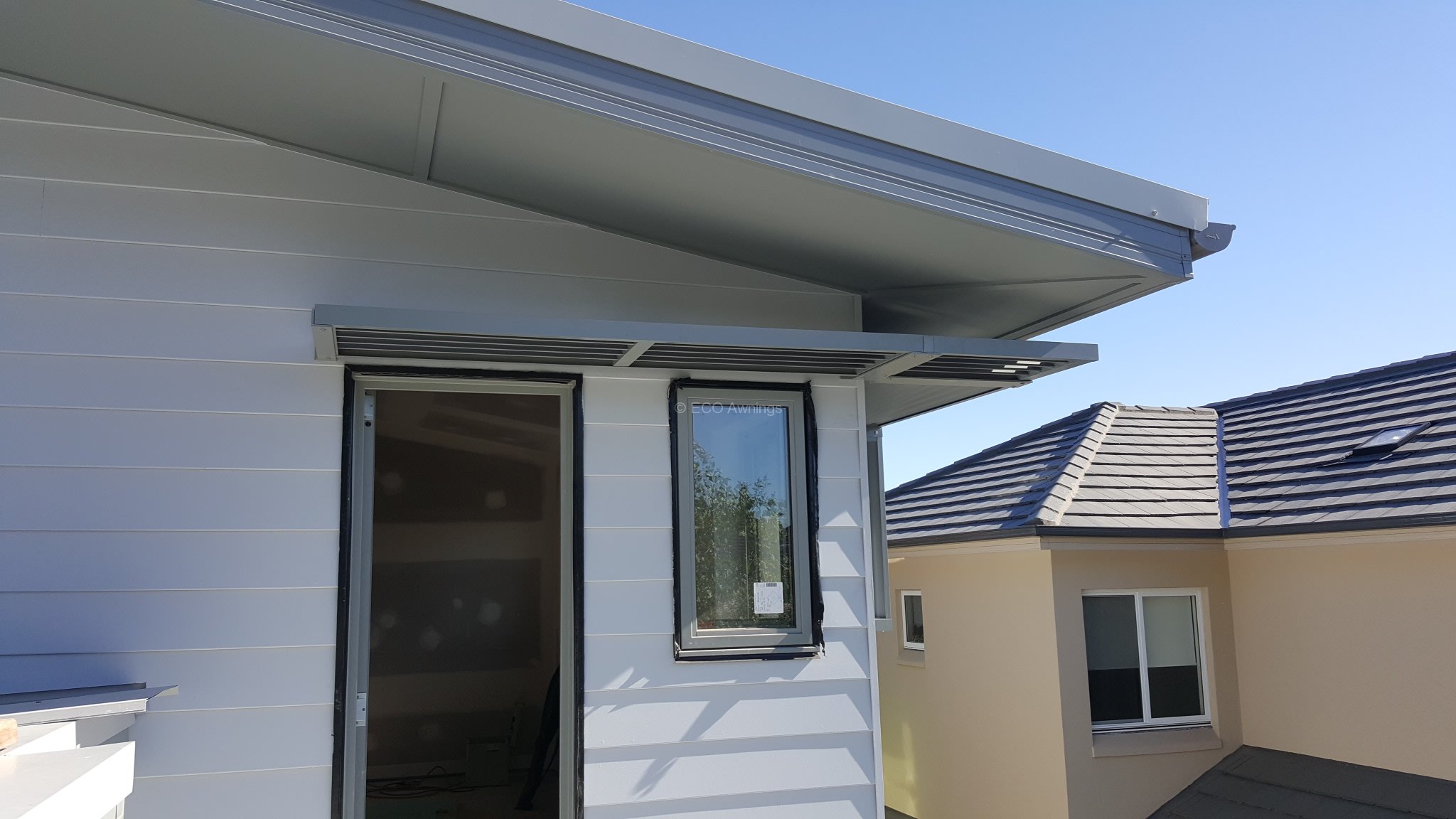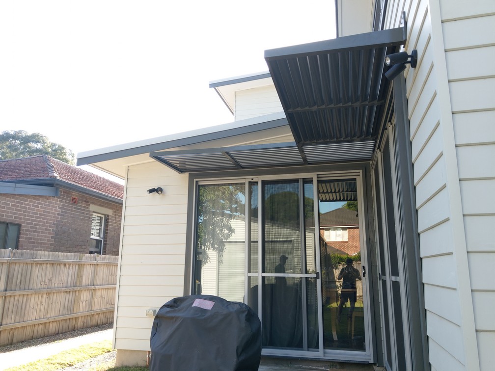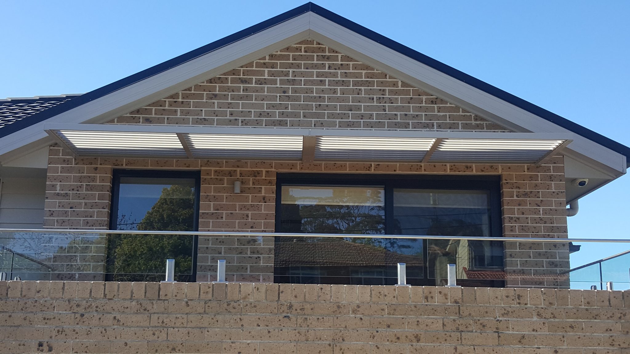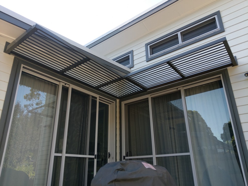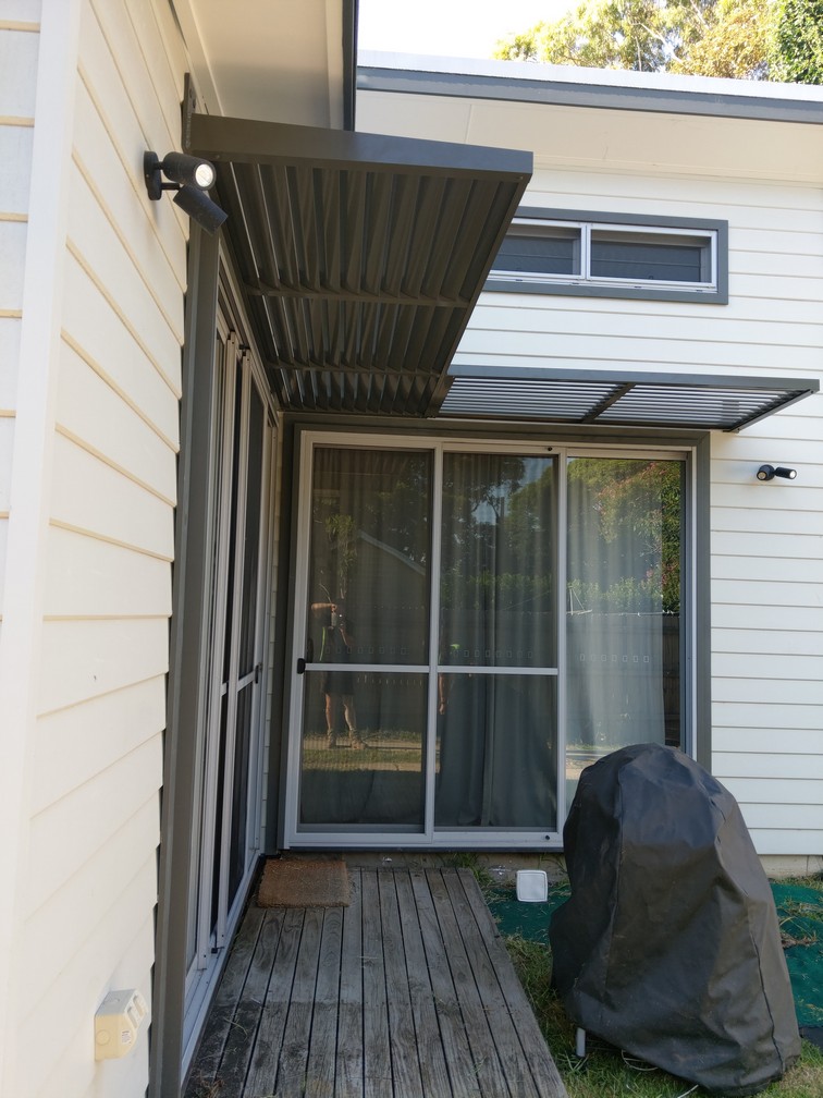 Aluminium cantilever louvres over sliding doors and windows, white powder coat, no front posts, Sydney home