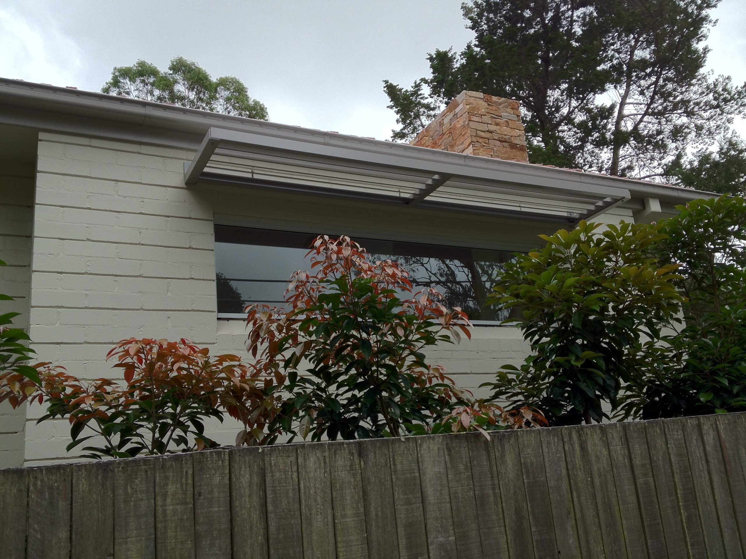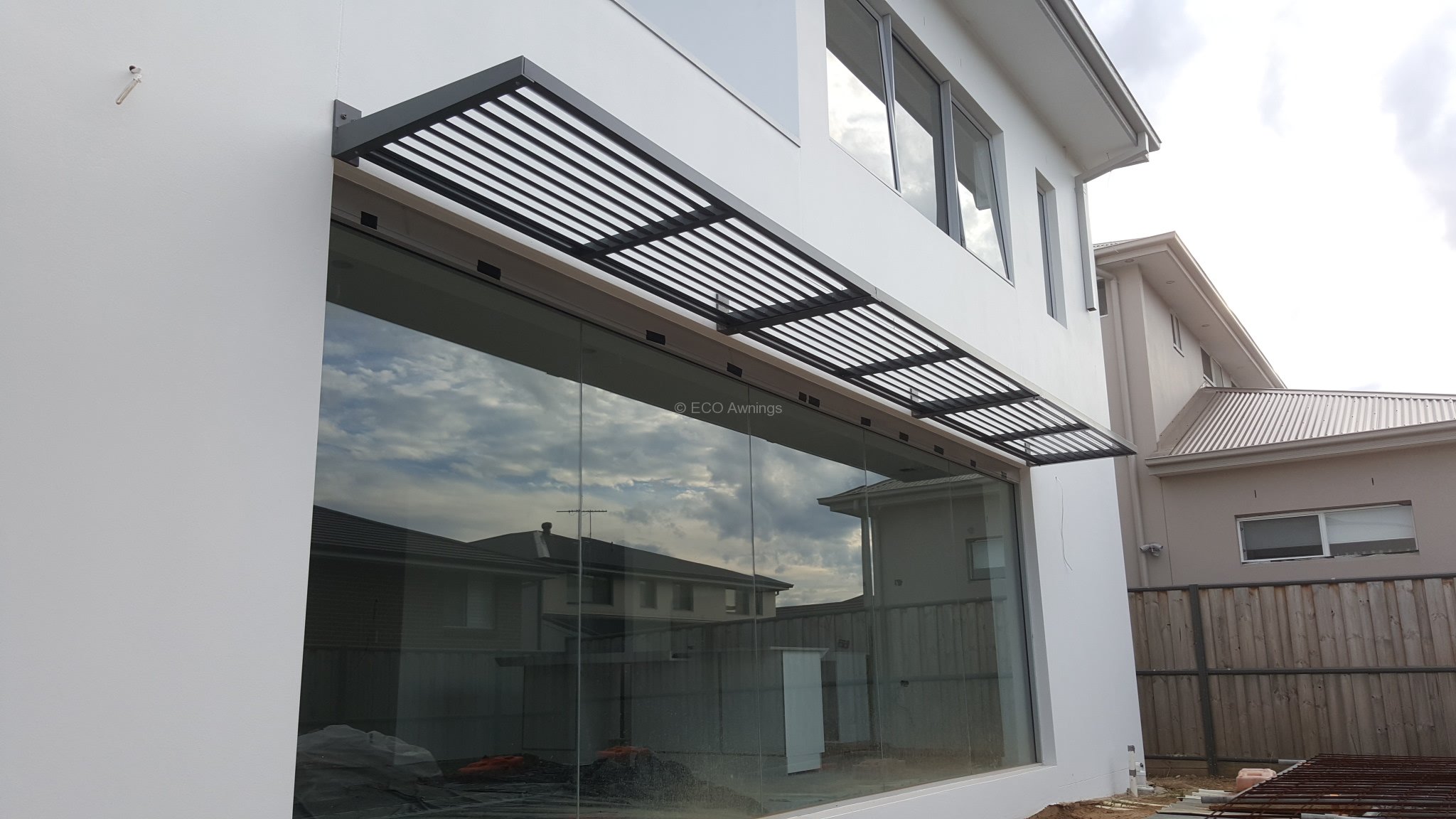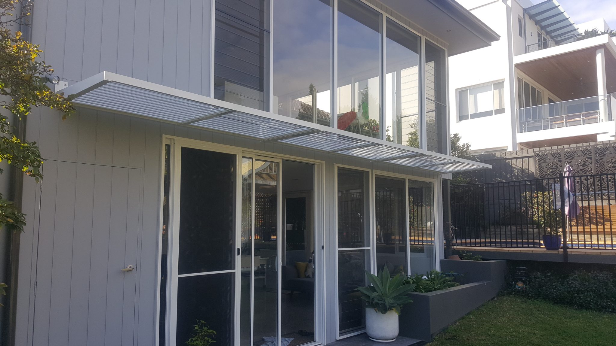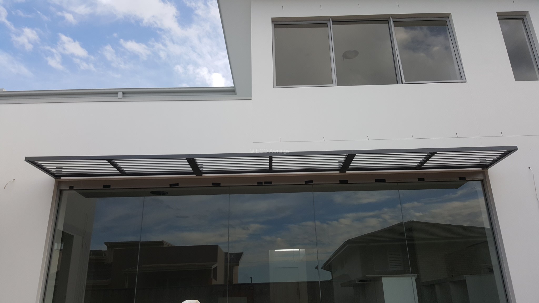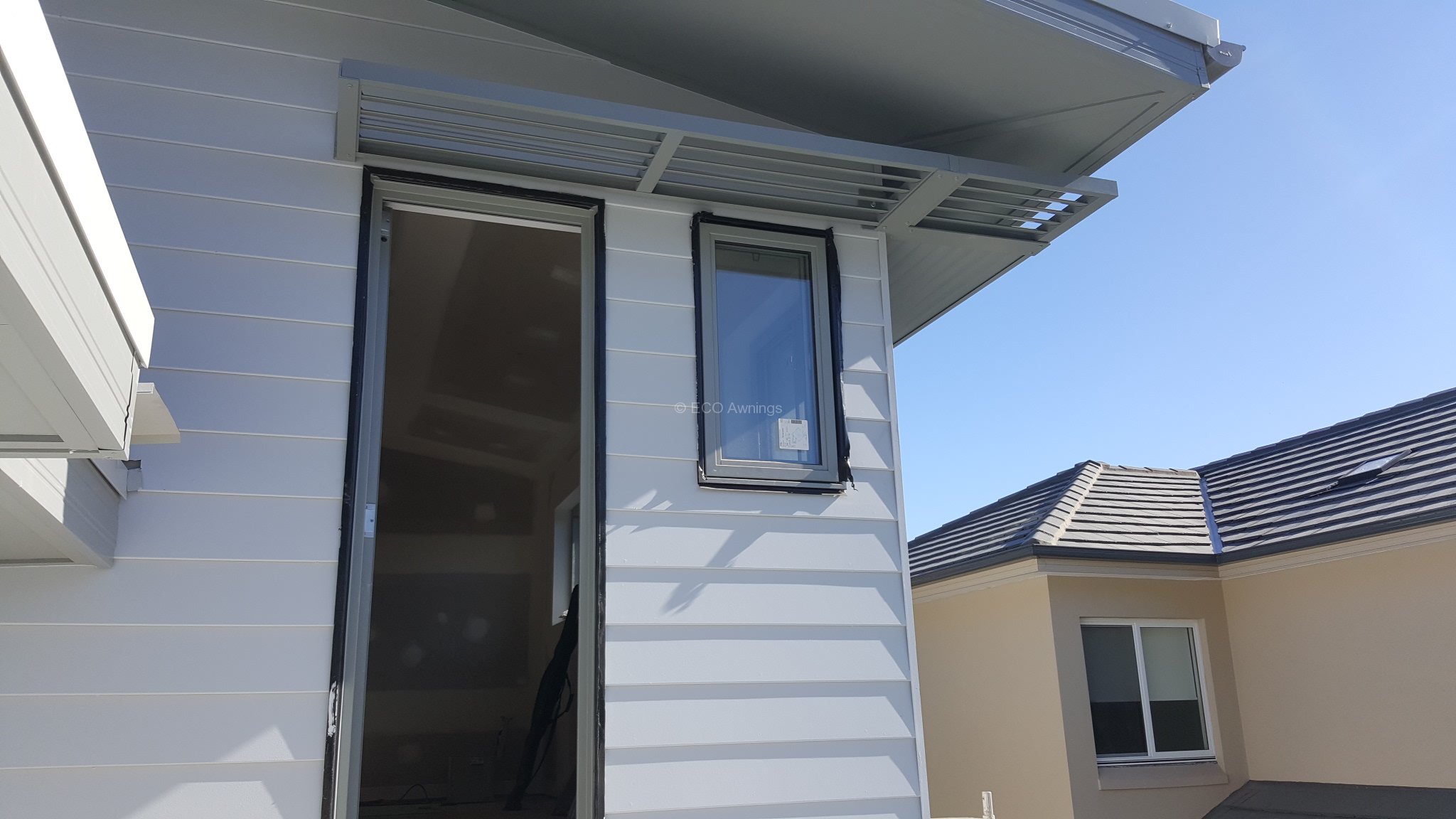 Aluminium cantilever louvres over sliding doors and windows, white powder coat, no front posts, Sydney home