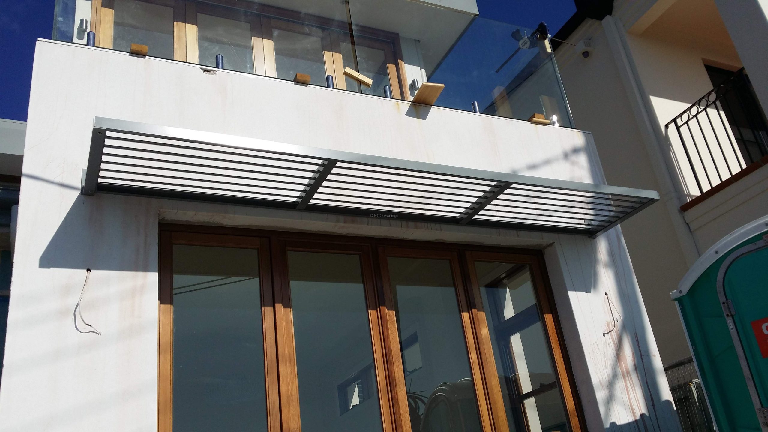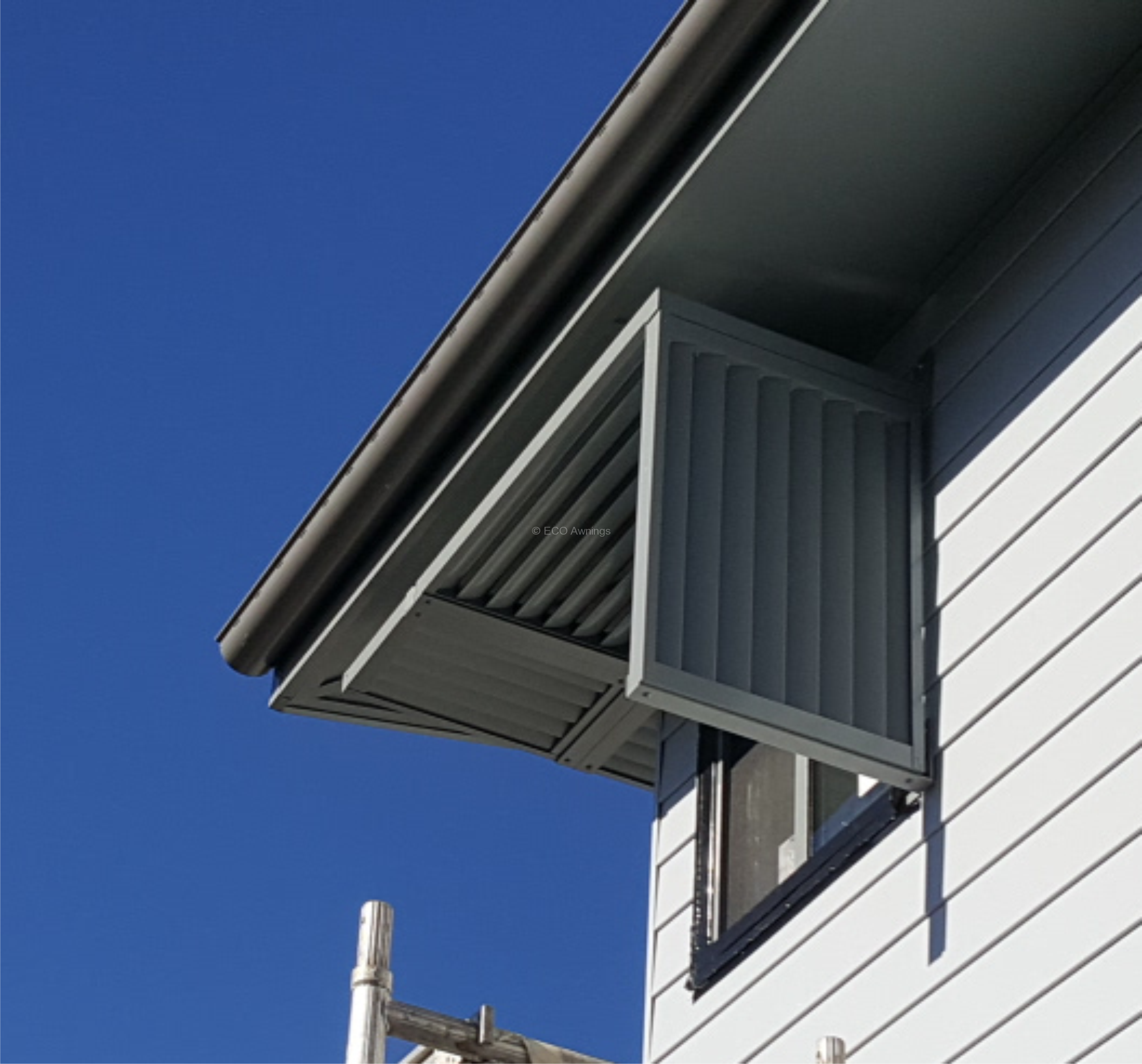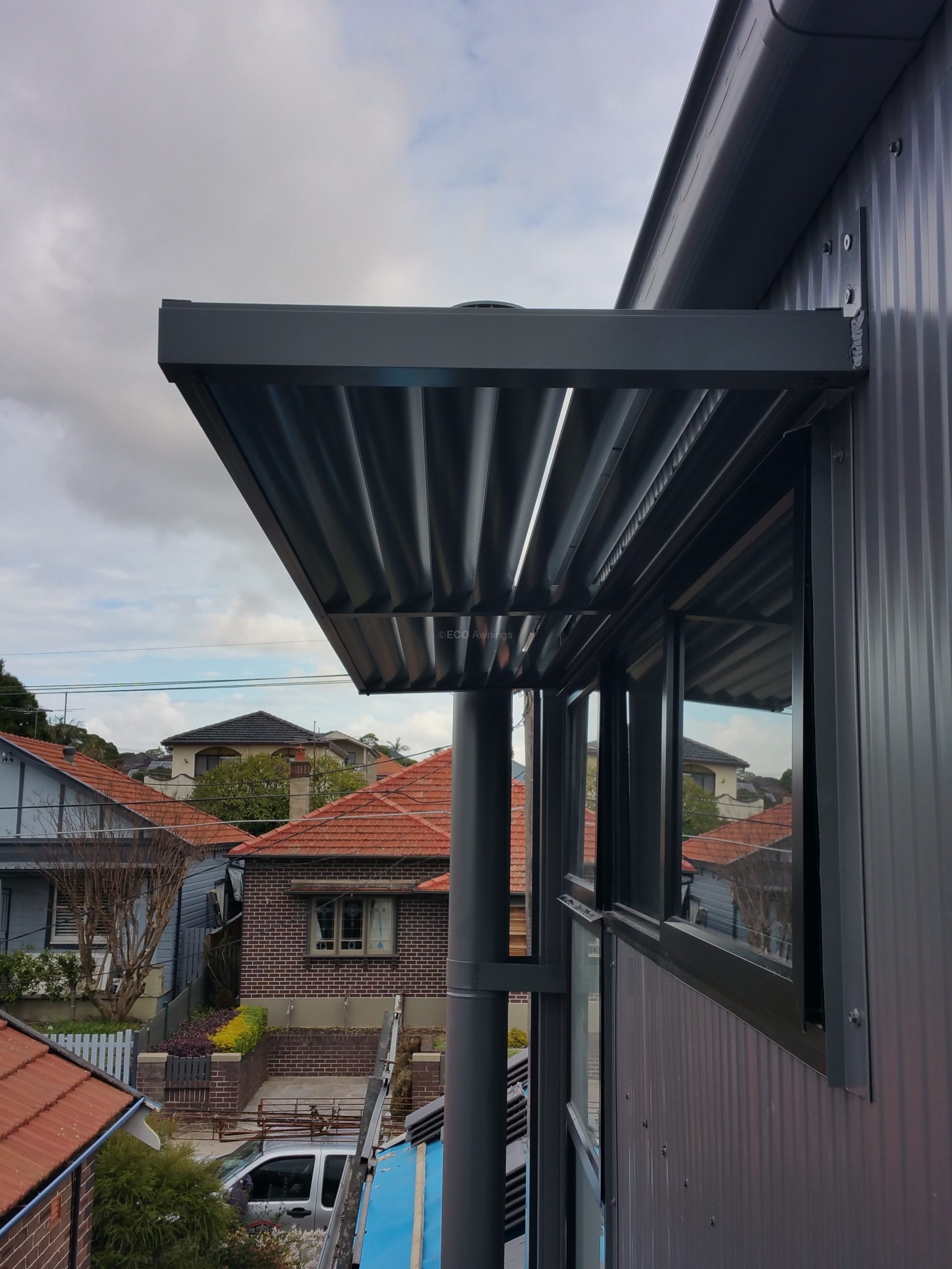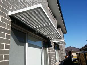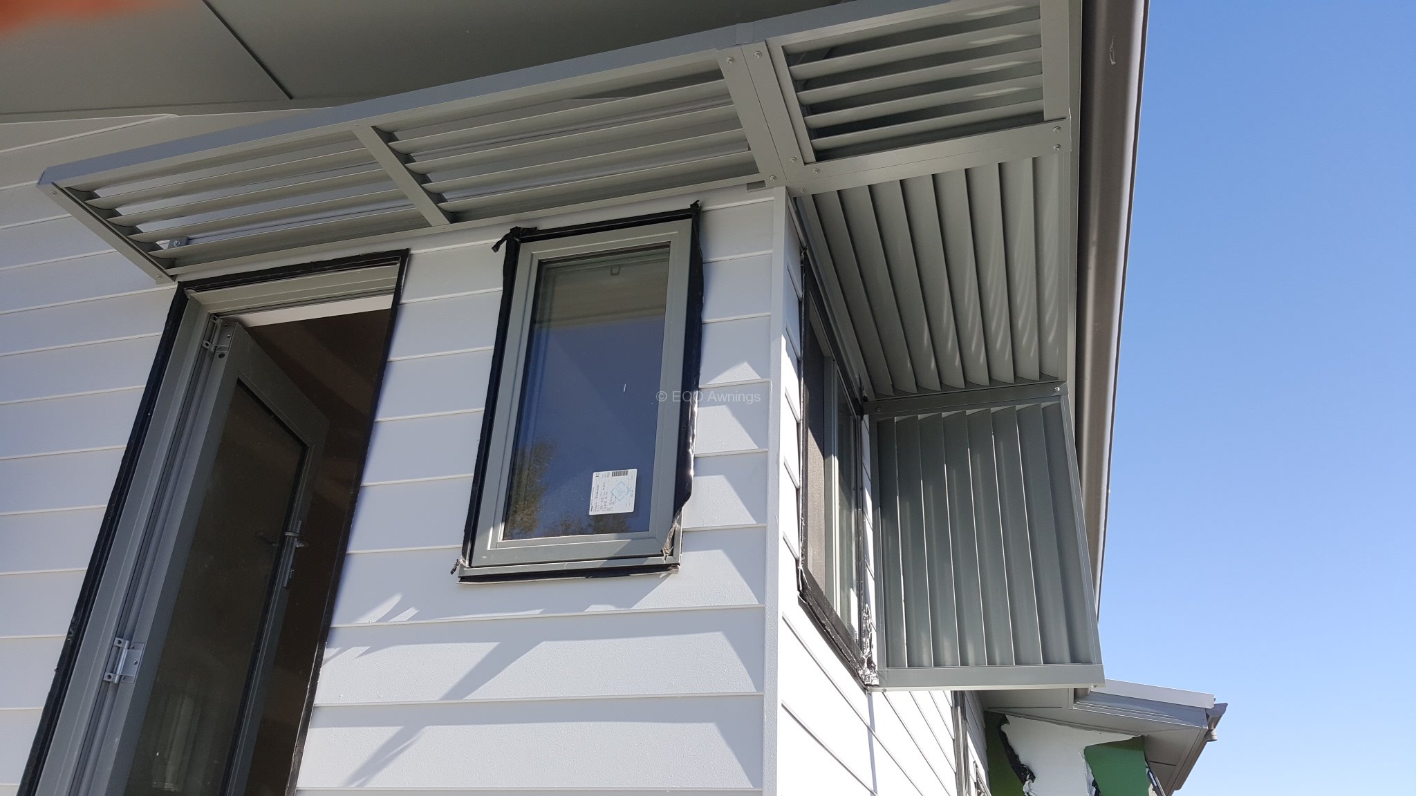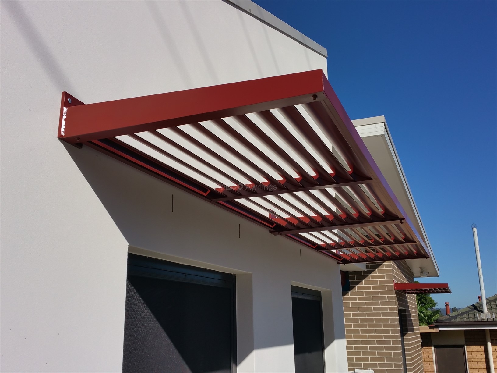 Aluminium cantilever louvres over sliding doors and windows, white powder coat, no front posts, Sydney home