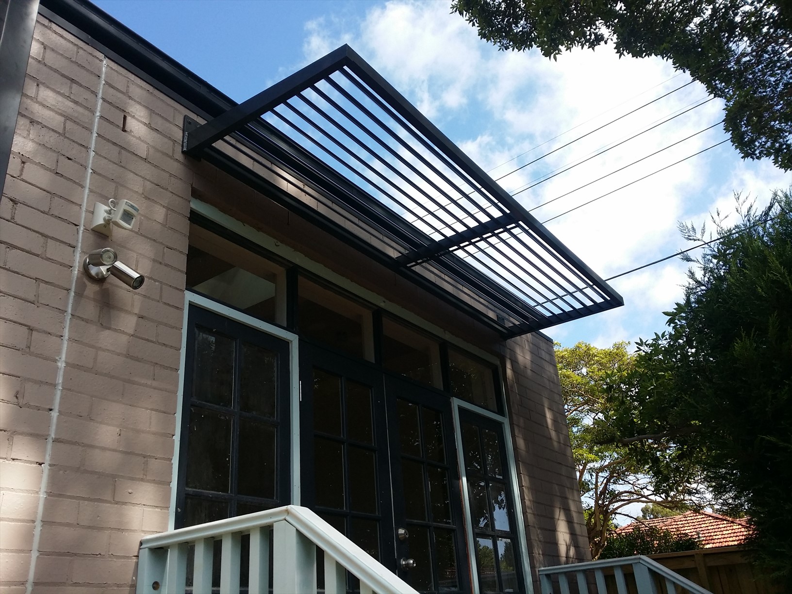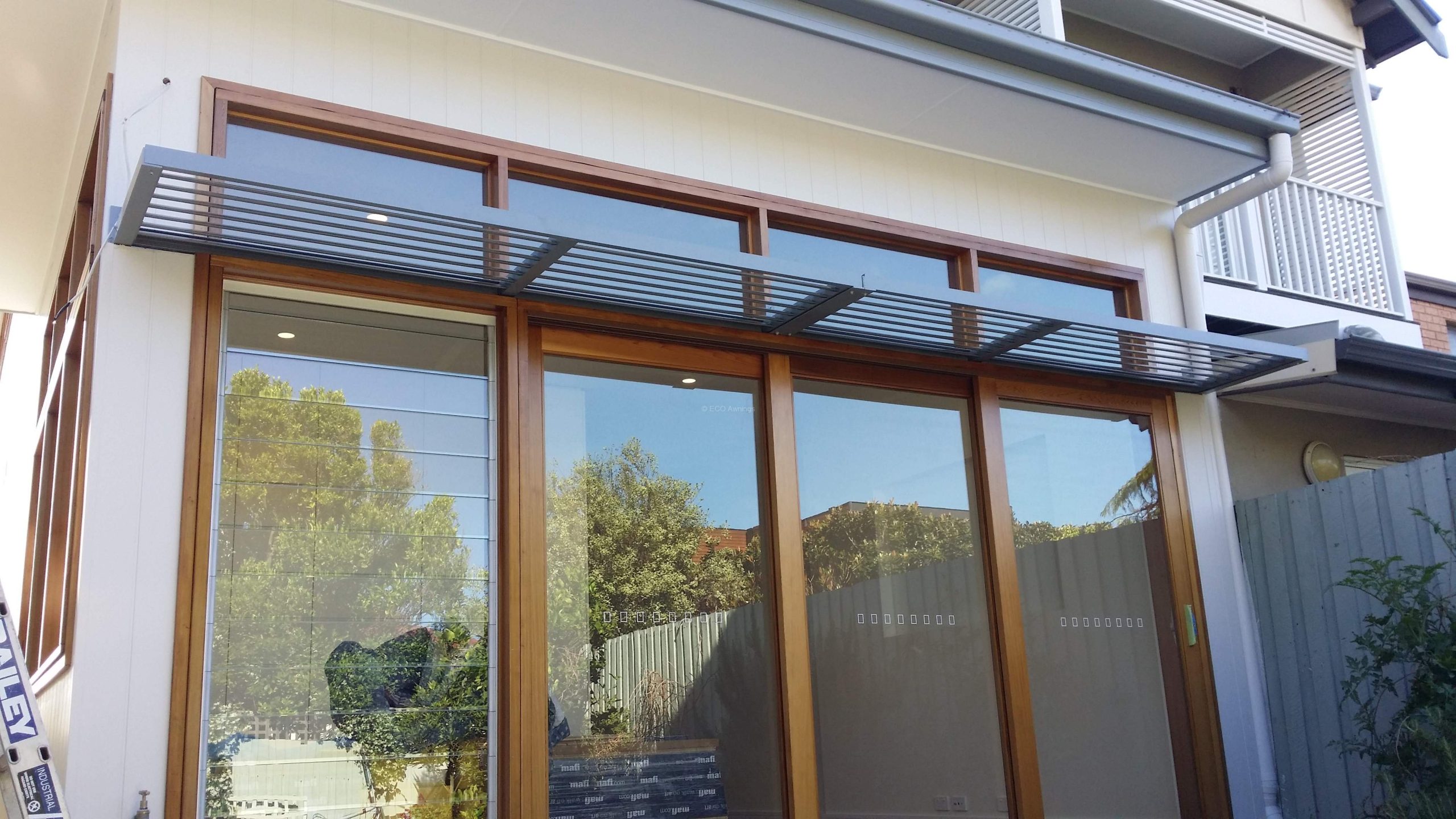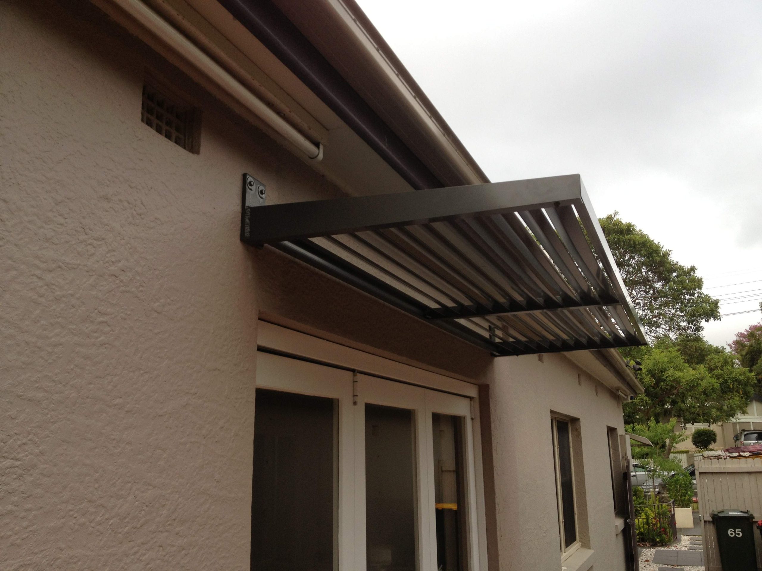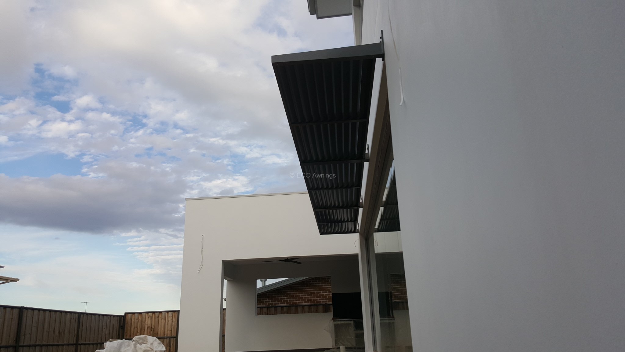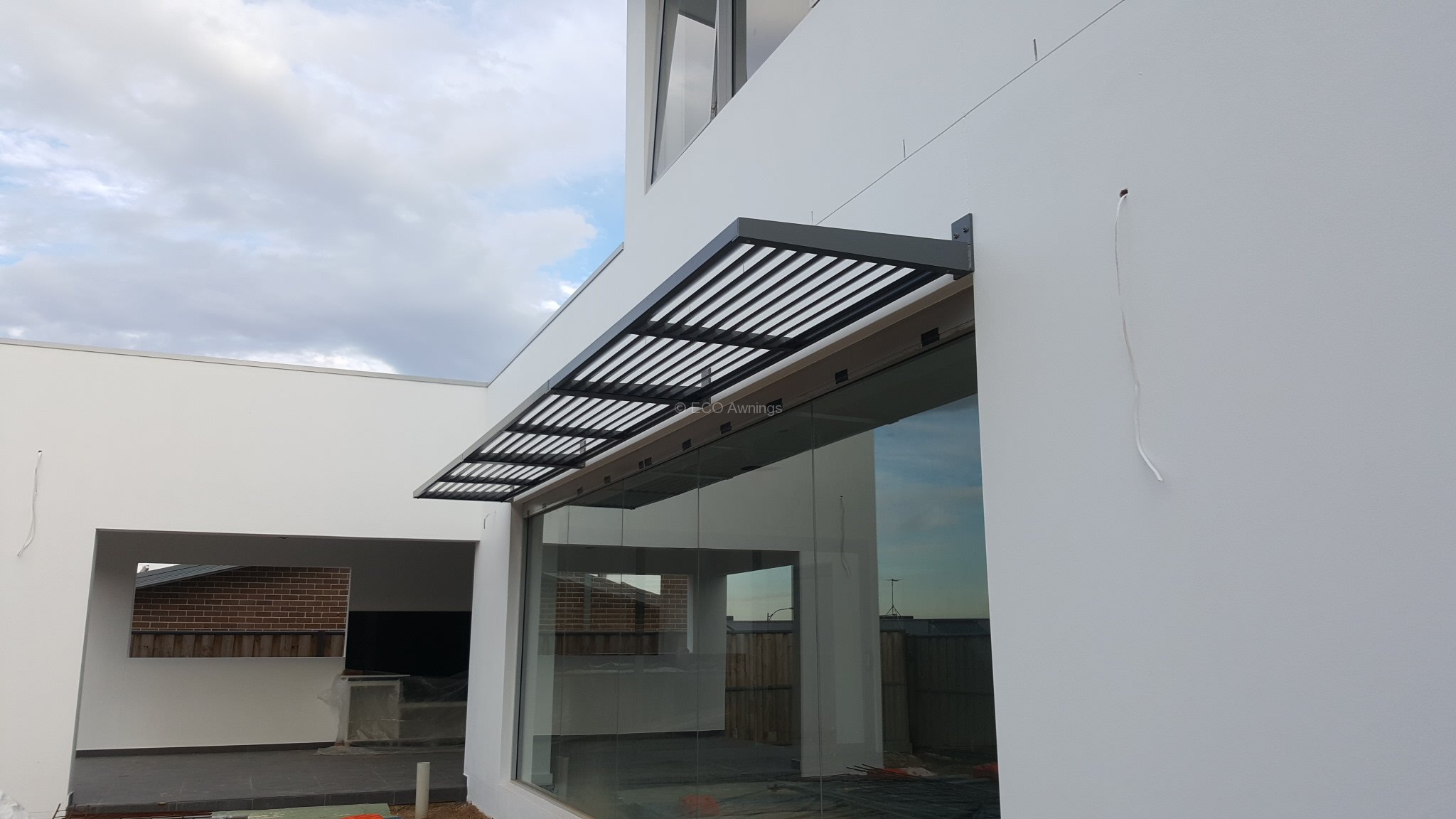 Aluminium cantilever louvres over sliding doors and windows, white powder coat, no front posts, Sydney home