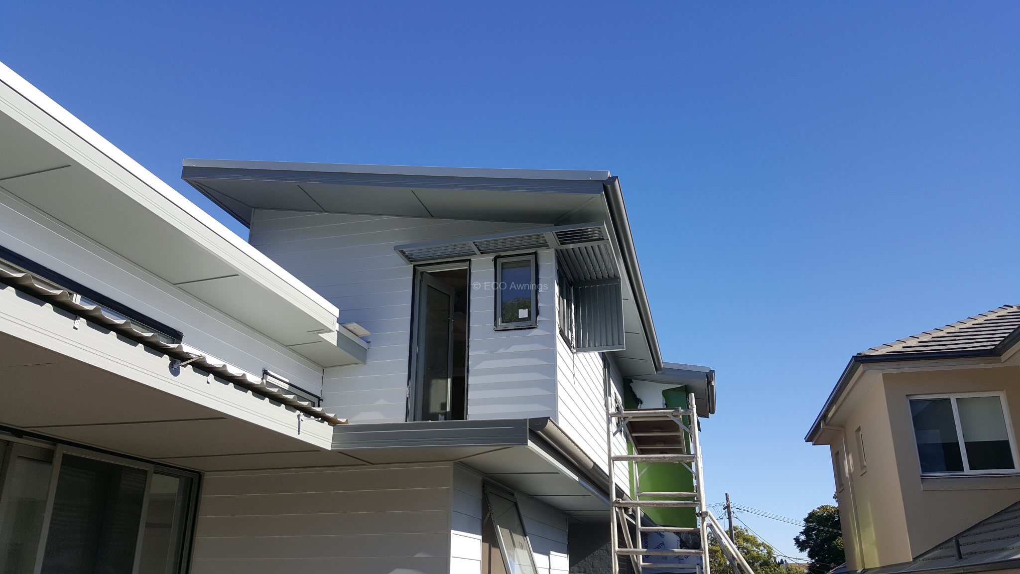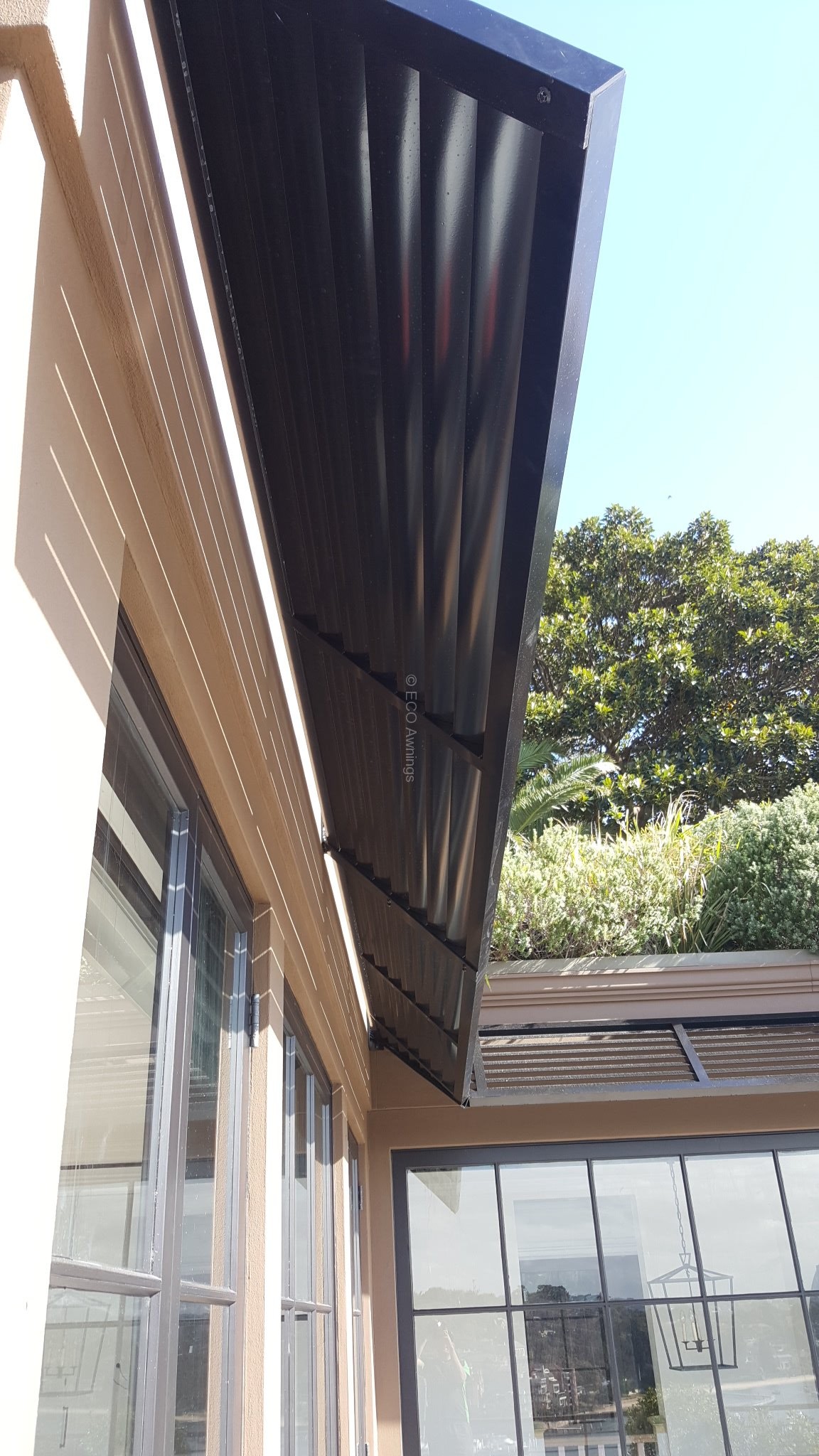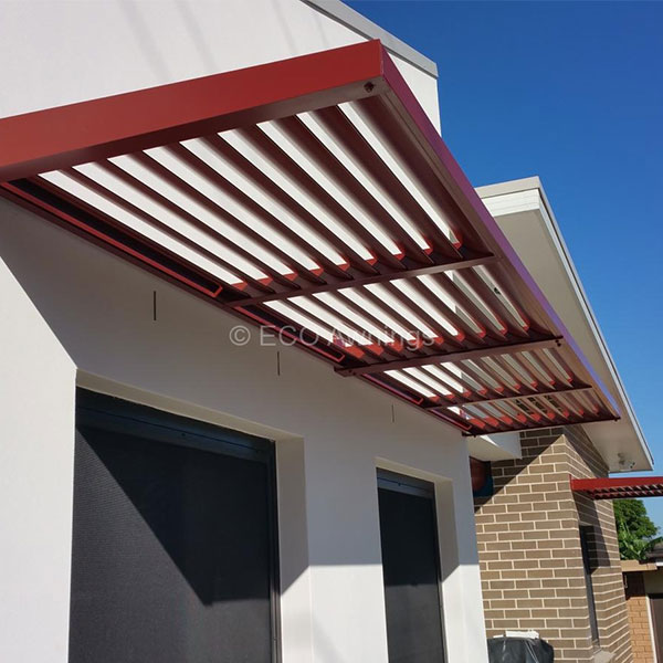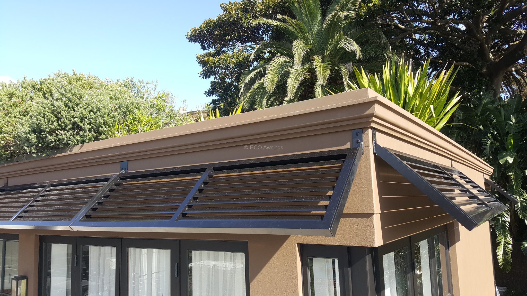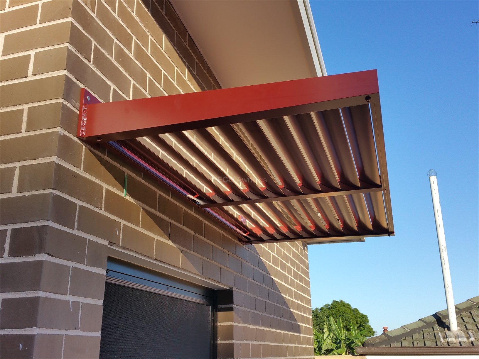 Aluminium cantilever louvres over sliding doors and windows, white powder coat, no front posts, Sydney home