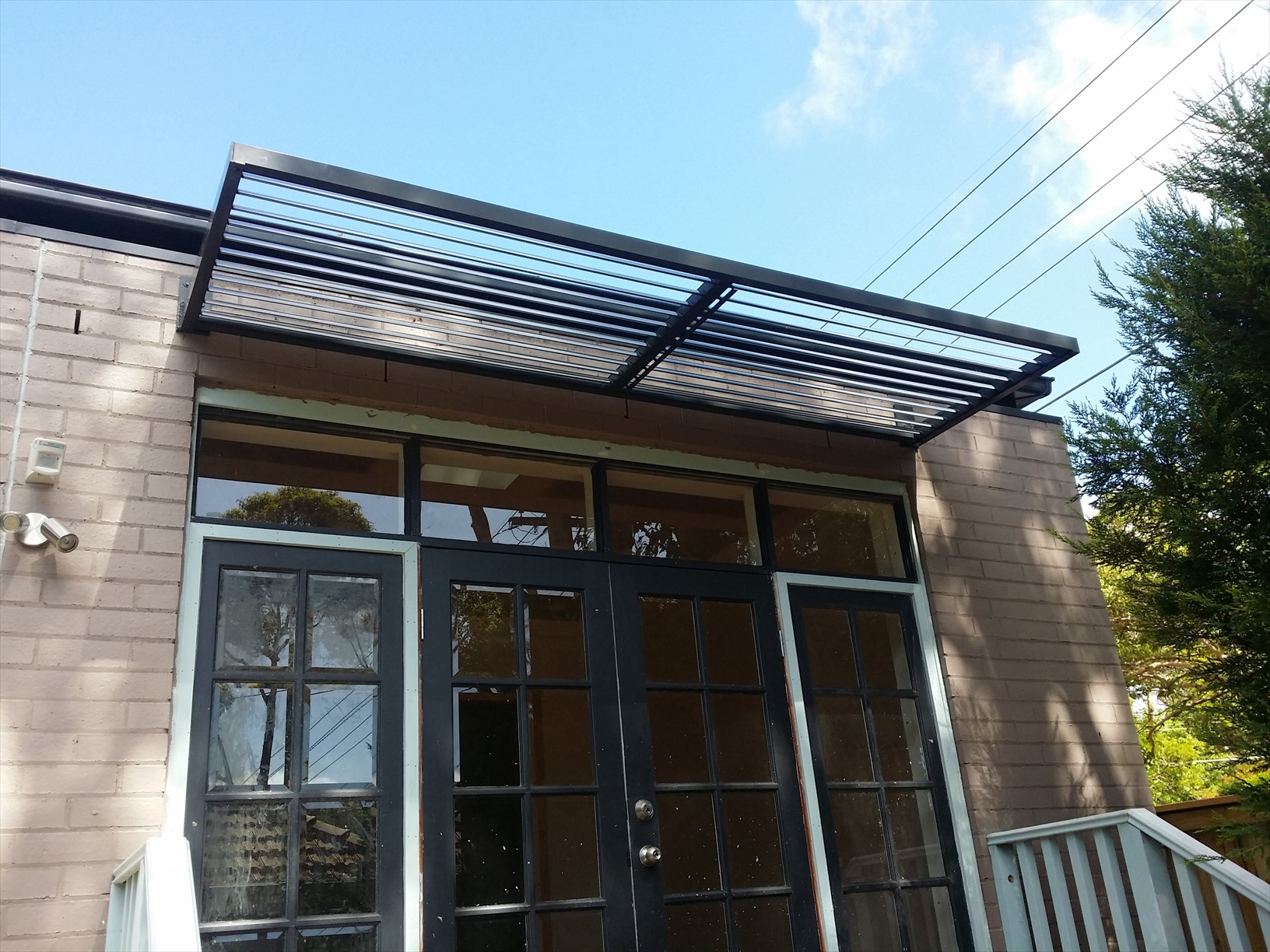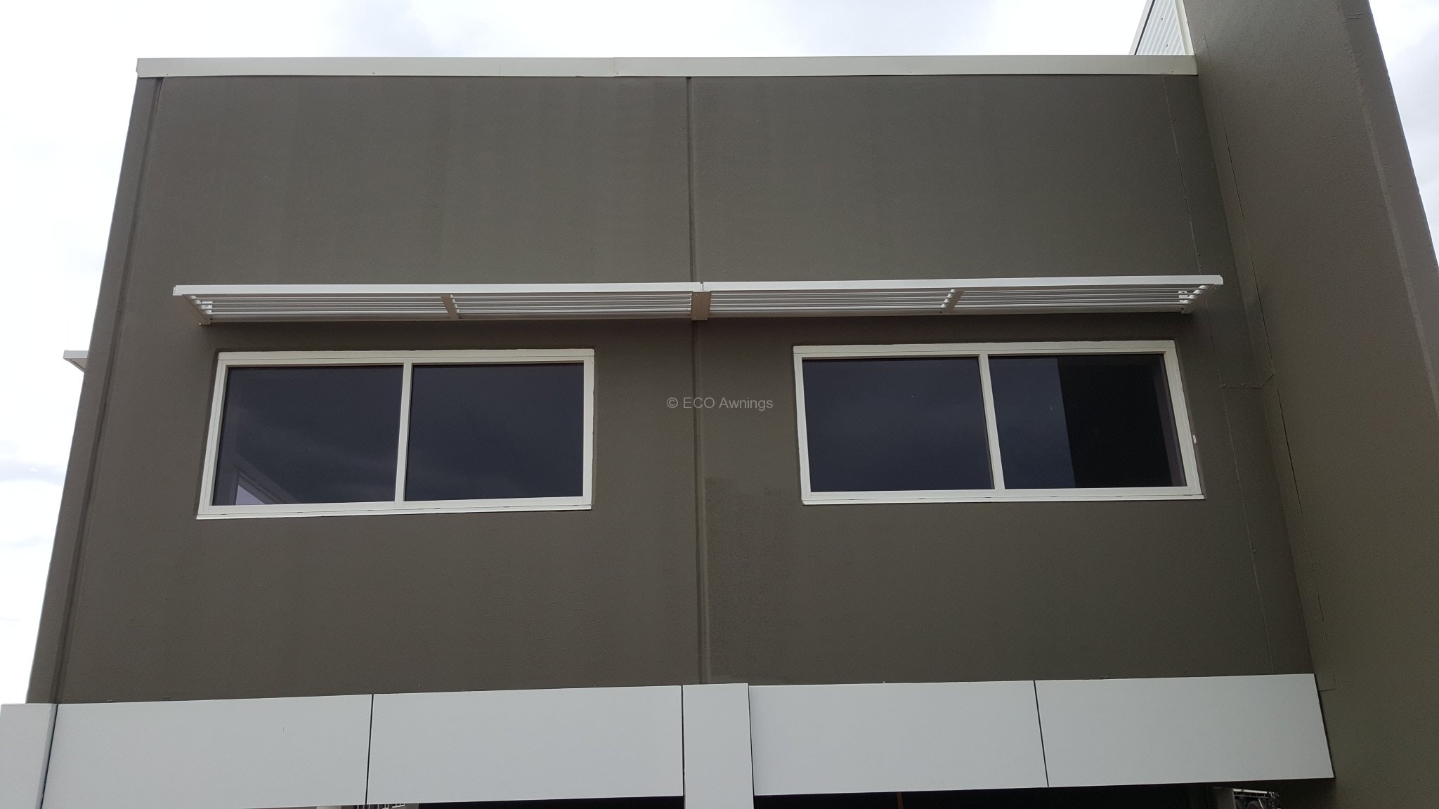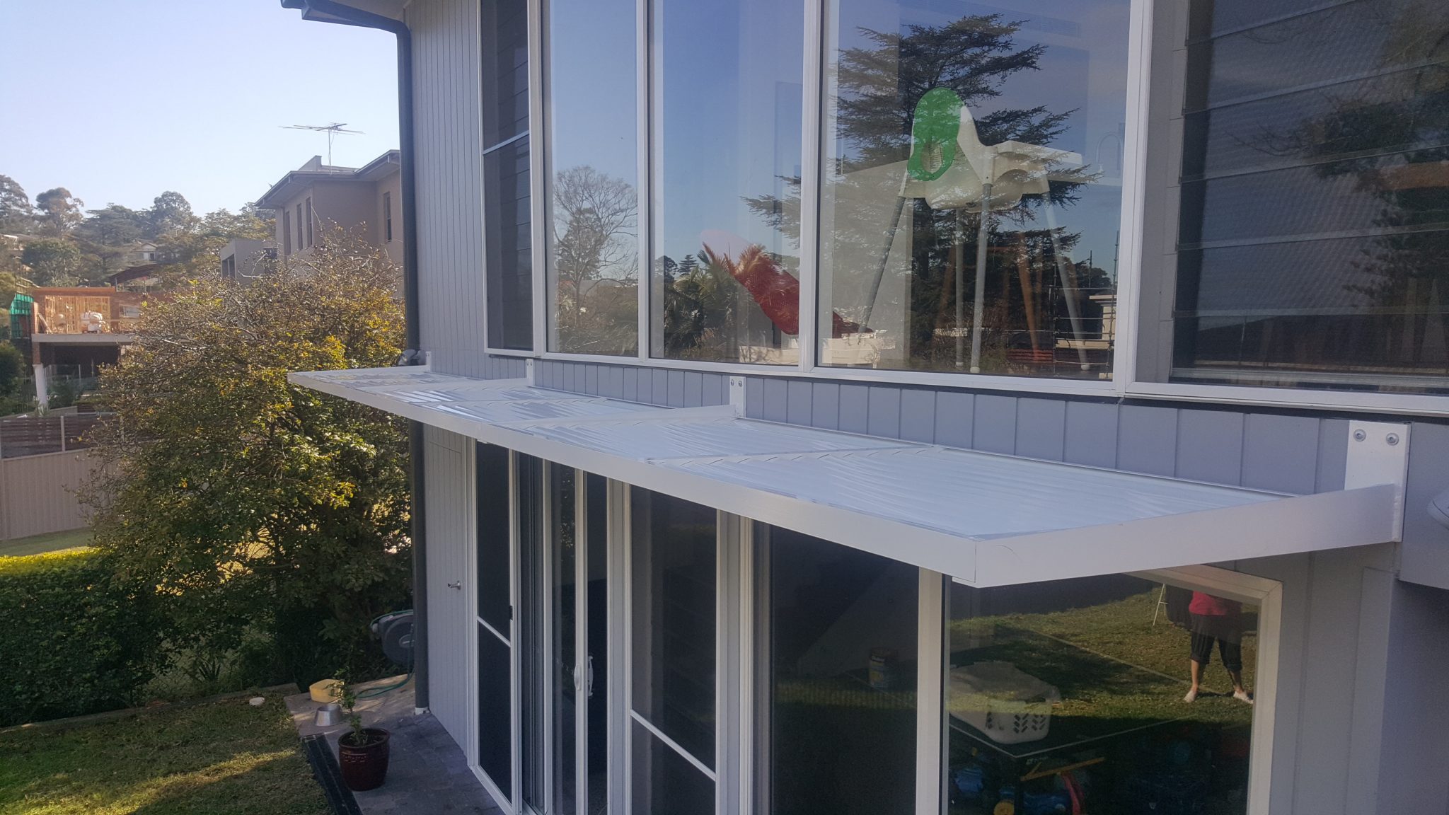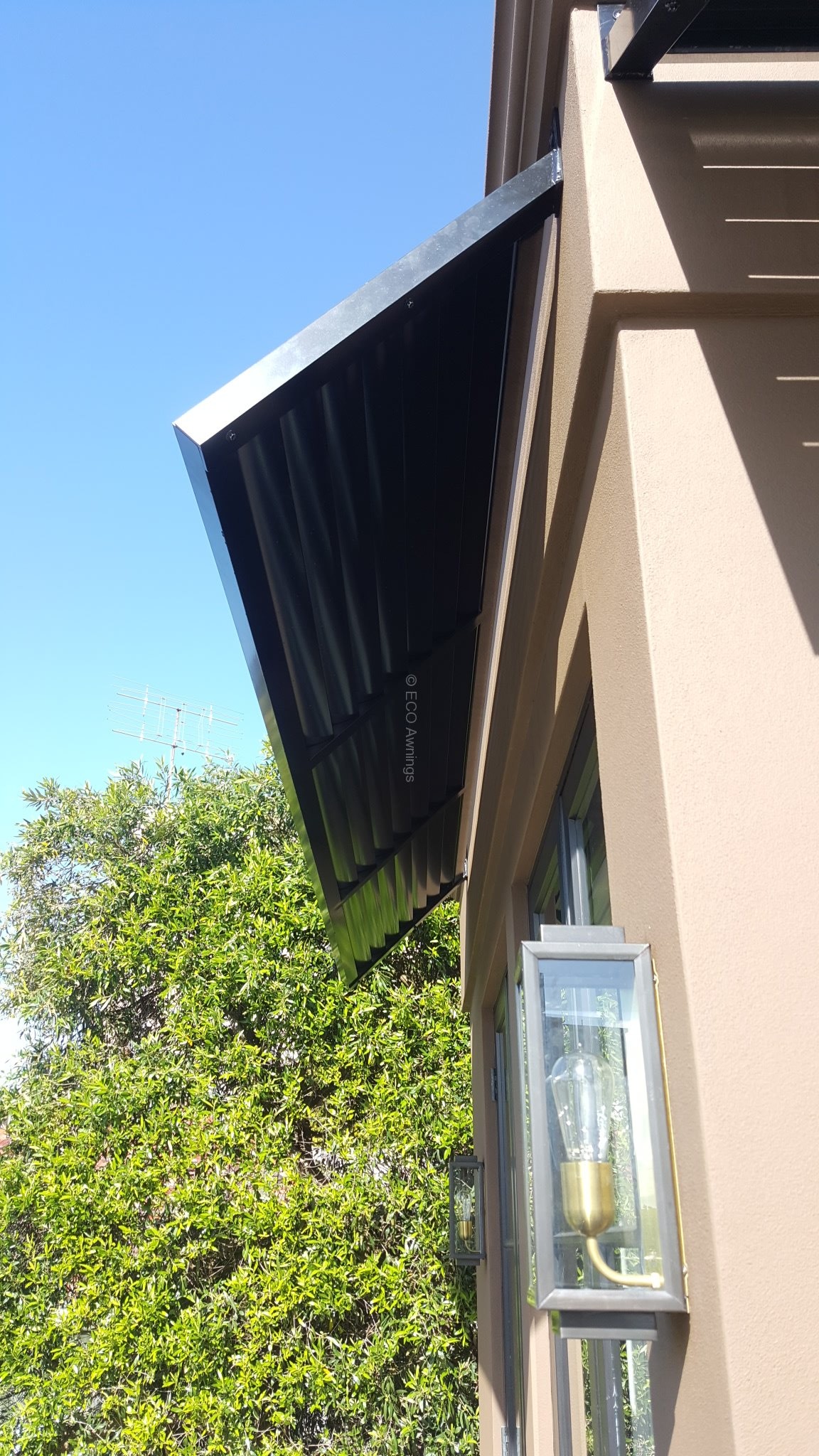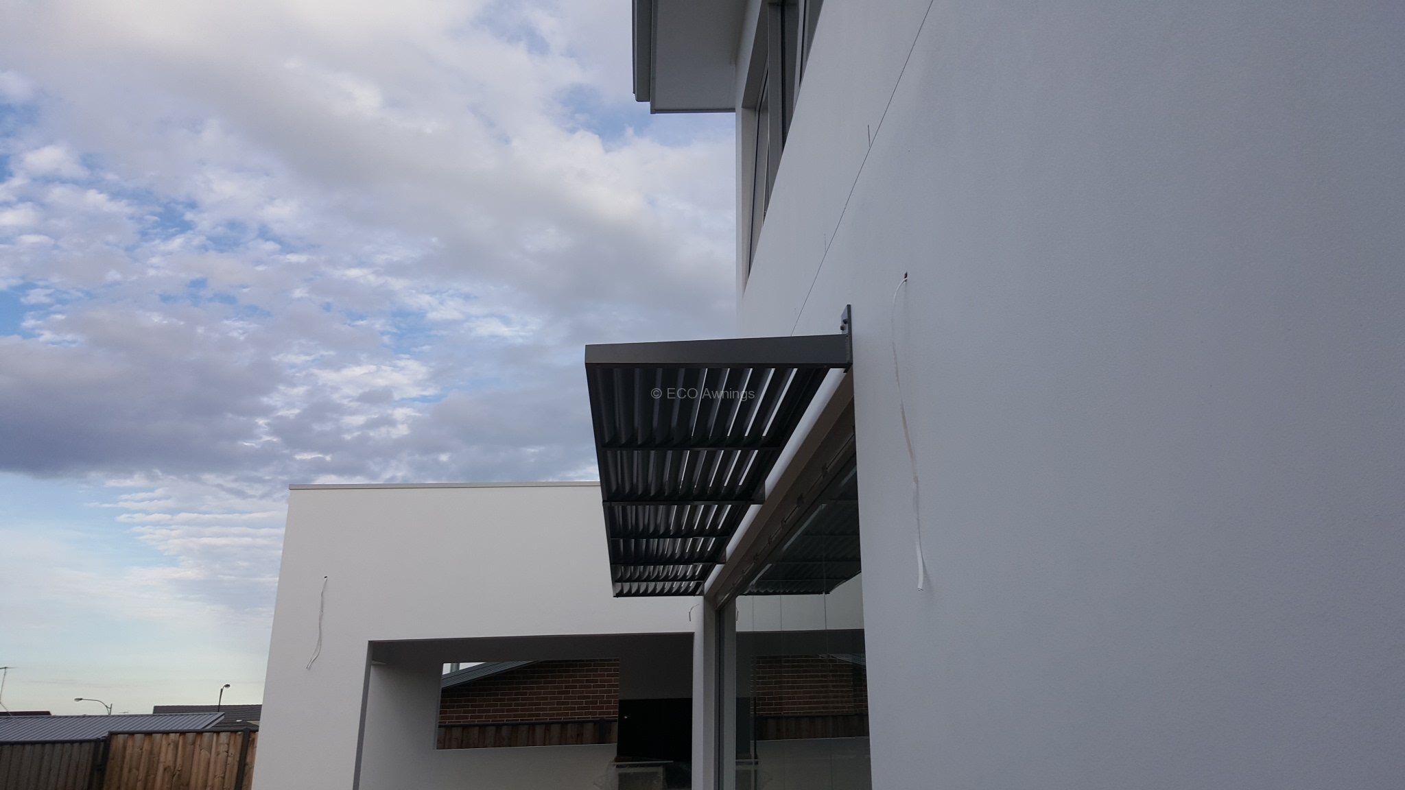 Aluminium cantilever louvres over sliding doors and windows, white powder coat, no front posts, Sydney home