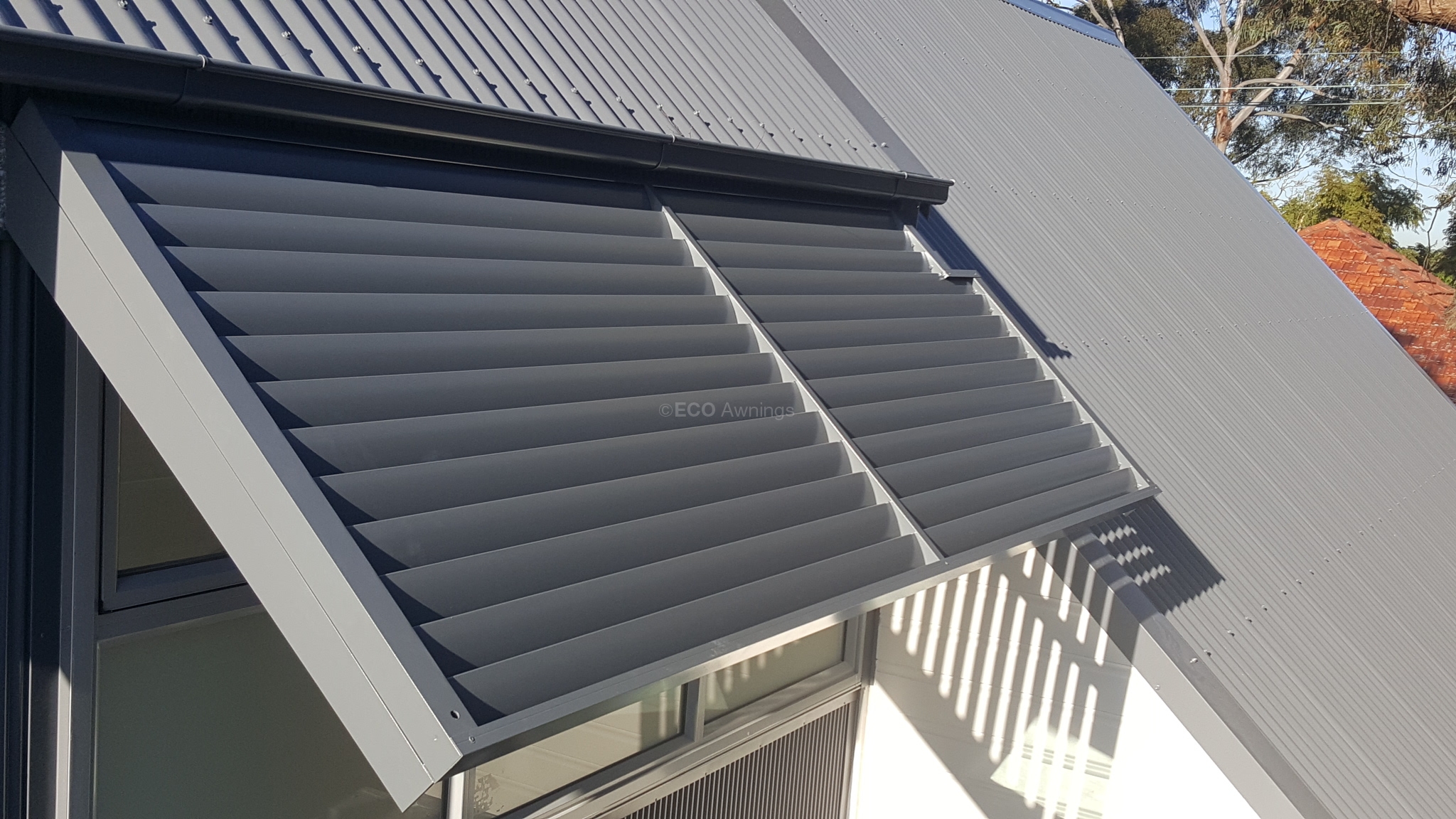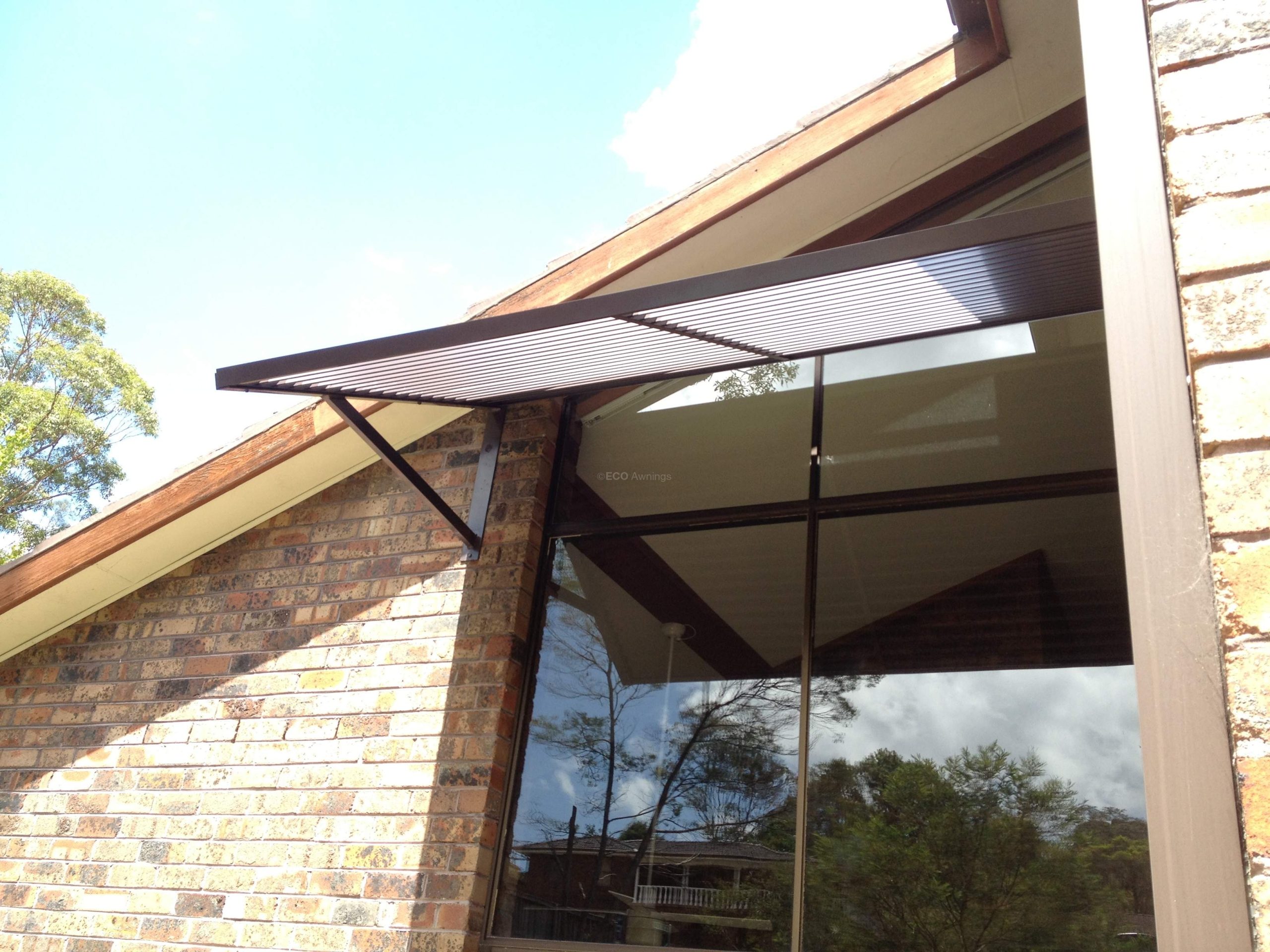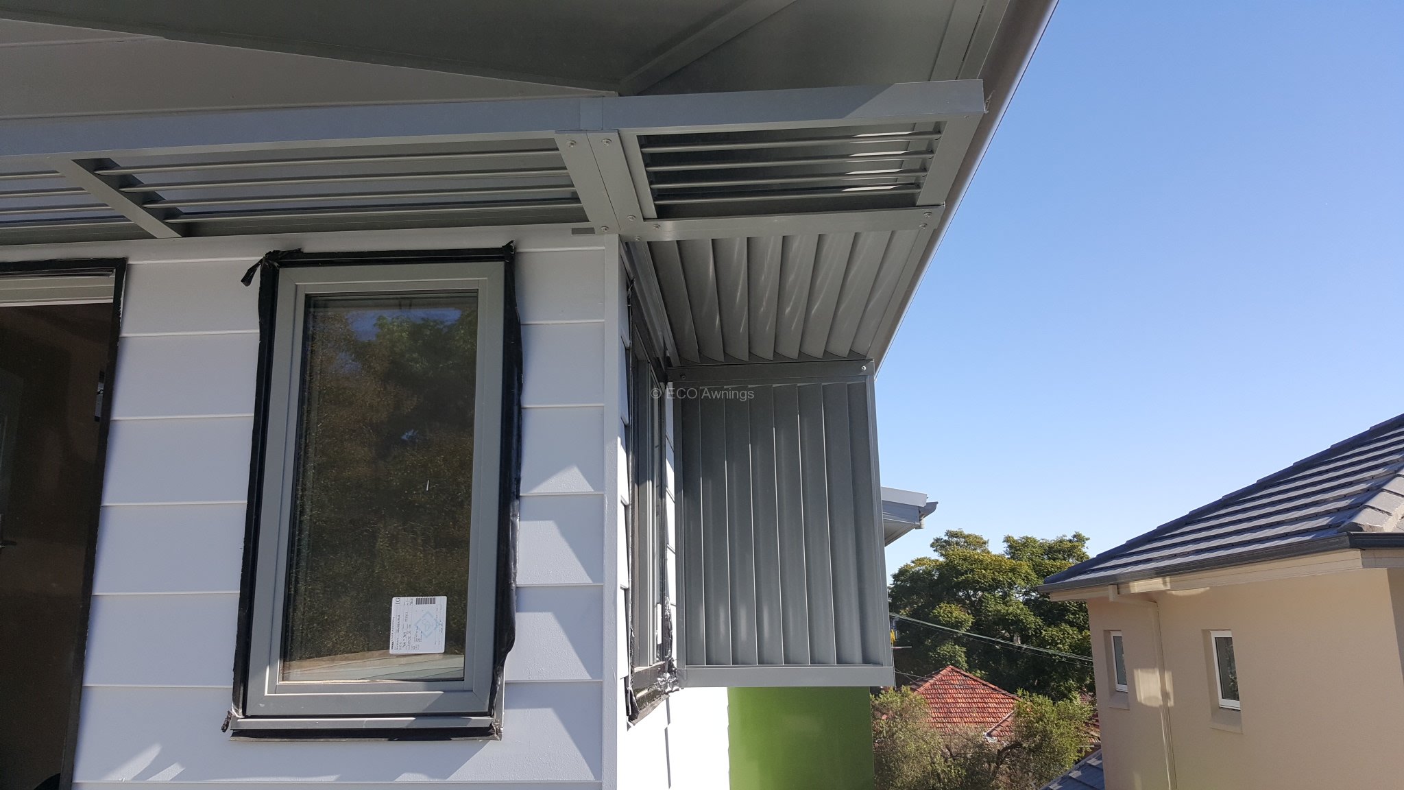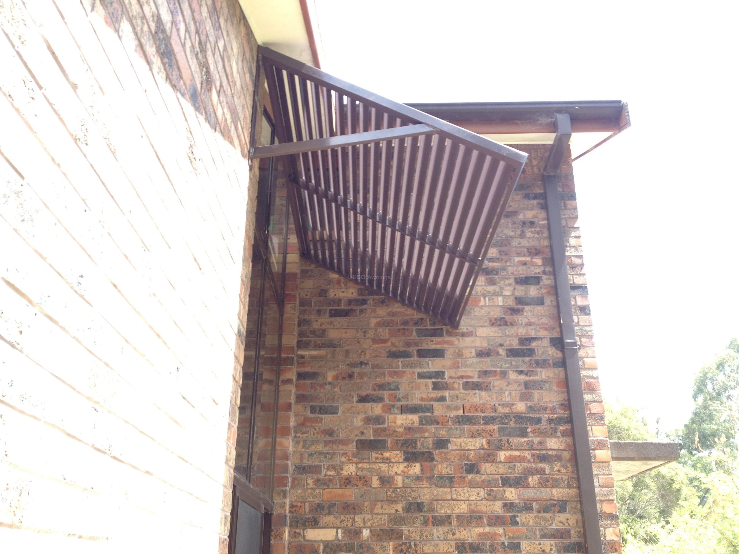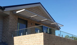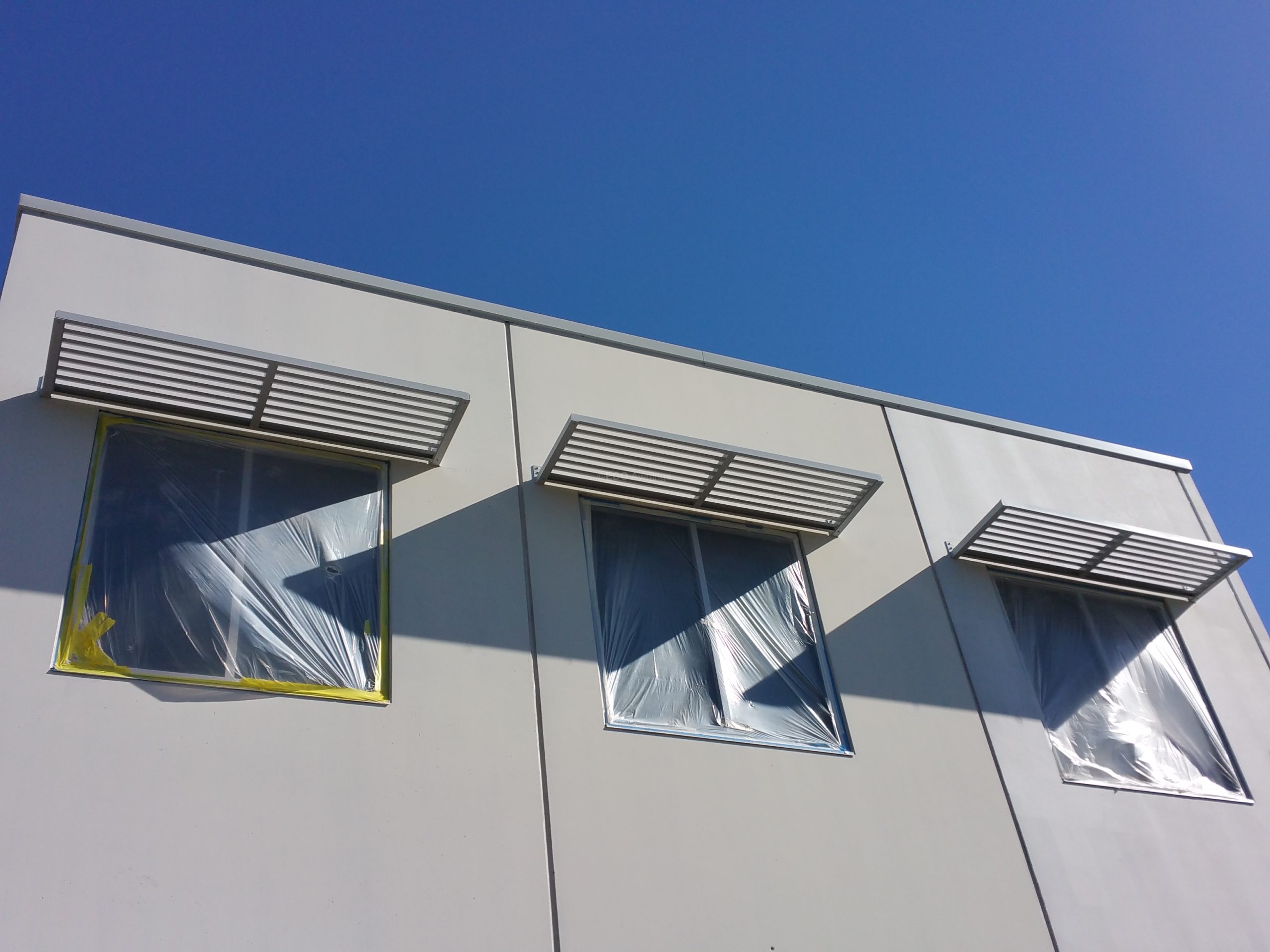 Aluminium cantilever louvres over sliding doors and windows, white powder coat, no front posts, Sydney home