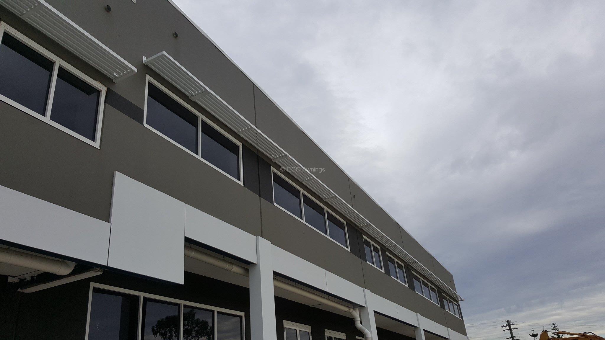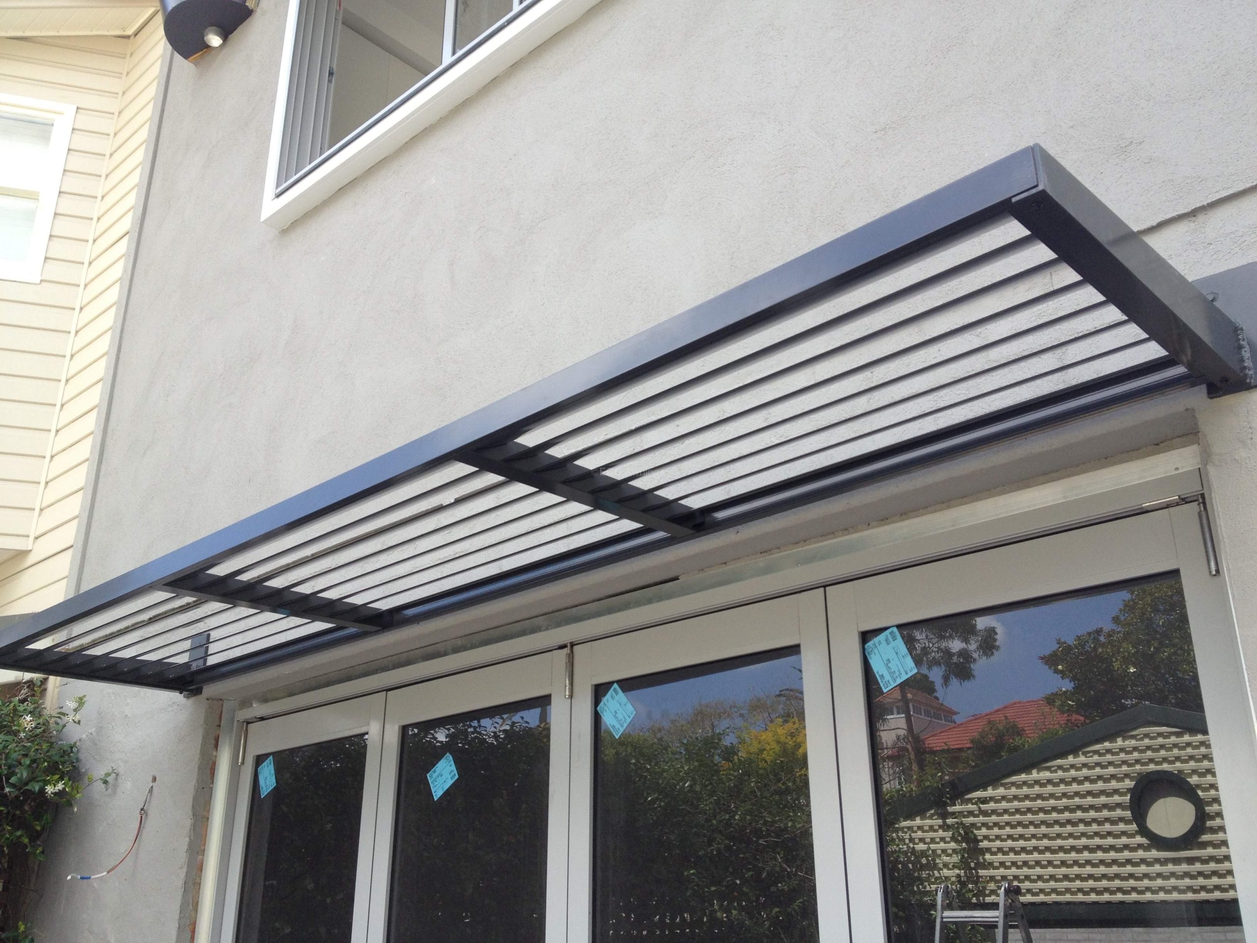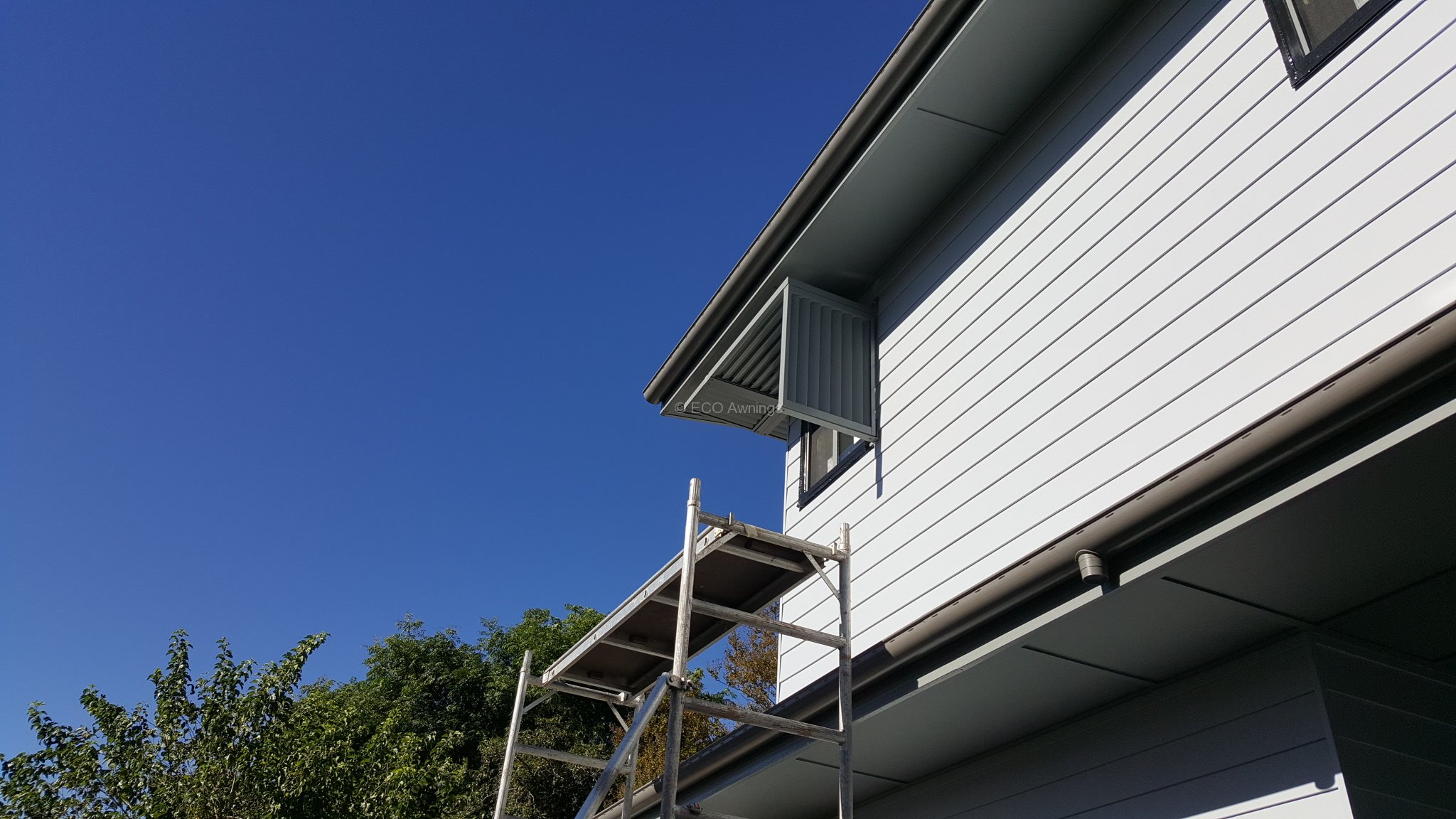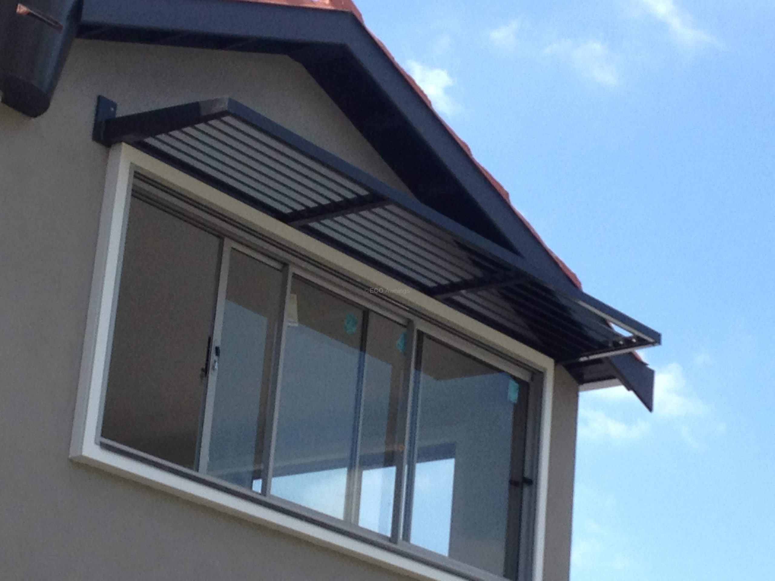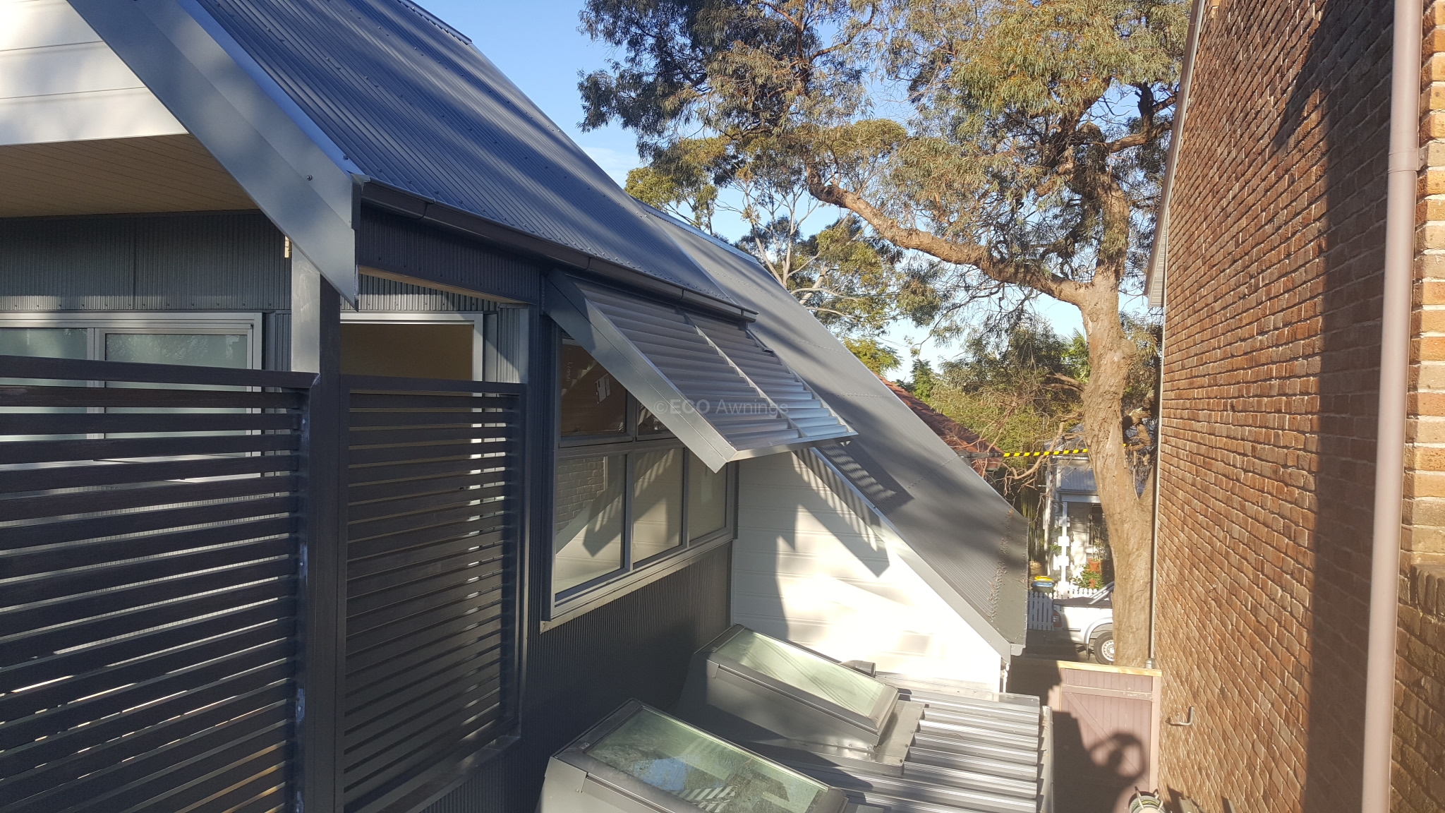 Aluminium cantilever louvres over sliding doors and windows, white powder coat, no front posts, Sydney home