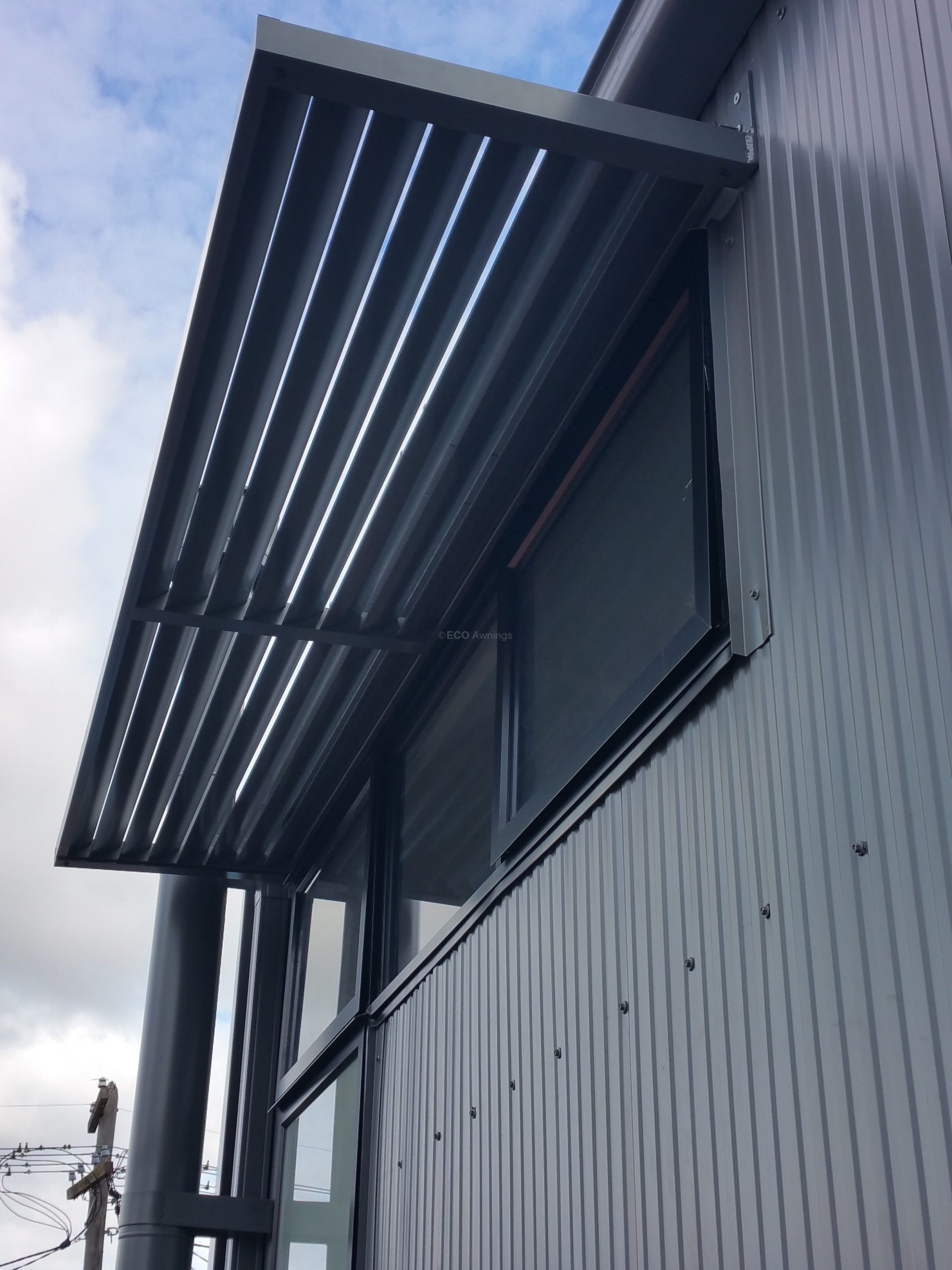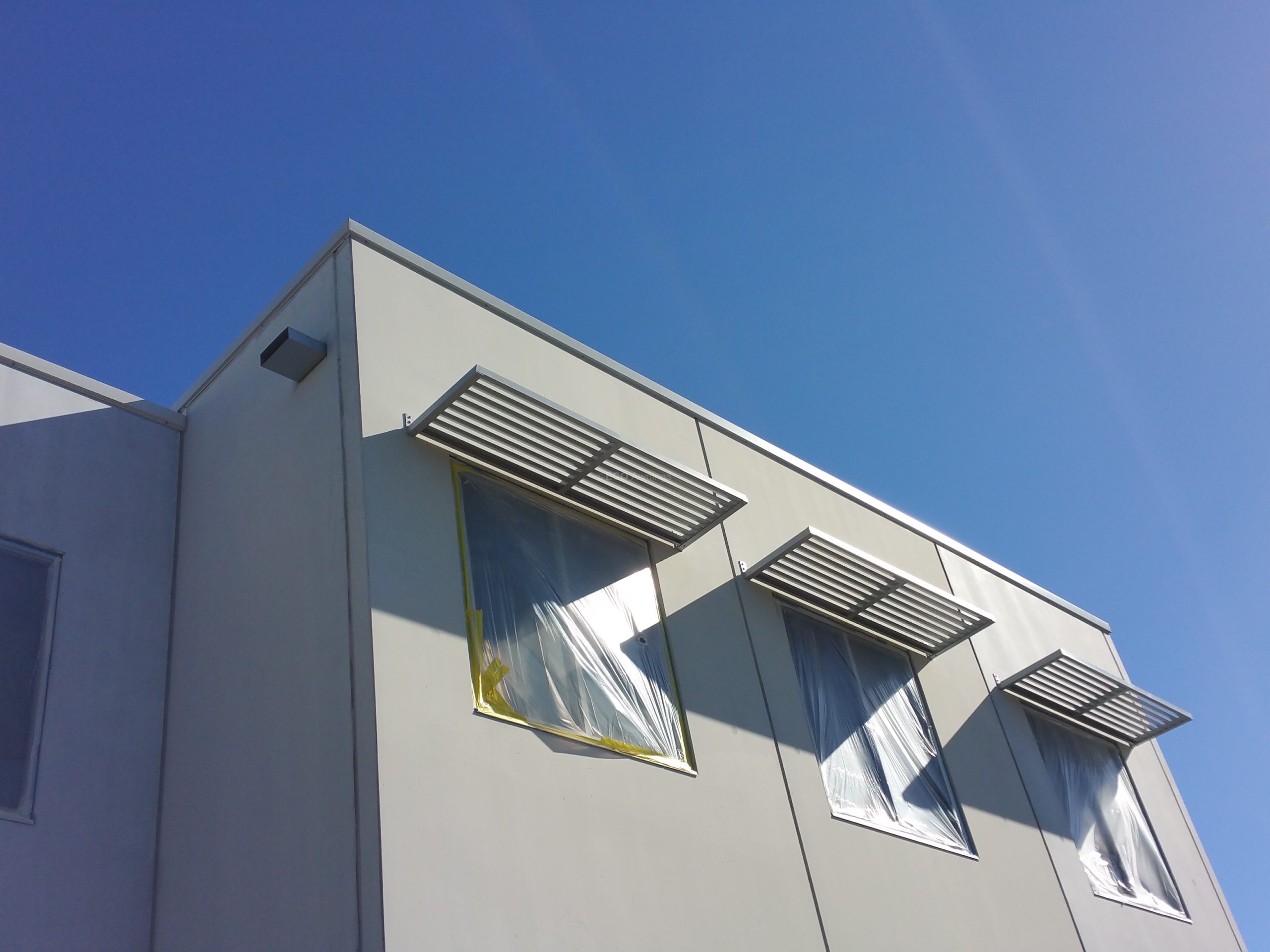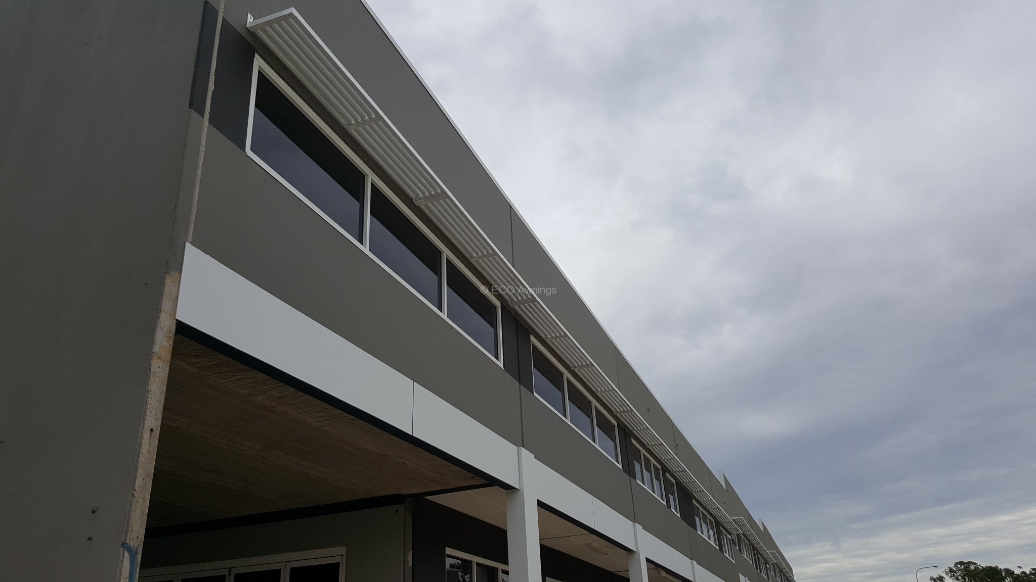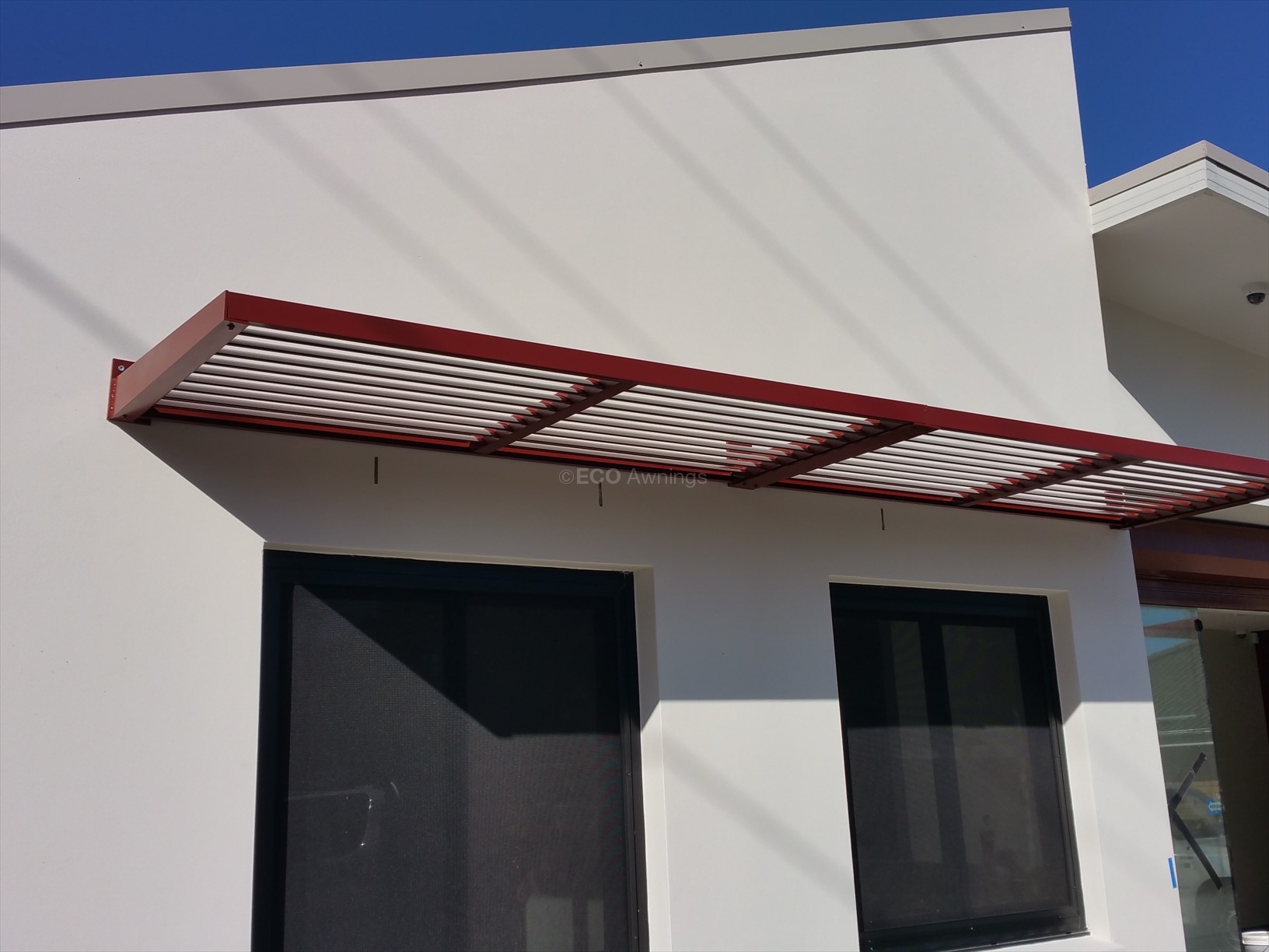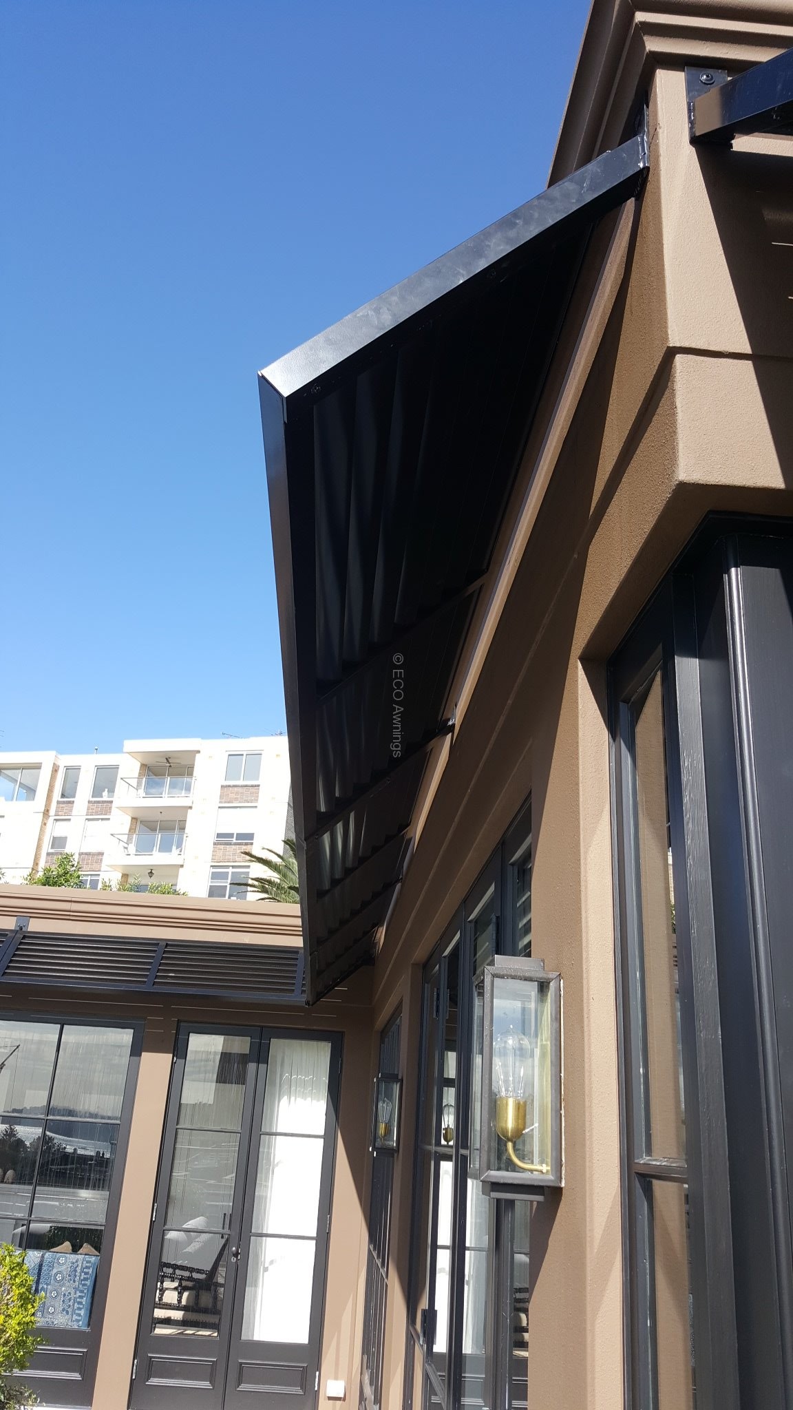 Aluminium cantilever louvres over sliding doors and windows, white powder coat, no front posts, Sydney home