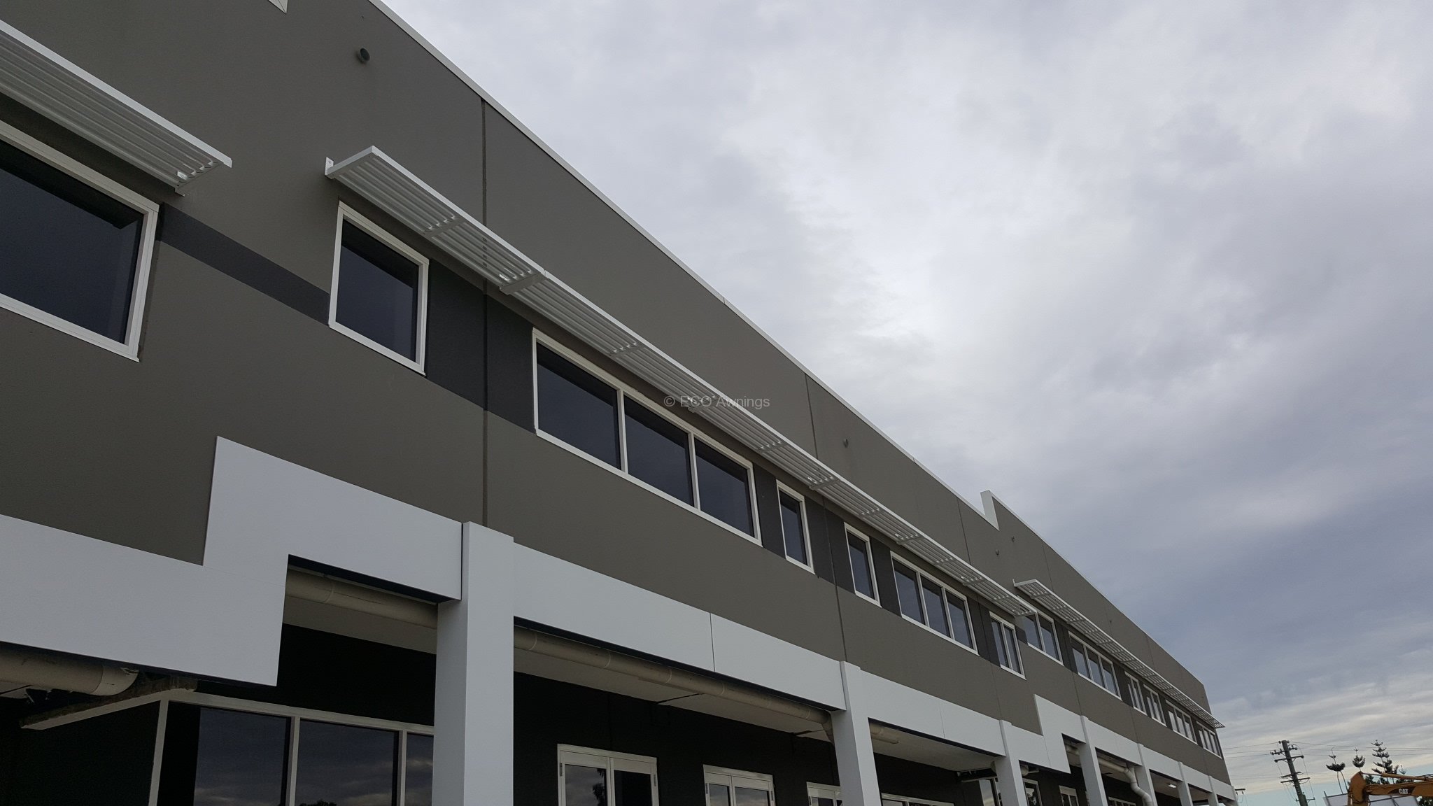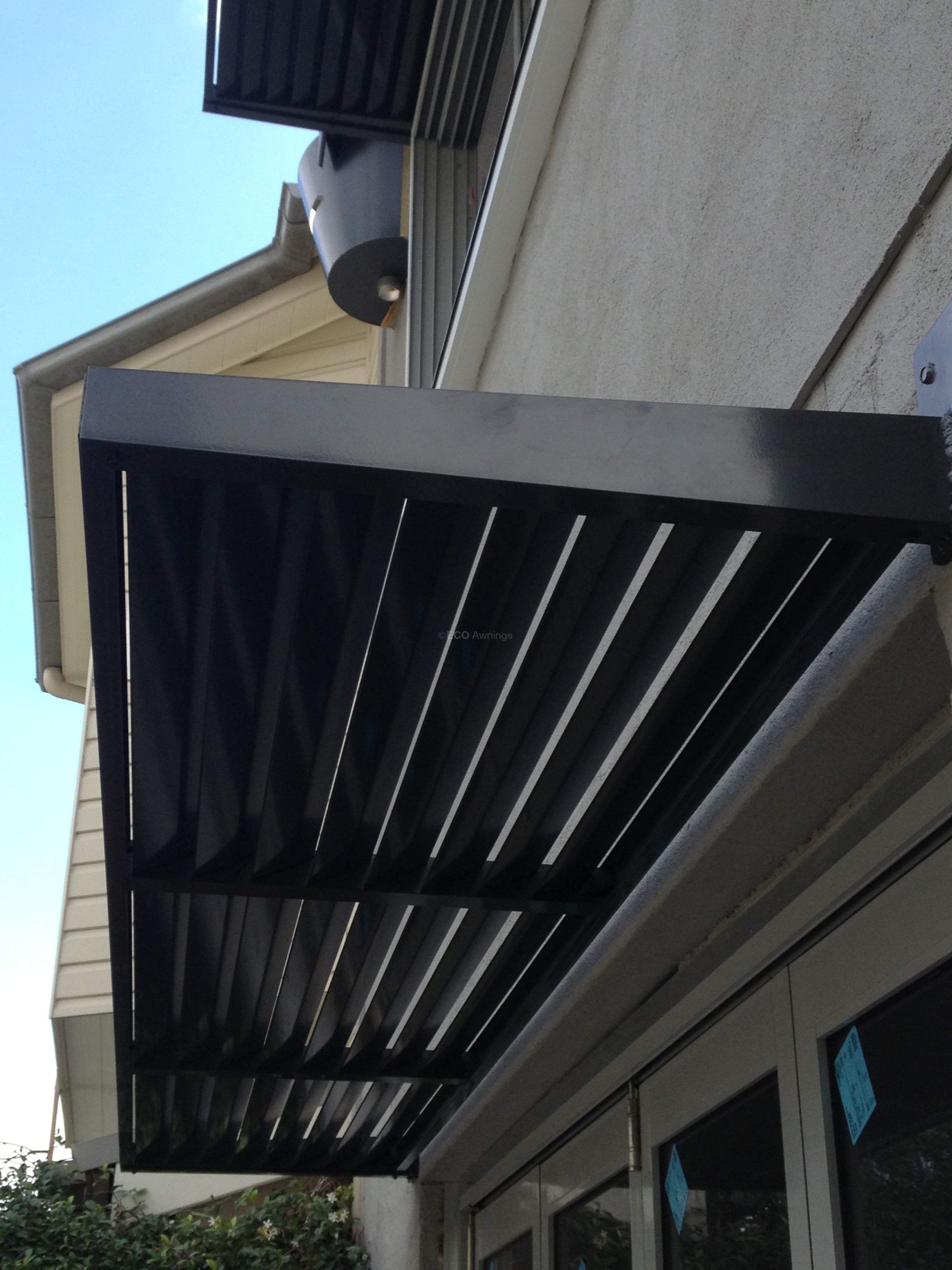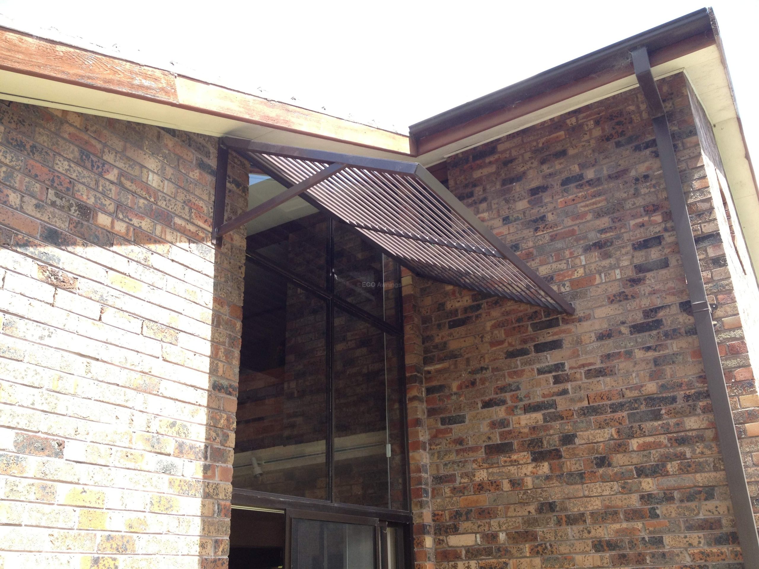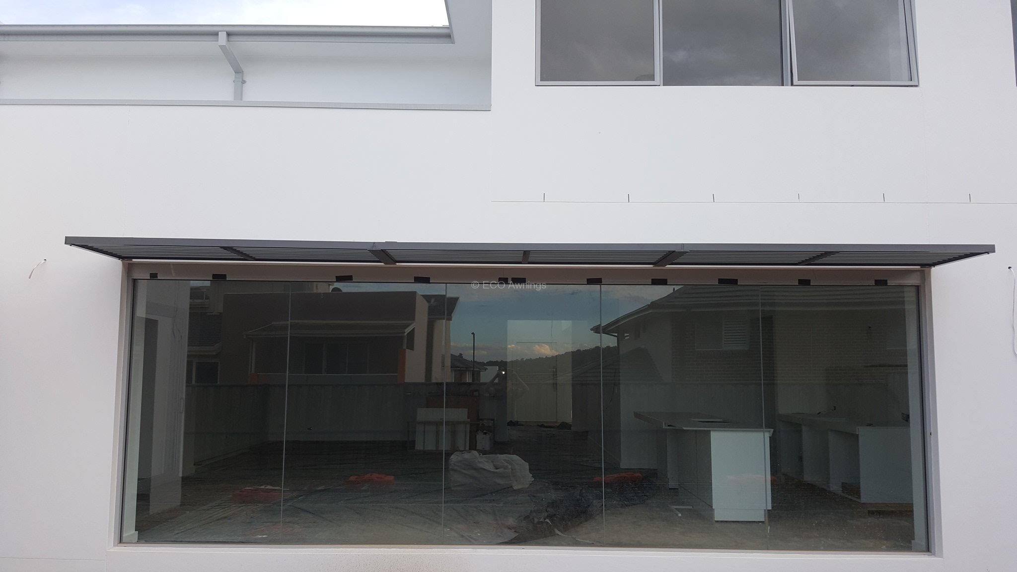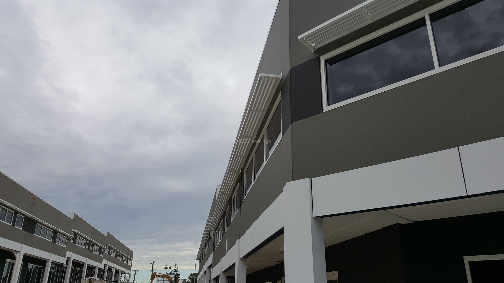 Aluminium cantilever louvres over sliding doors and windows, white powder coat, no front posts, Sydney home