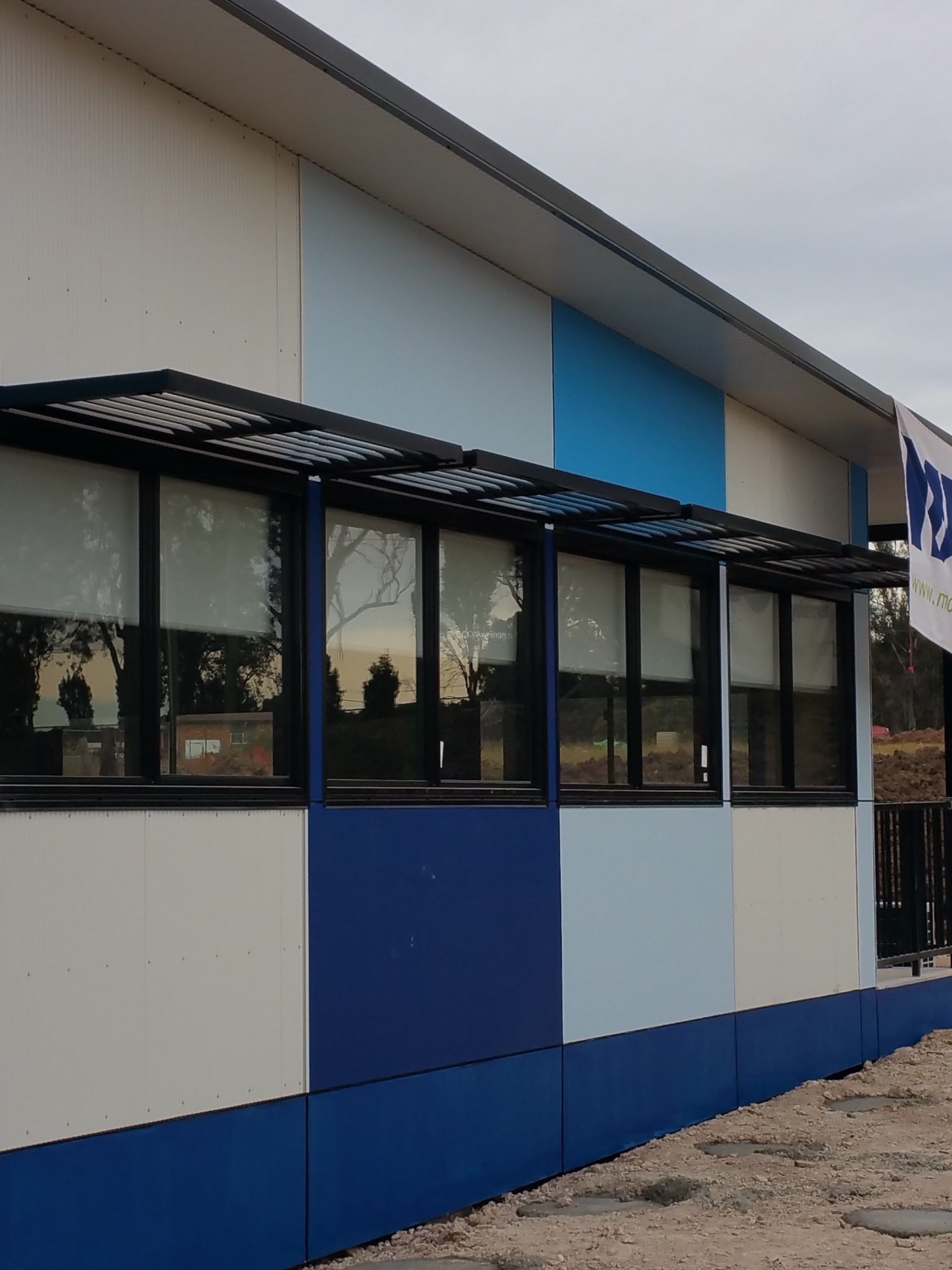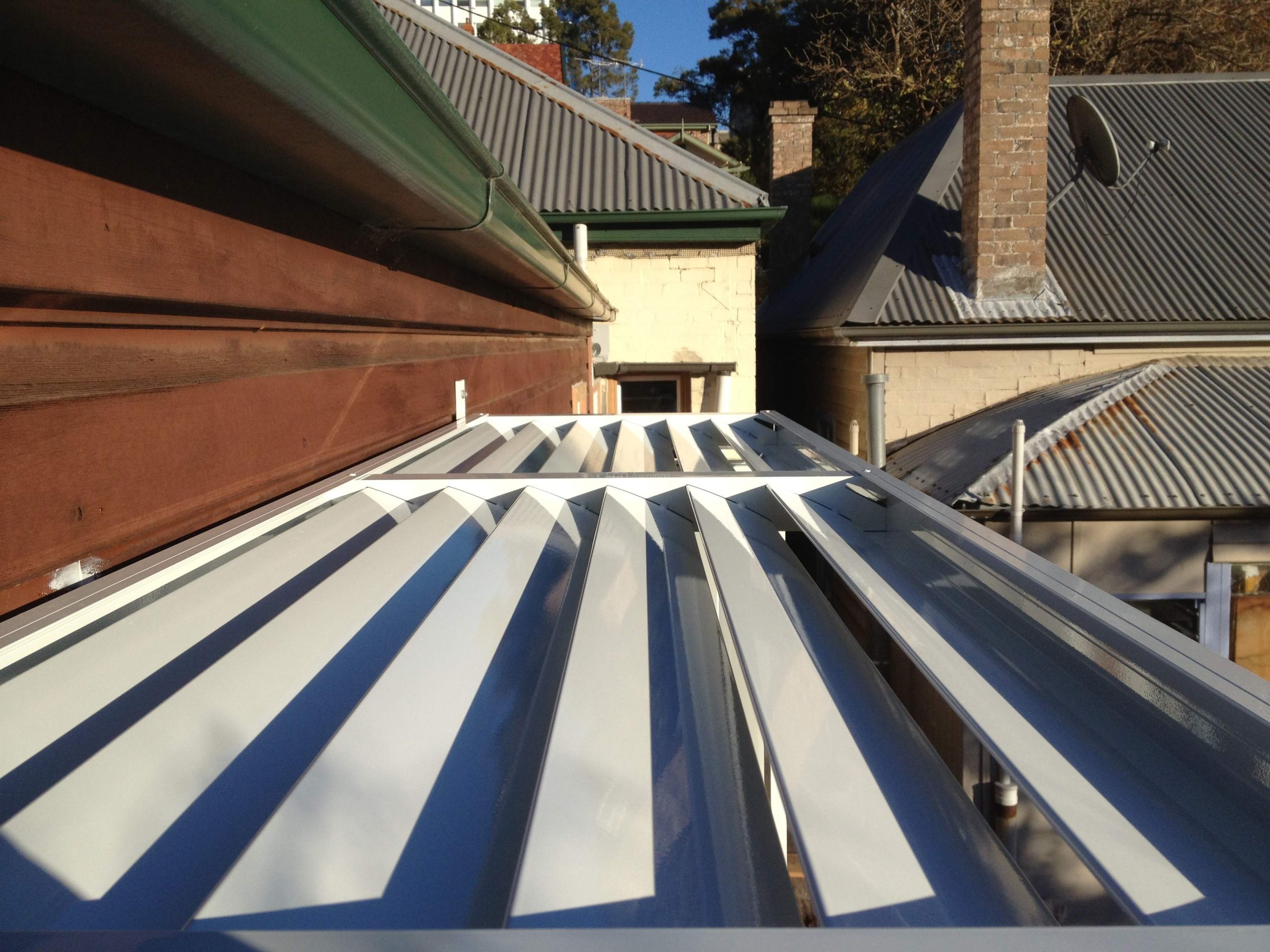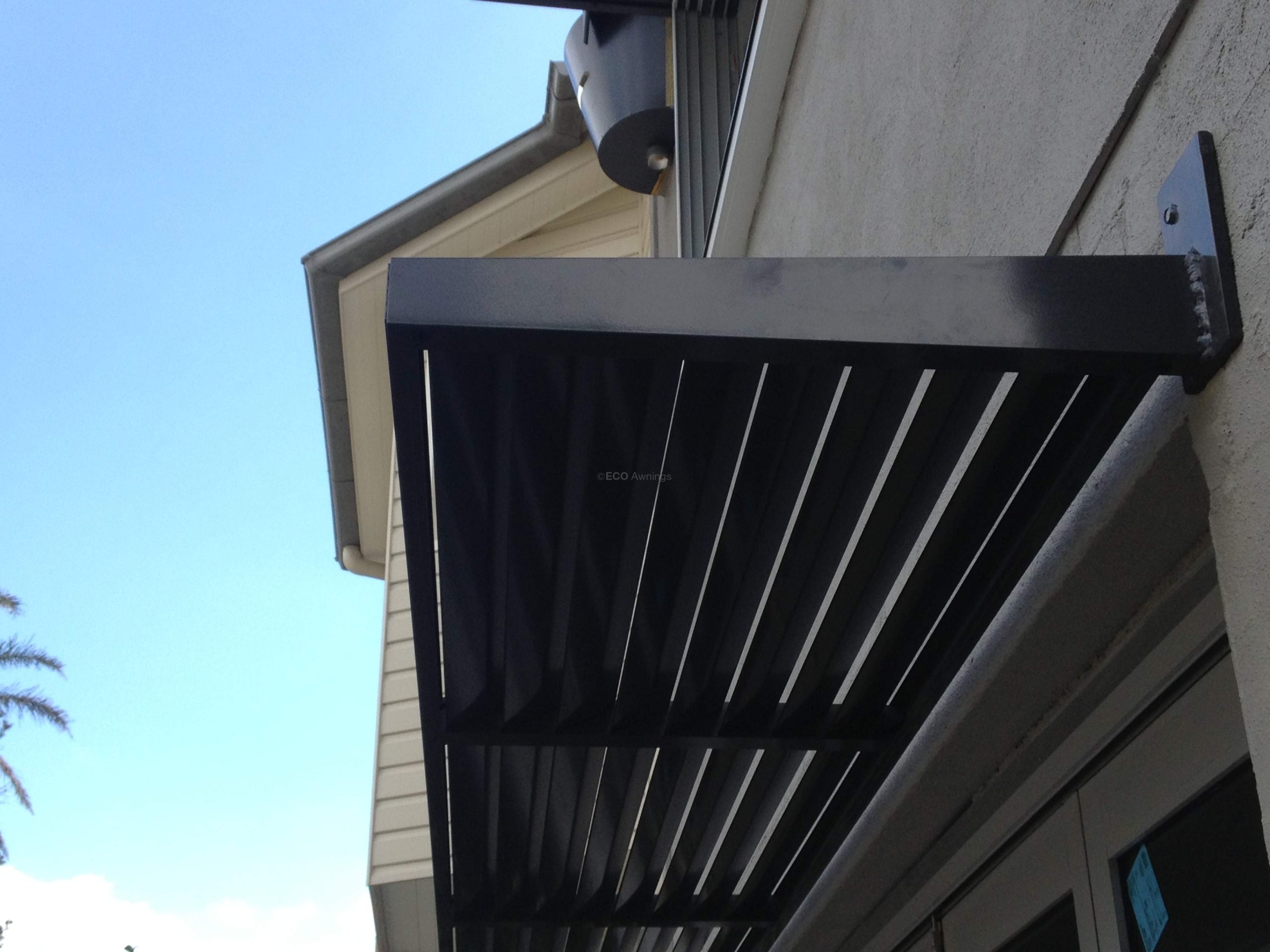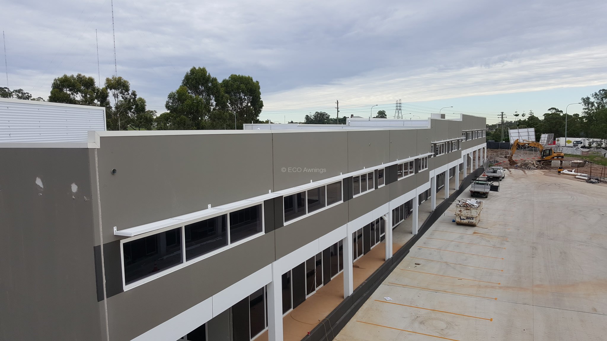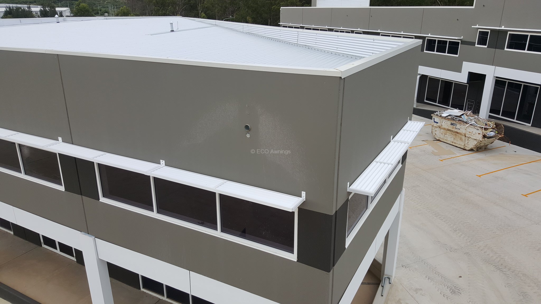 Aluminium cantilever louvres over sliding doors and windows, white powder coat, no front posts, Sydney home