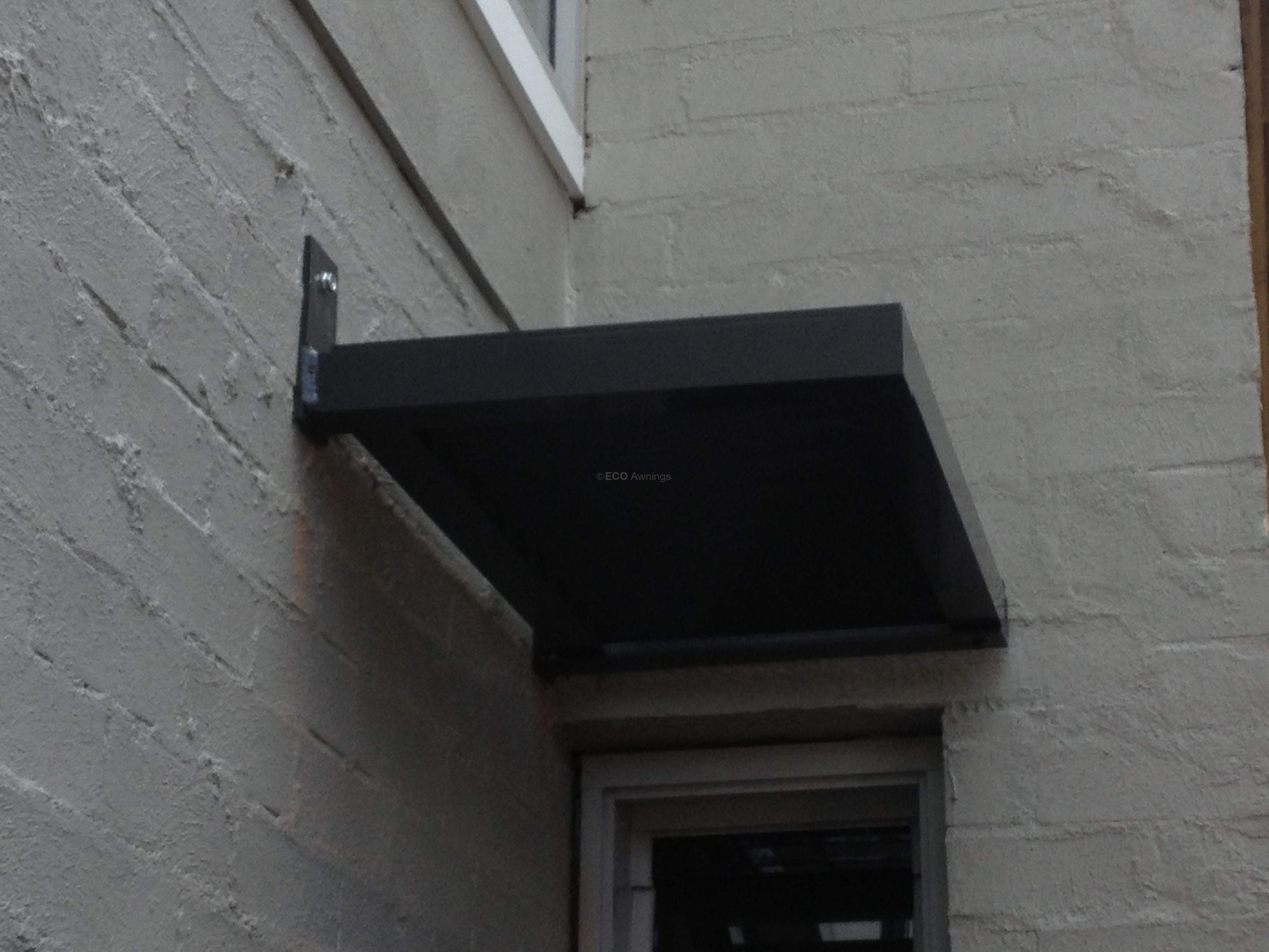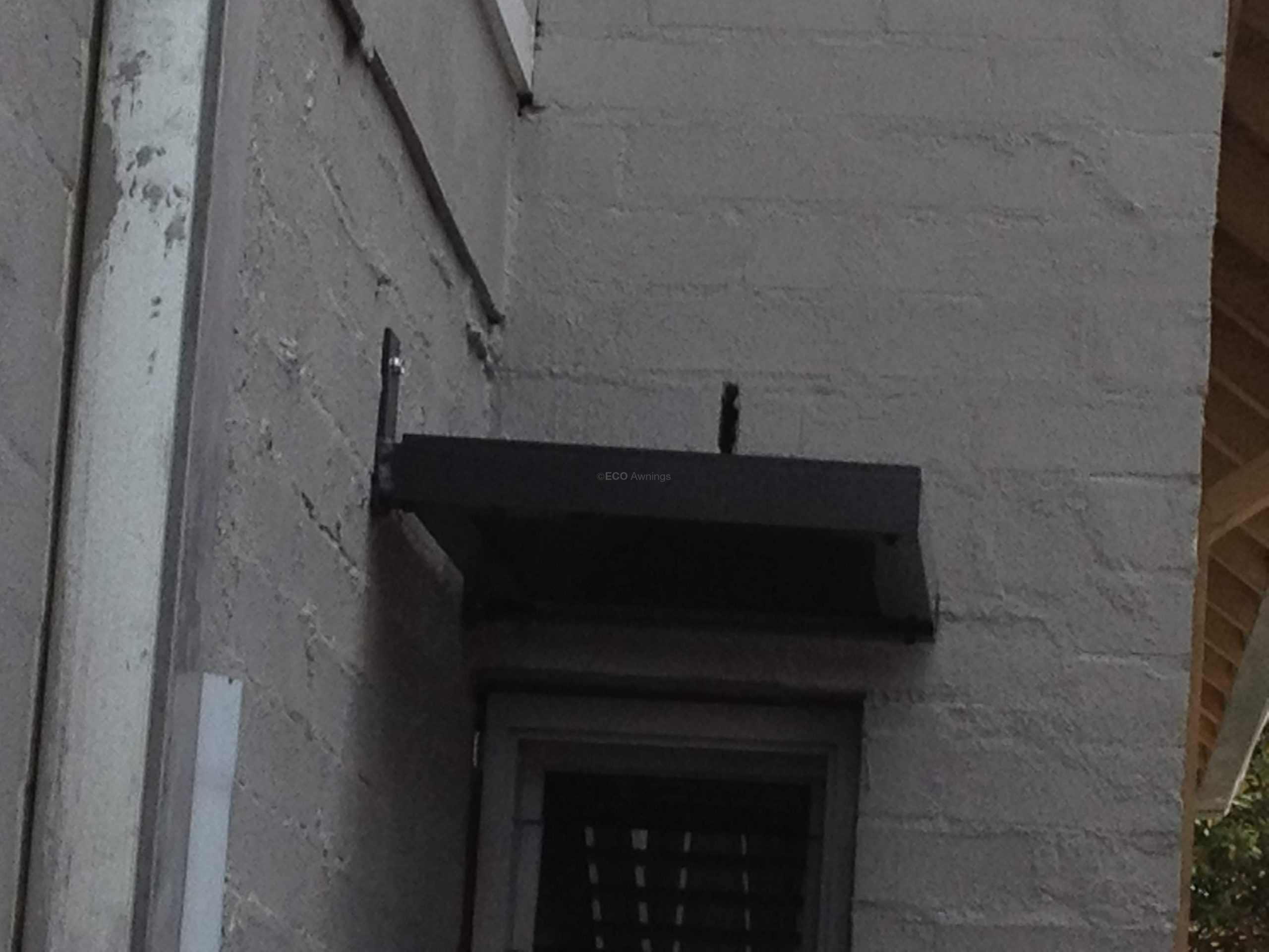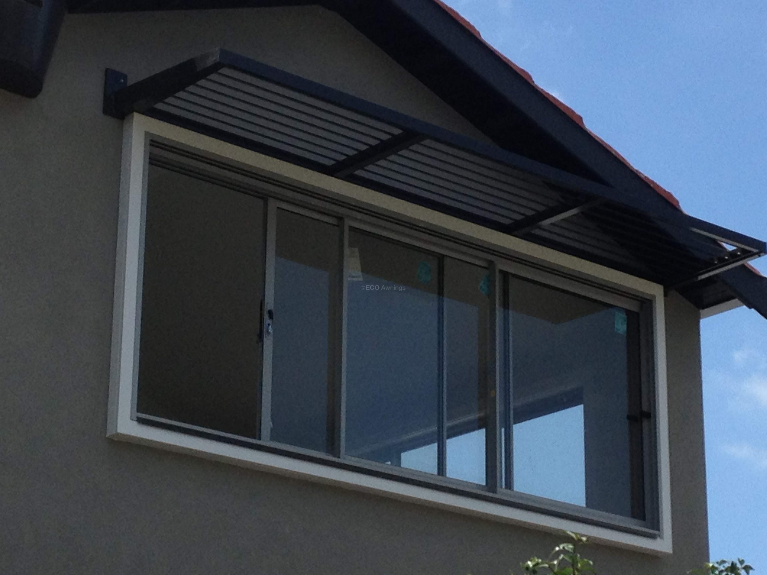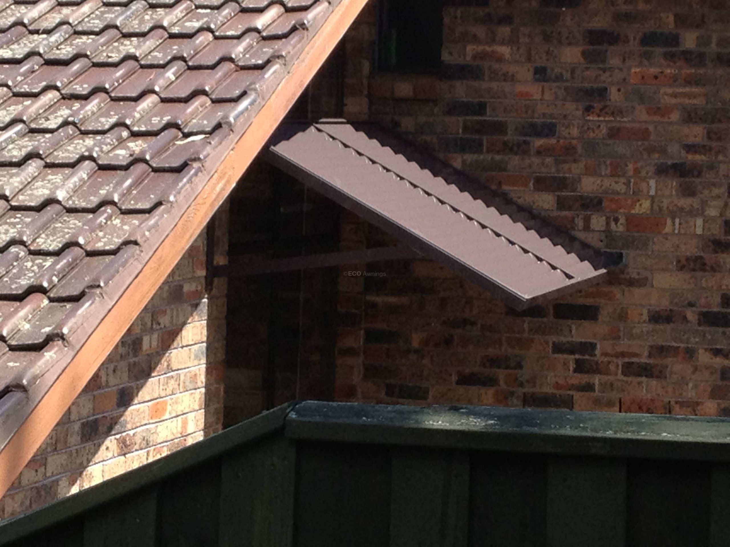 Slimline 50 under-eave awning with polycarbonate roof and front posts, dark grey frame, large span on Sydney brick home