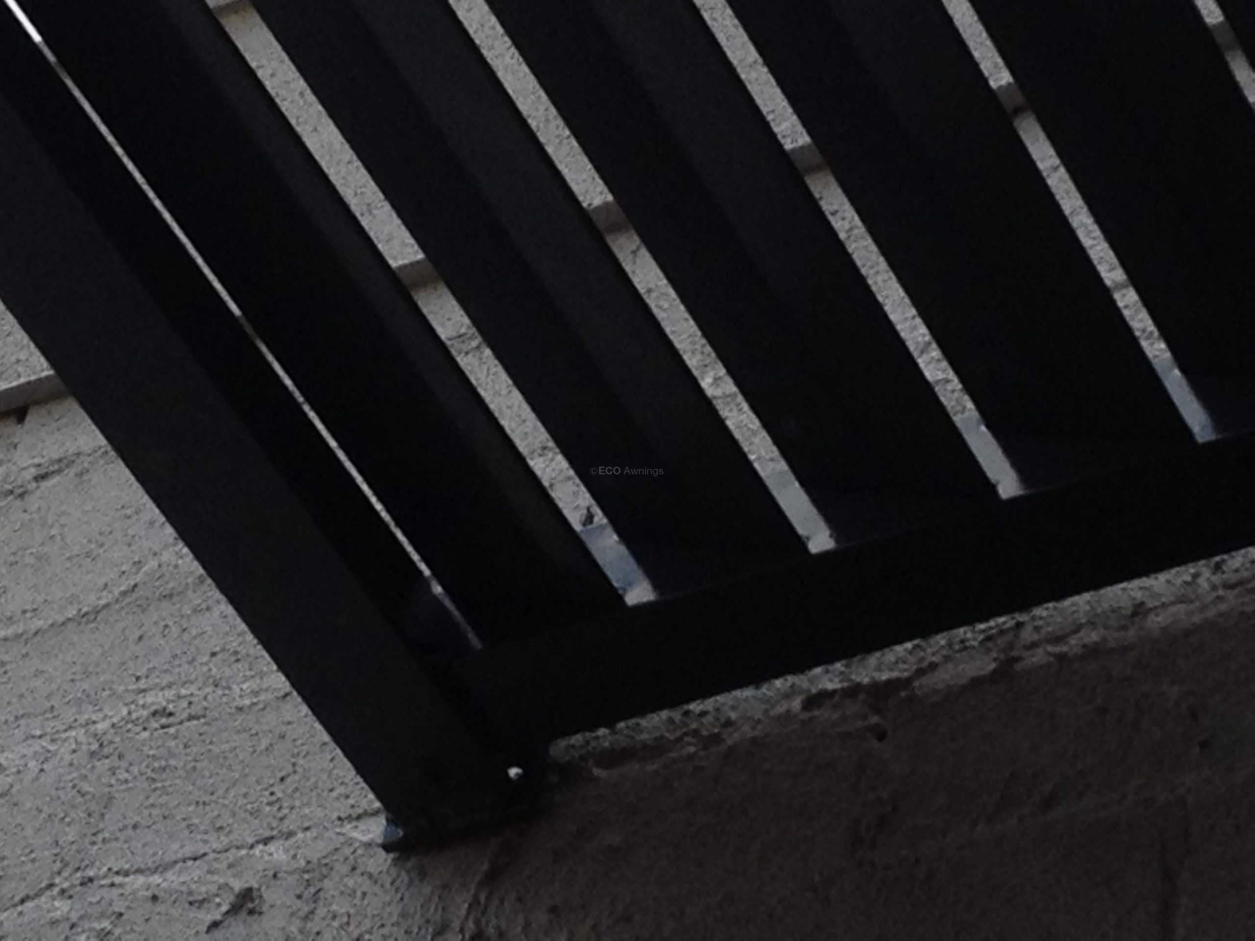 Aluminium sliding louvres on apartment balcony, three dark grey panels on top-hung track, Sydney