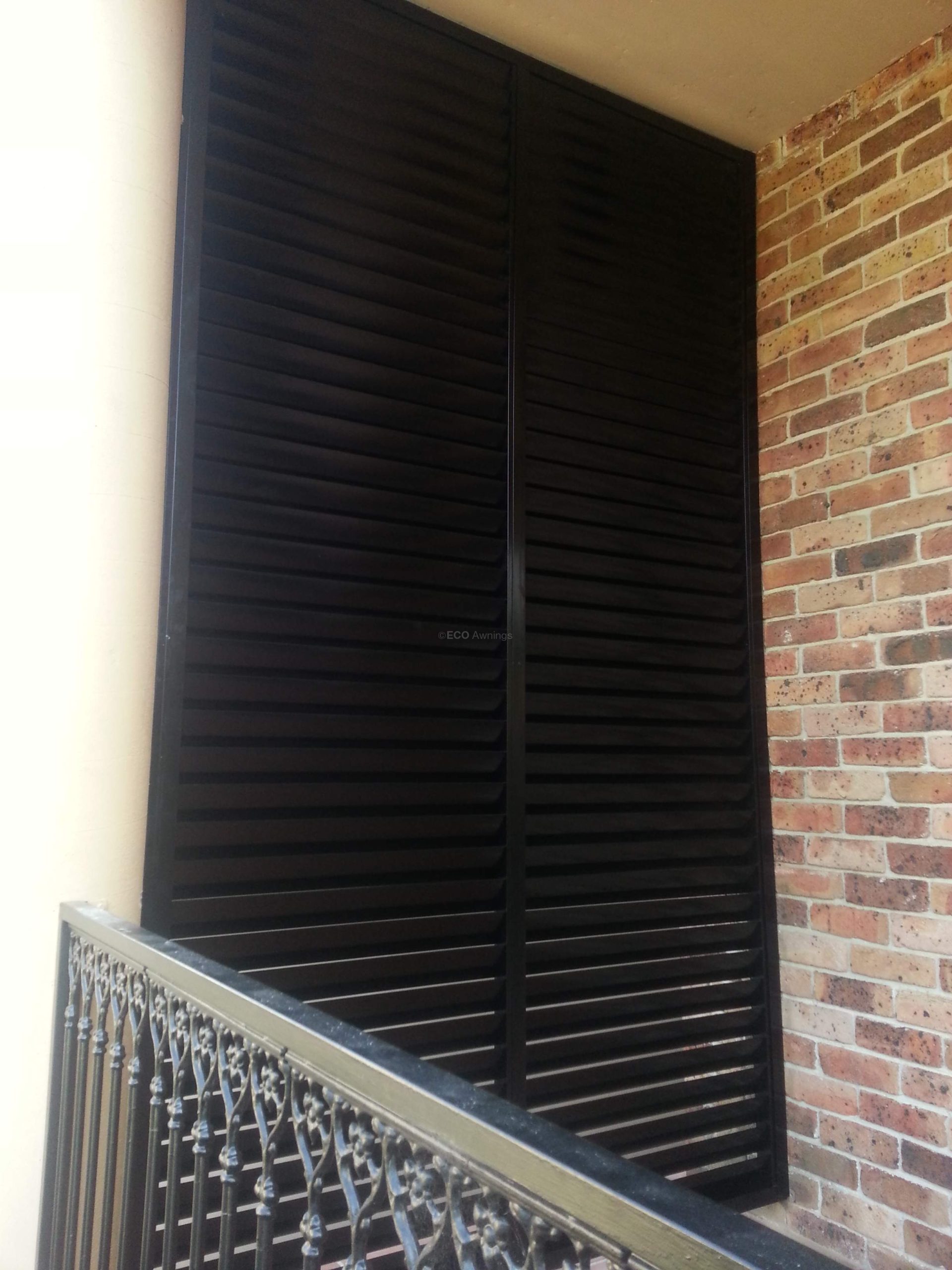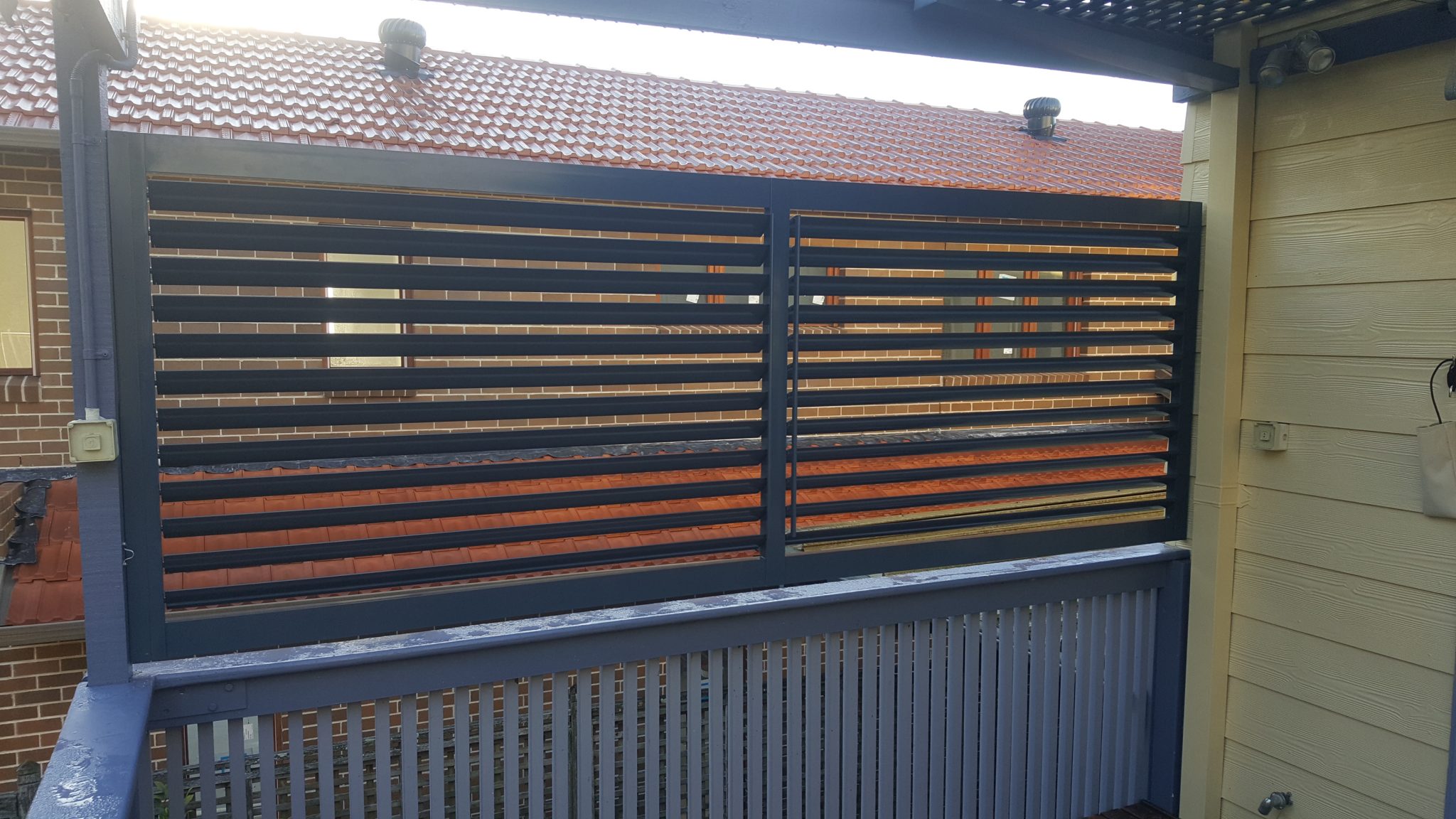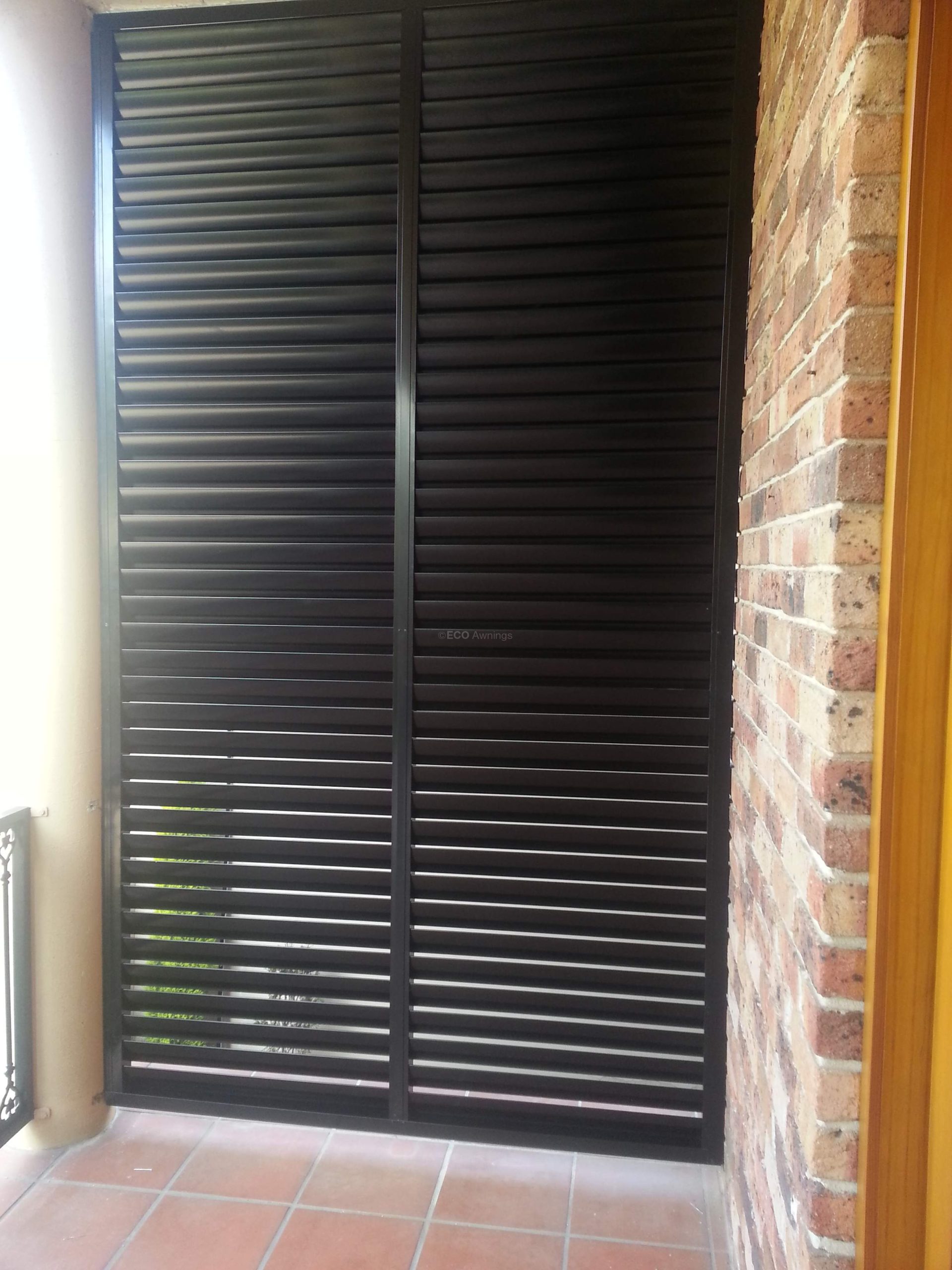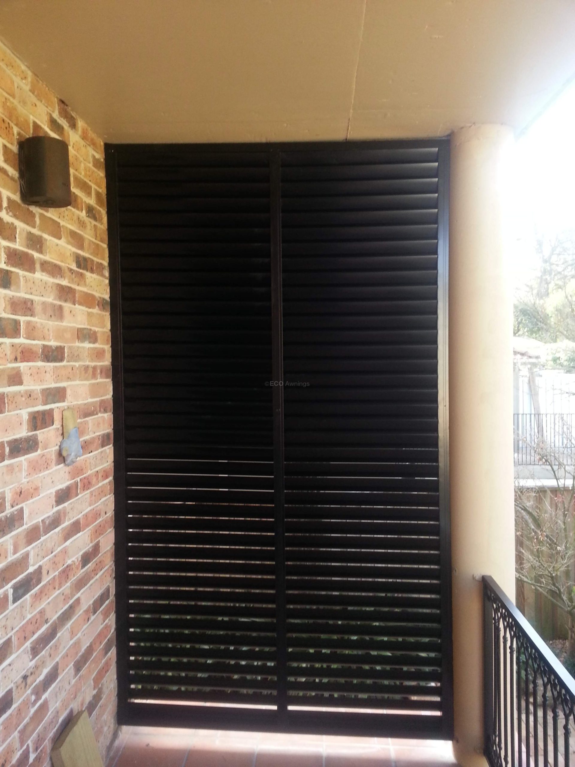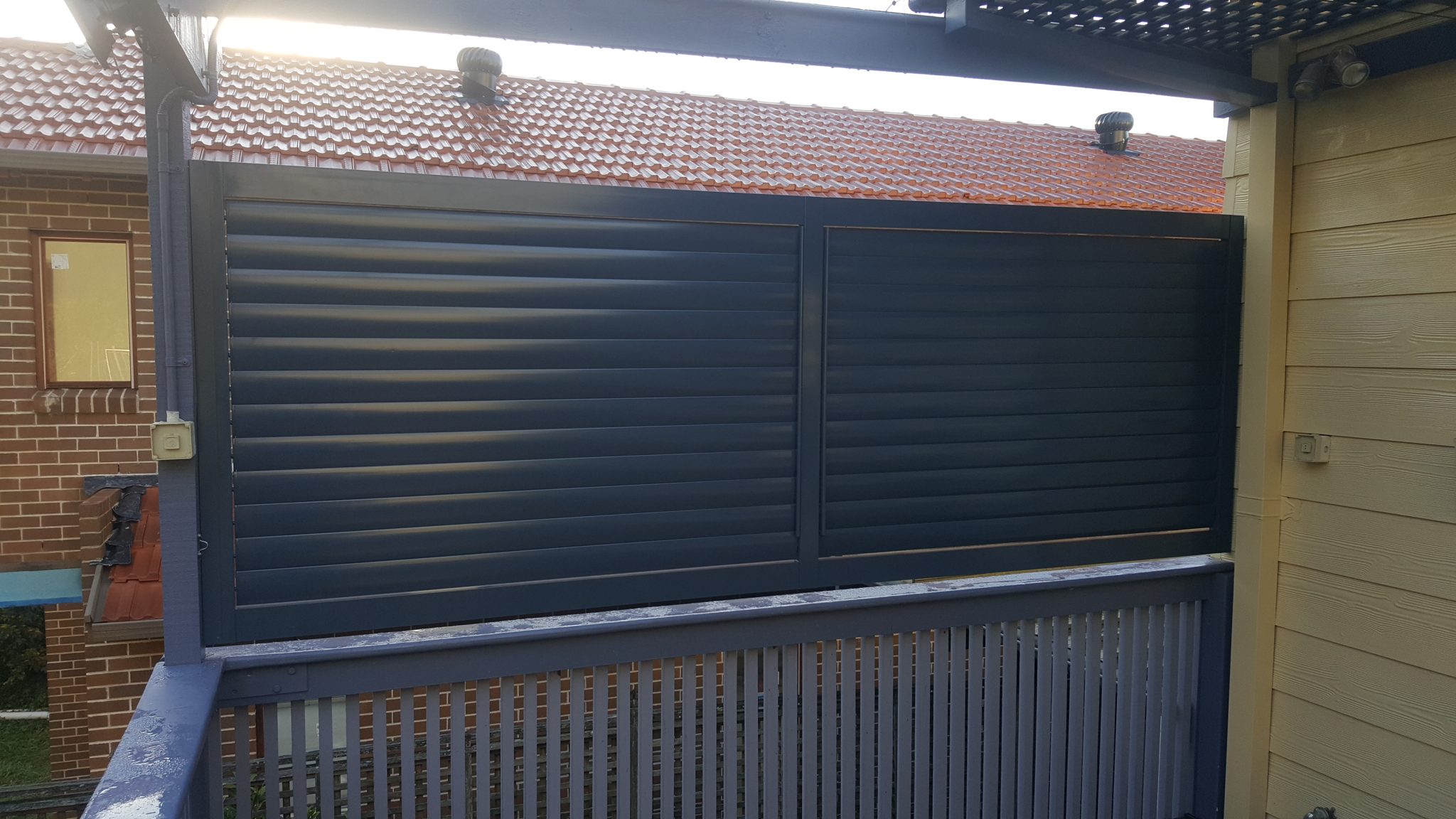 Aluminium sliding louvres on apartment balcony, three dark grey panels on top-hung track, Sydney