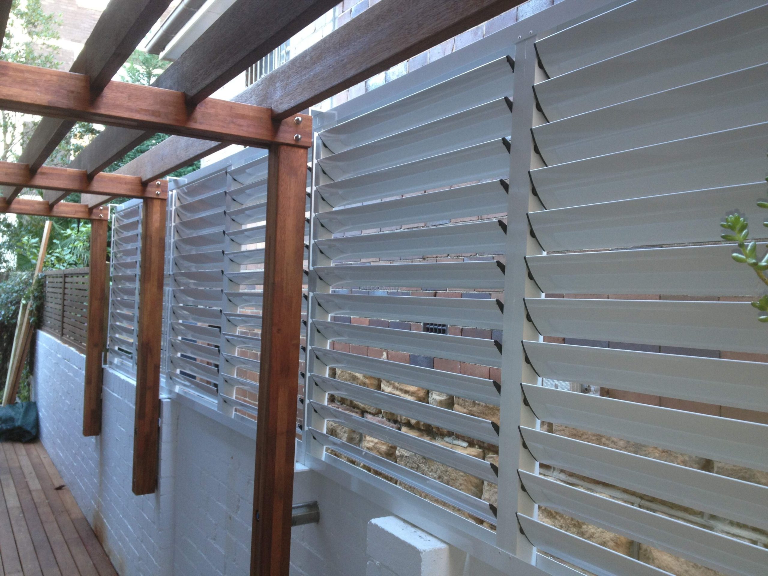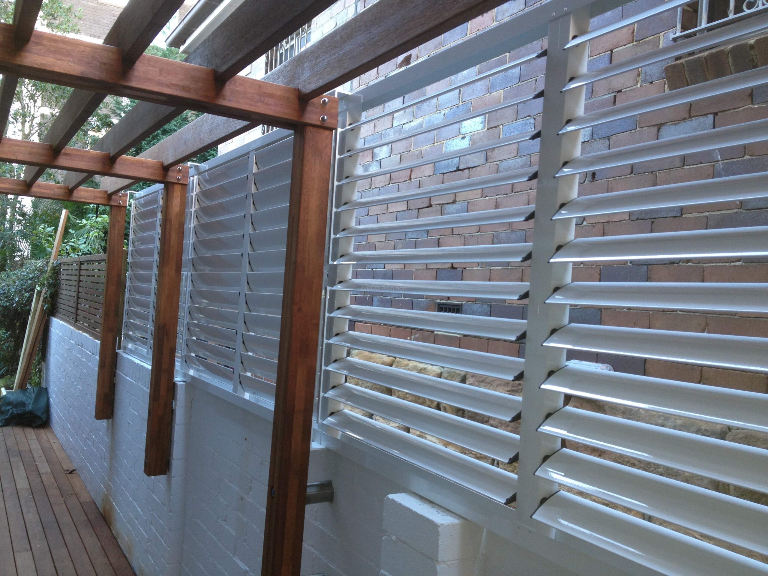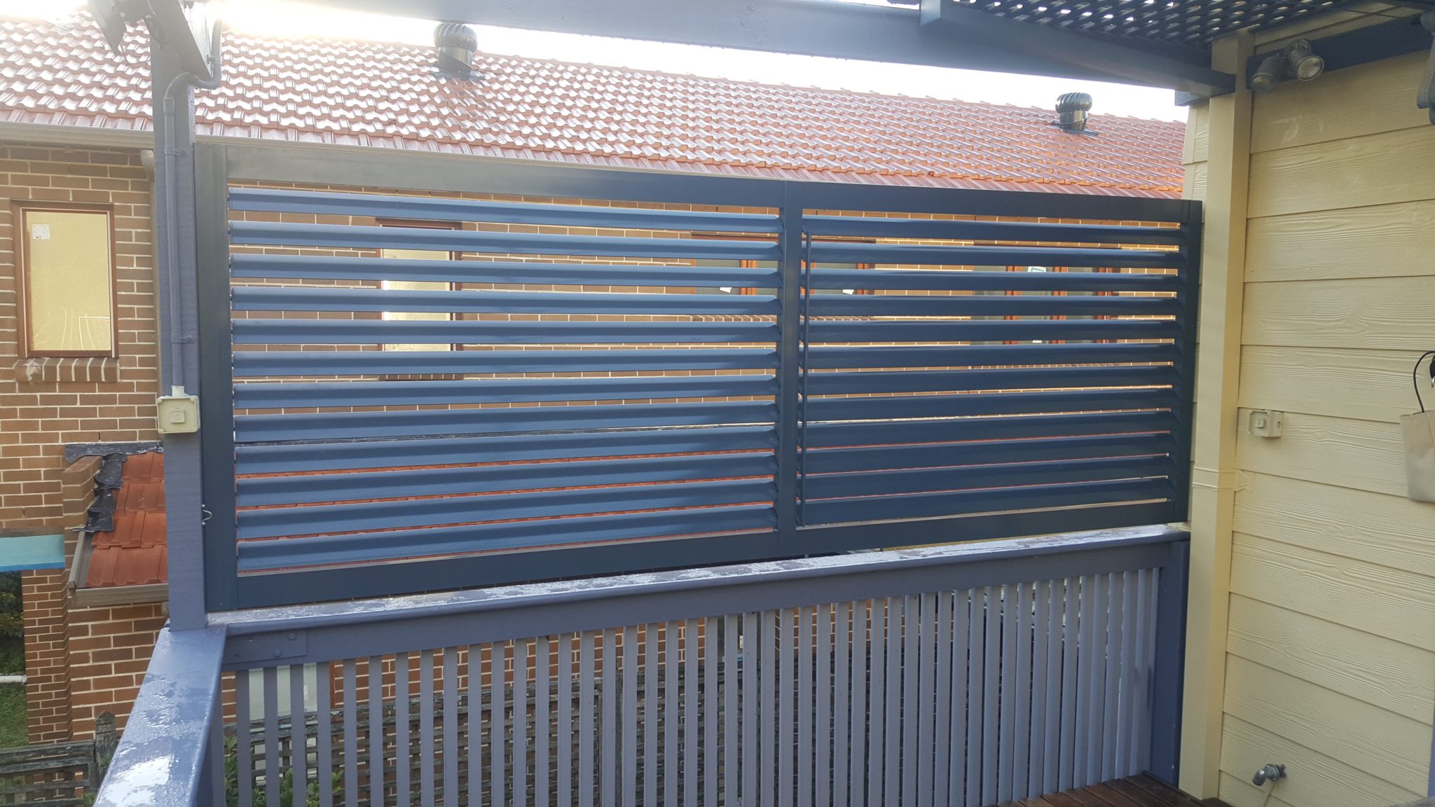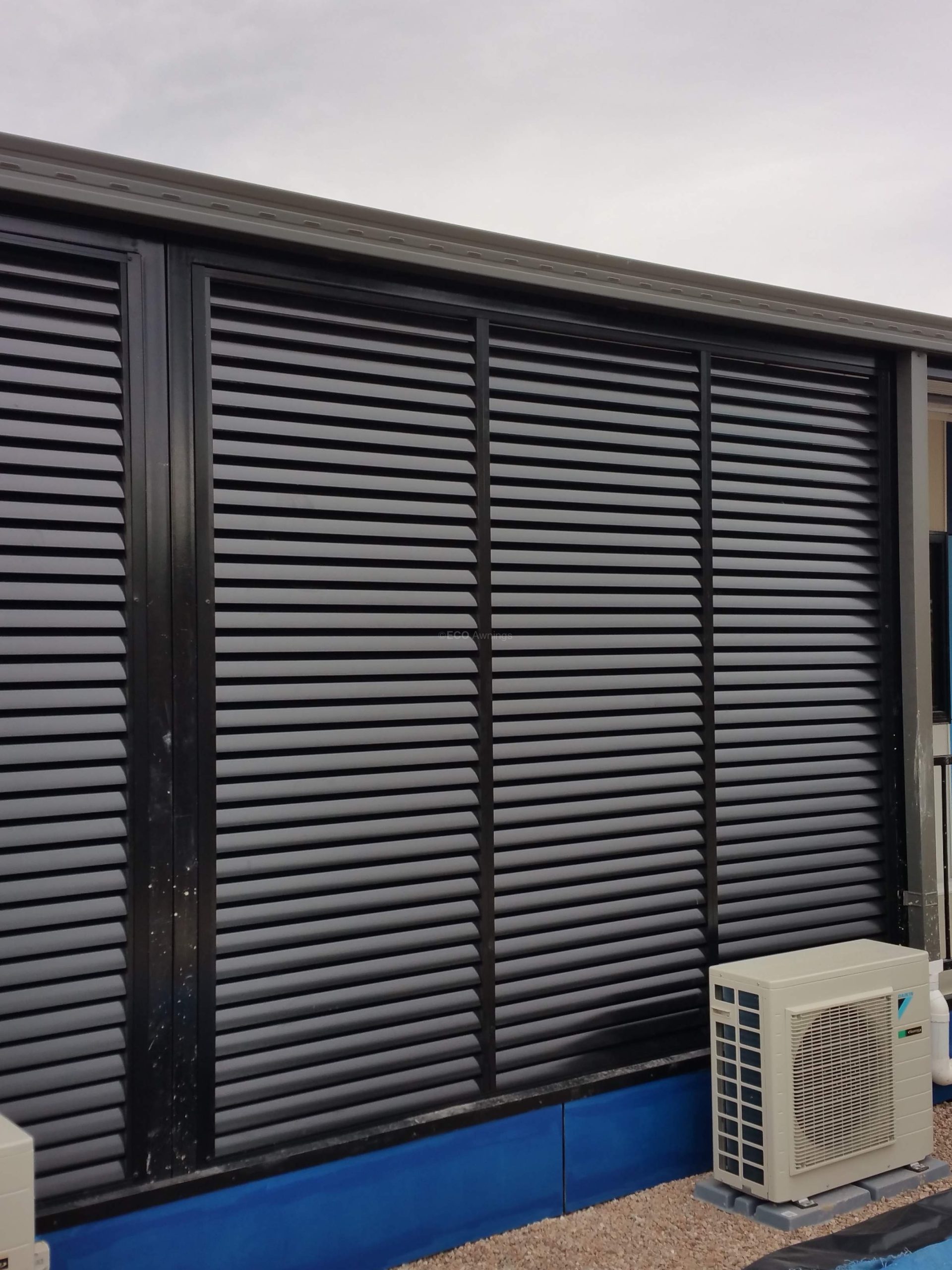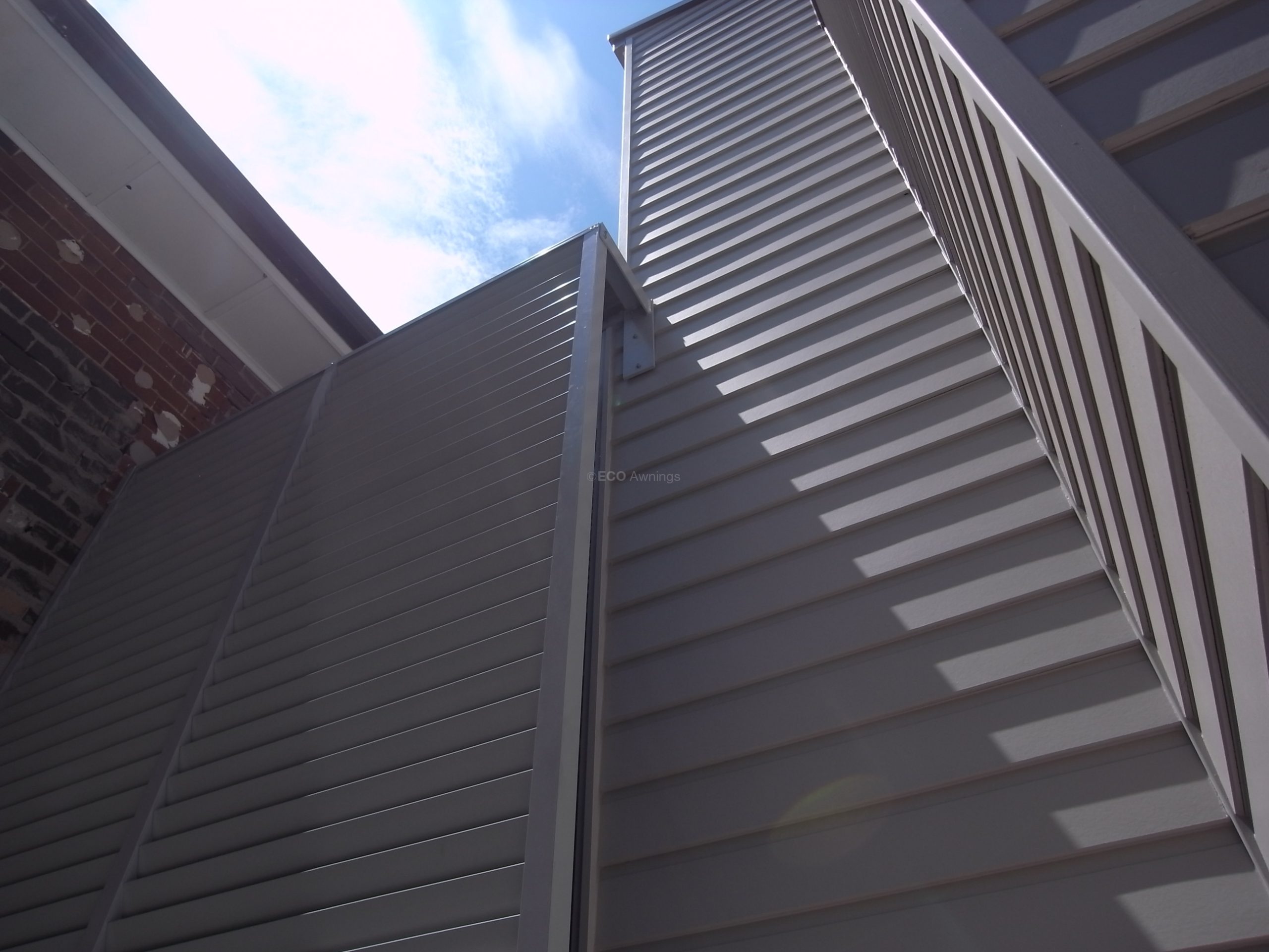 Aluminium sliding louvres on apartment balcony, three dark grey panels on top-hung track, Sydney