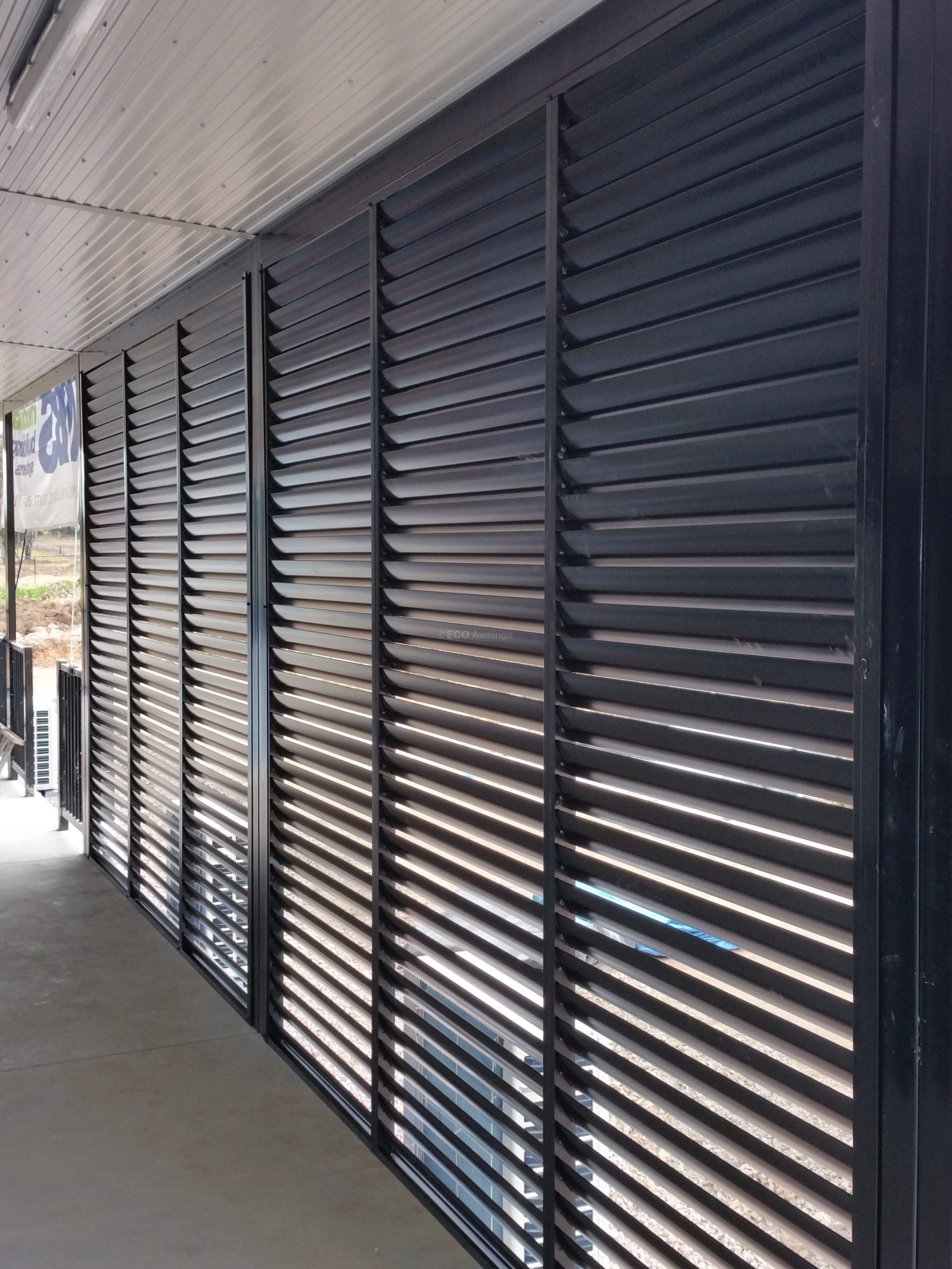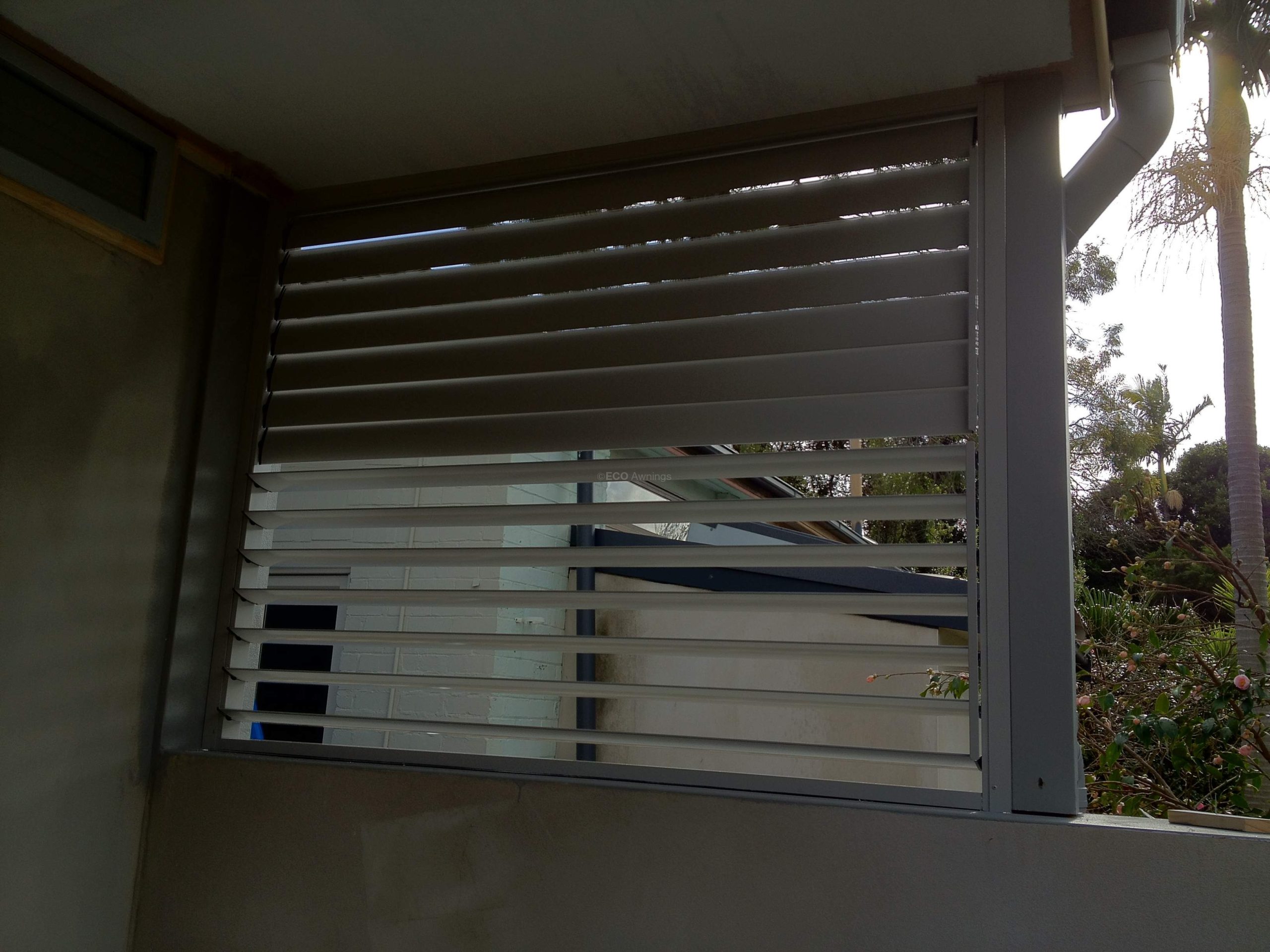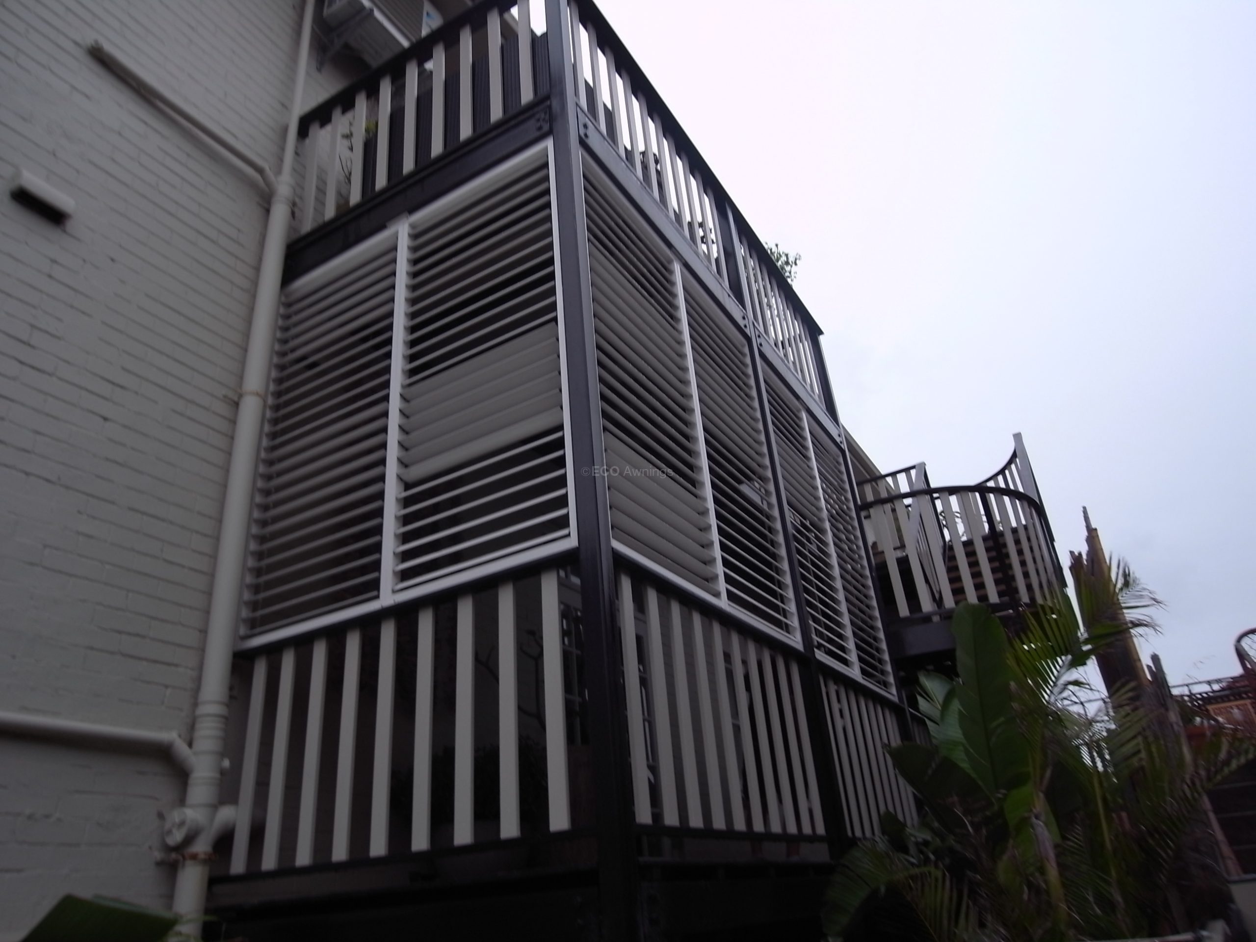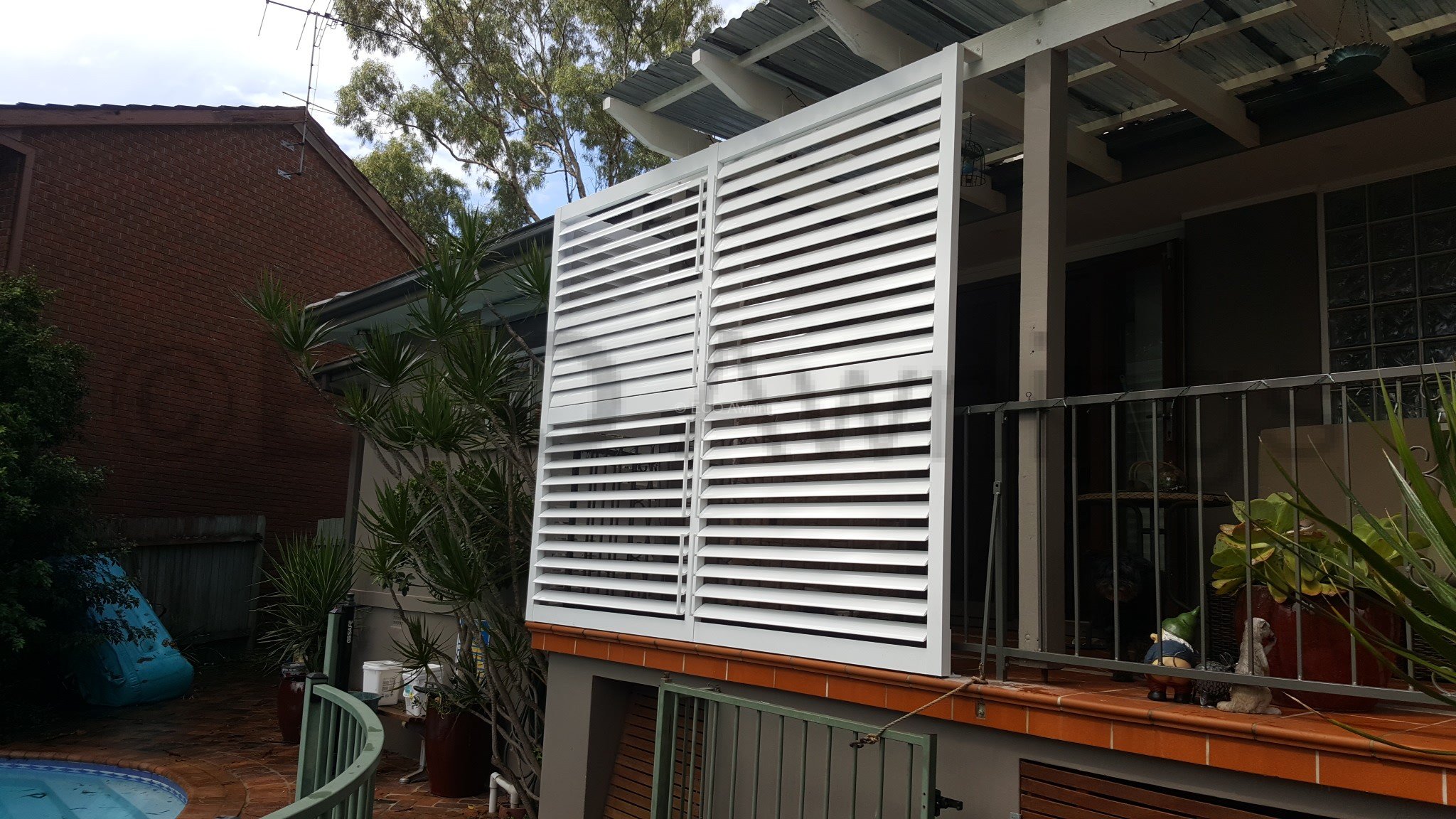 Aluminium sliding louvres on apartment balcony, three dark grey panels on top-hung track, Sydney