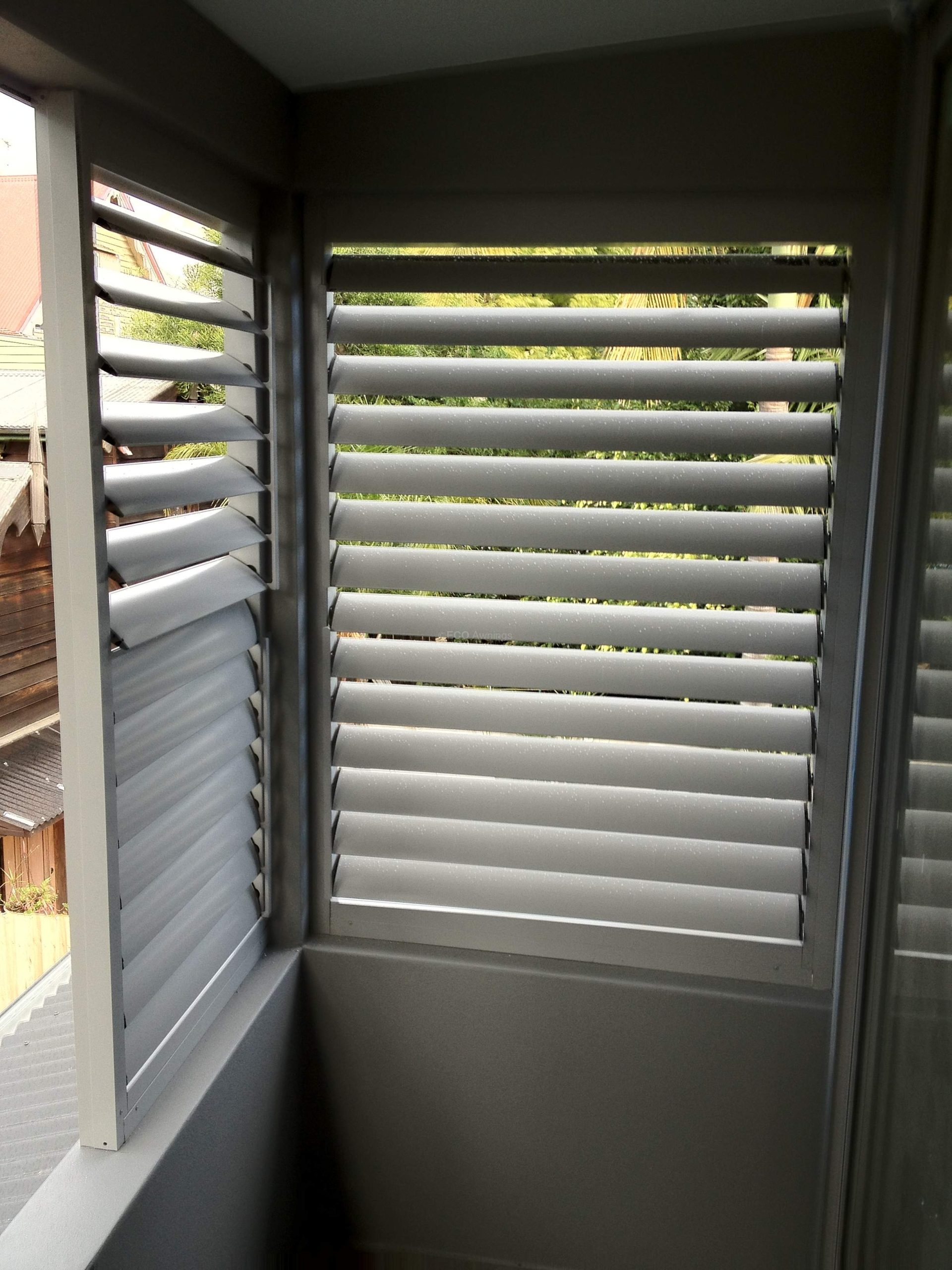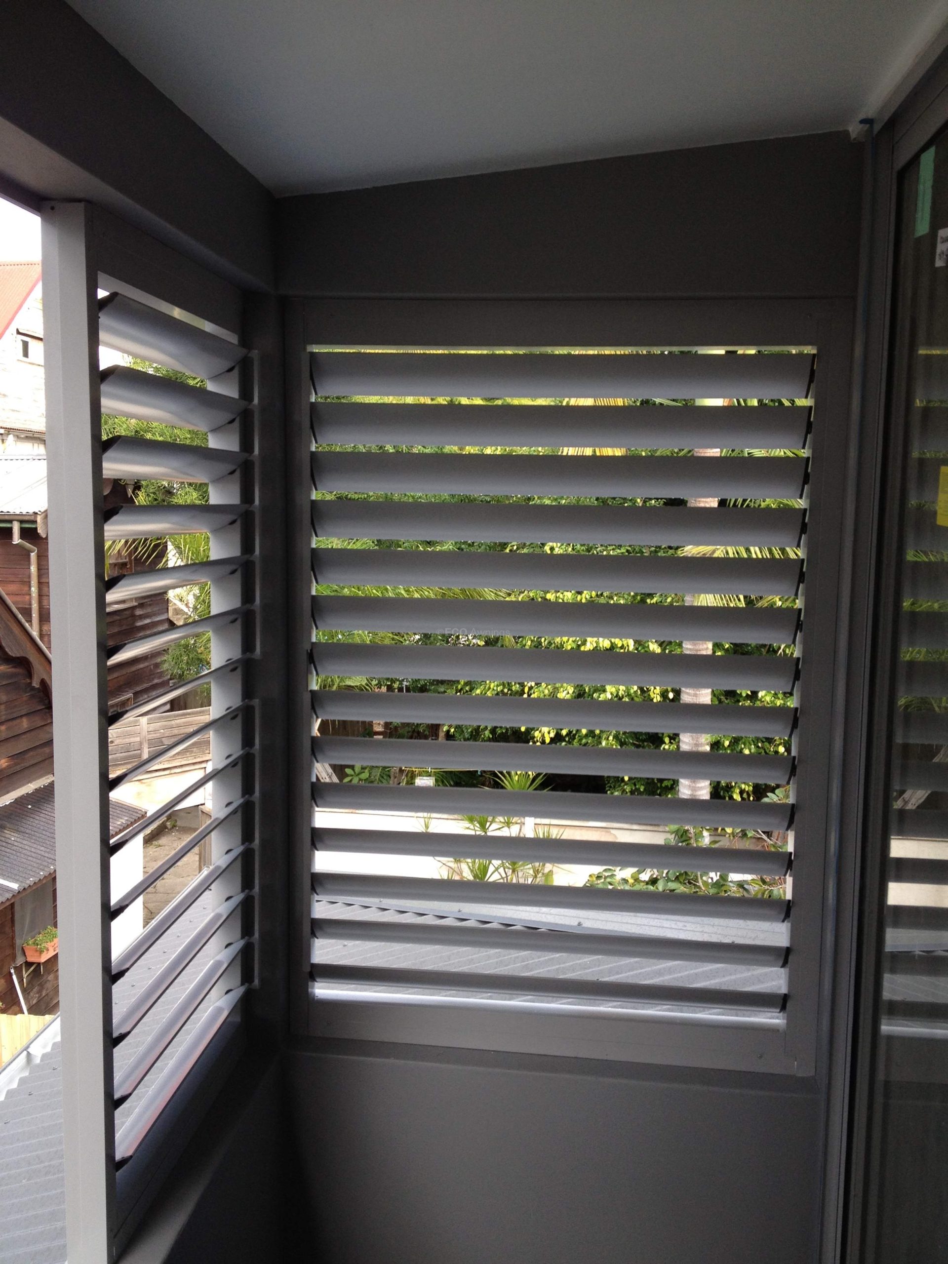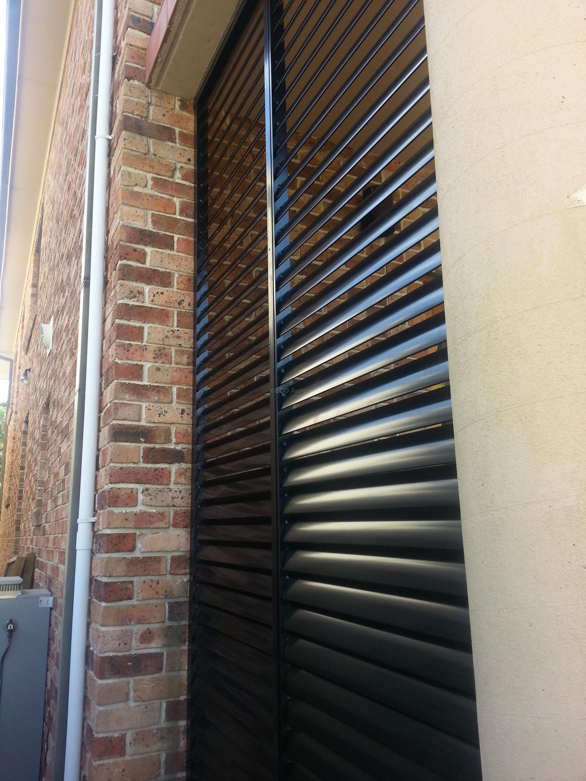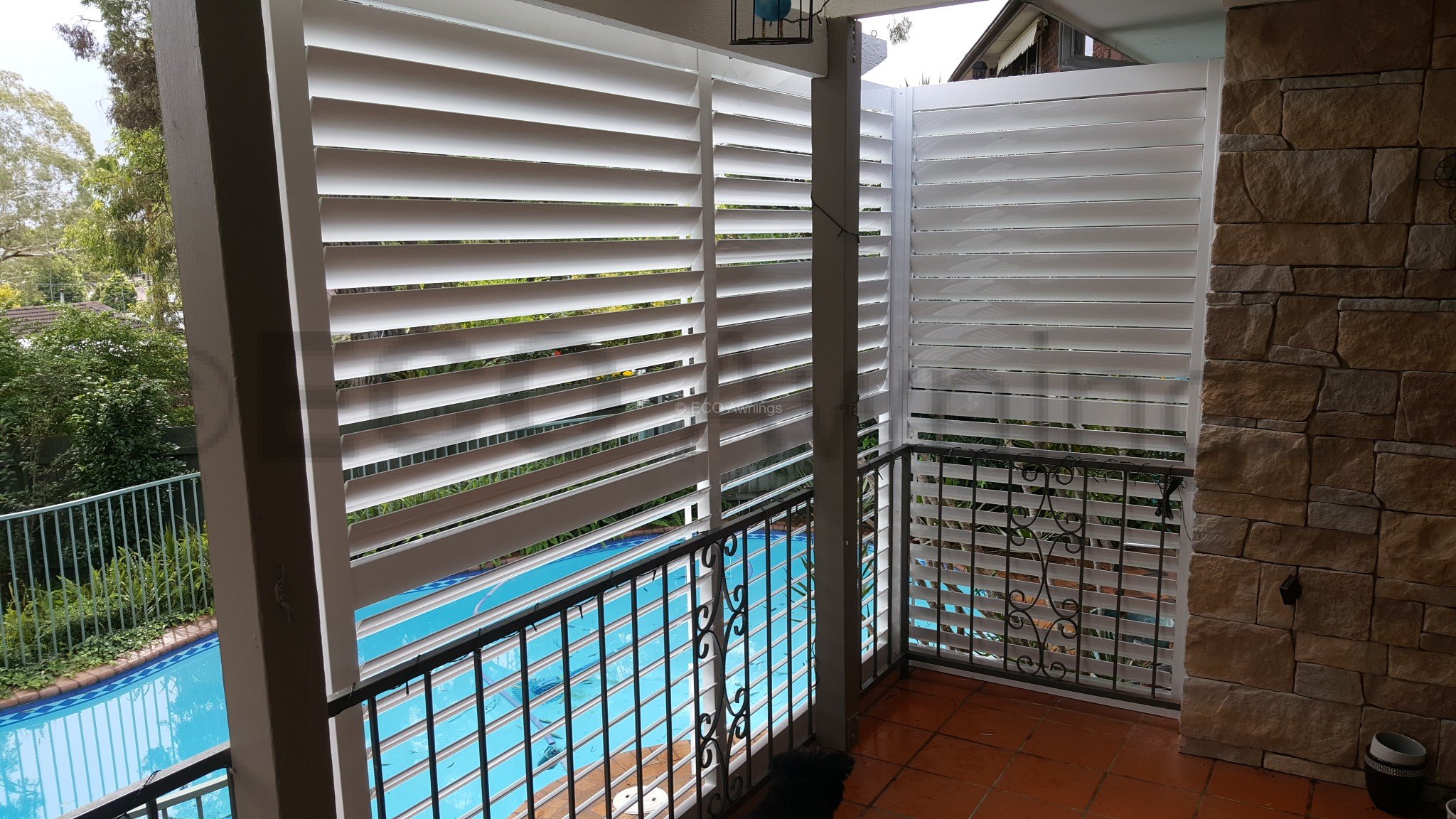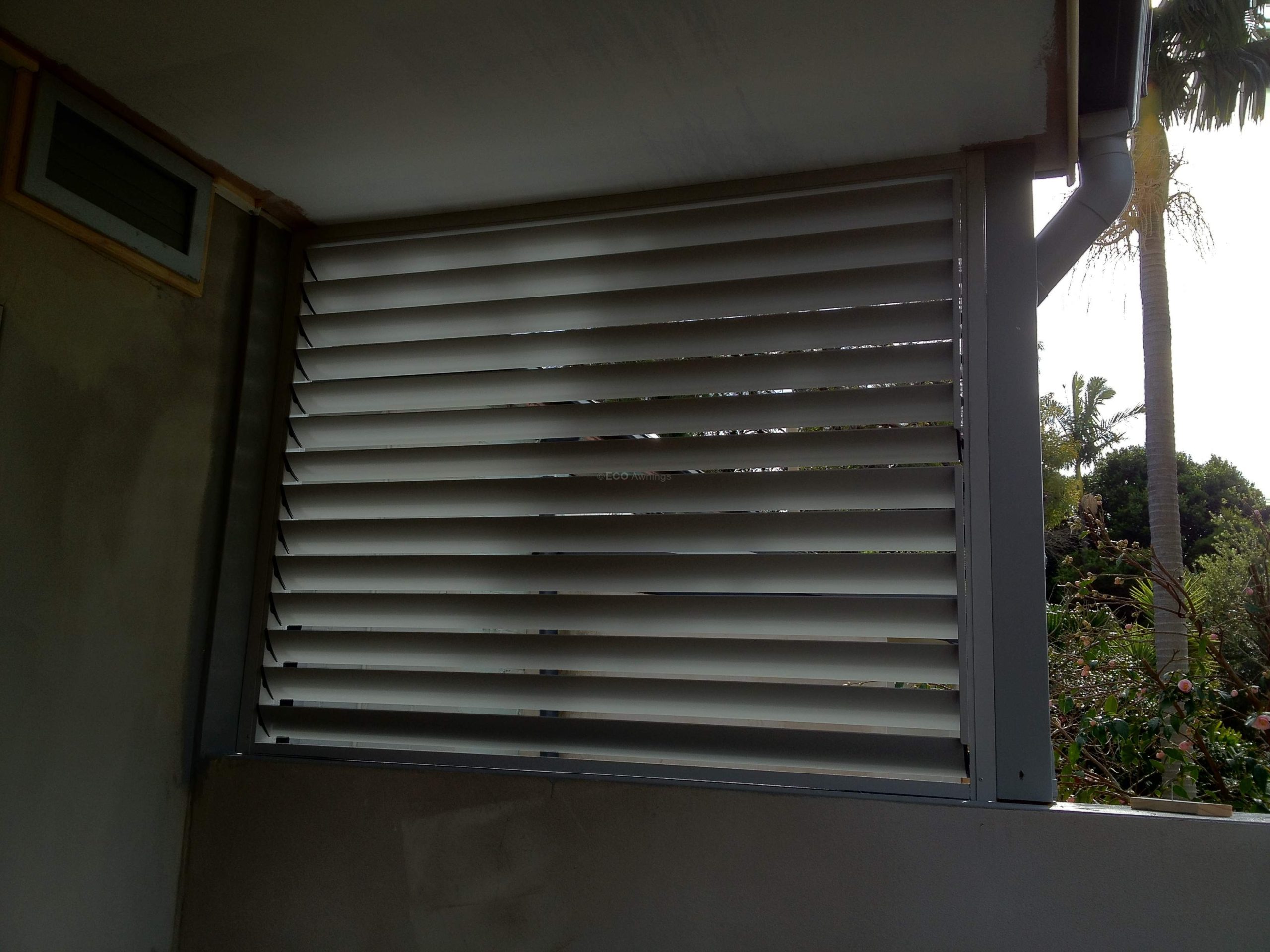 Aluminium sliding louvres on apartment balcony, three dark grey panels on top-hung track, Sydney