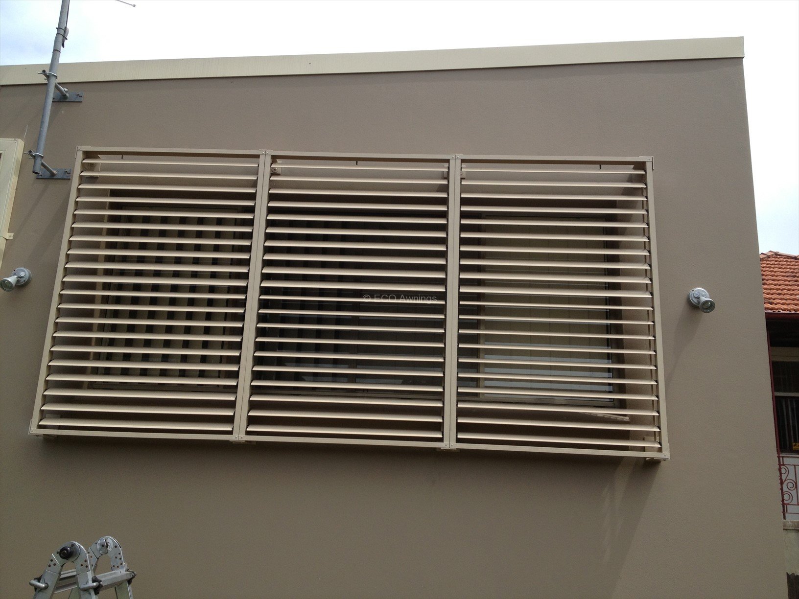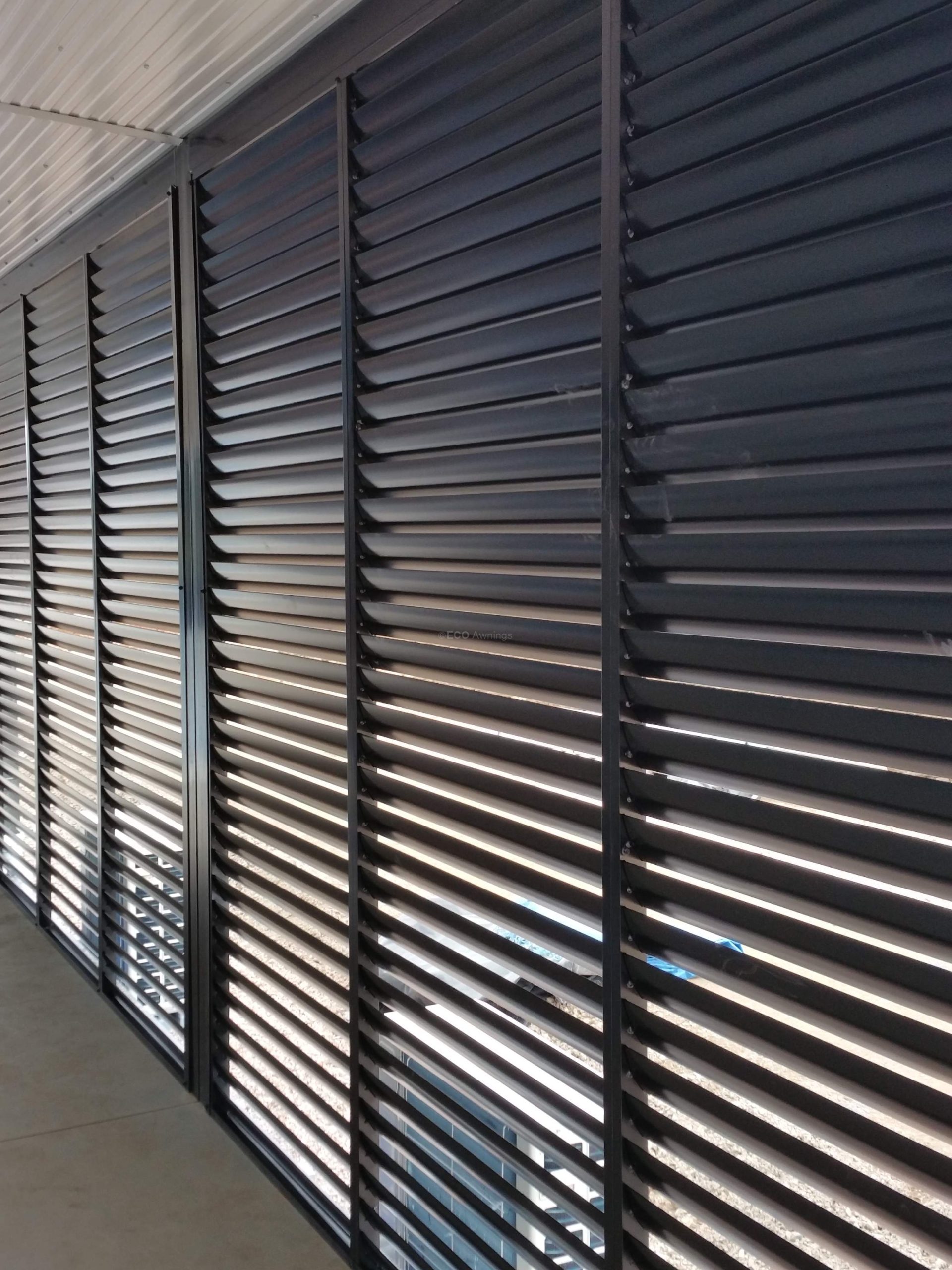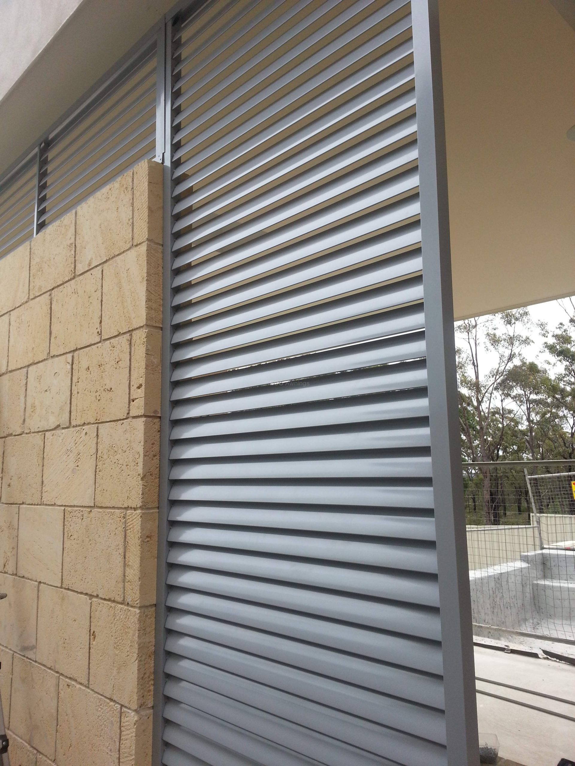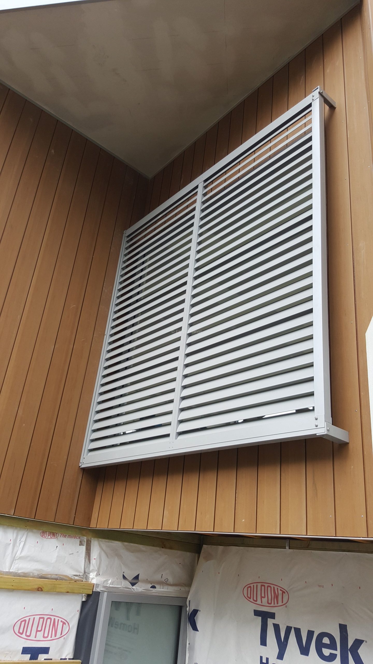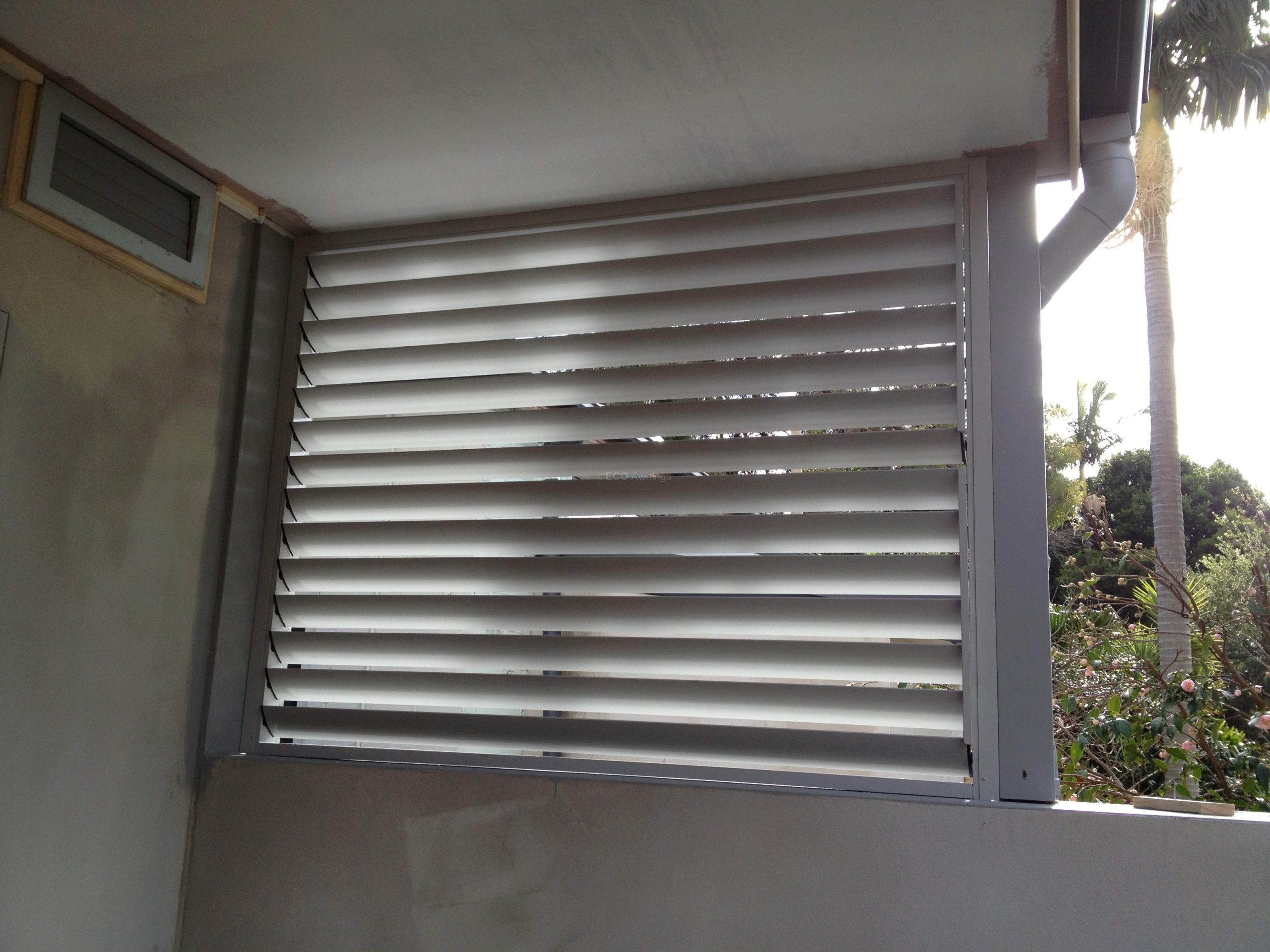 Aluminium sliding louvres on apartment balcony, three dark grey panels on top-hung track, Sydney