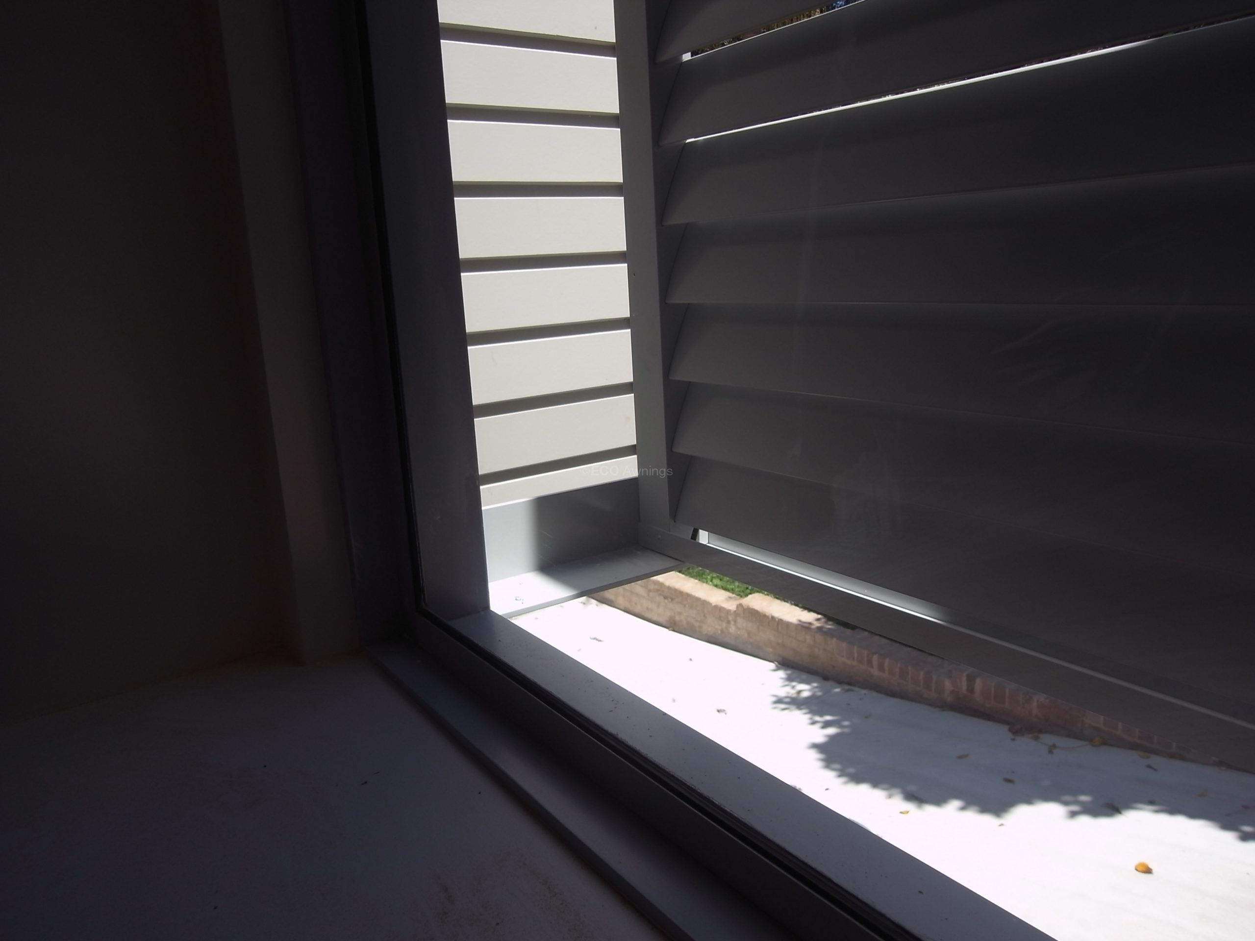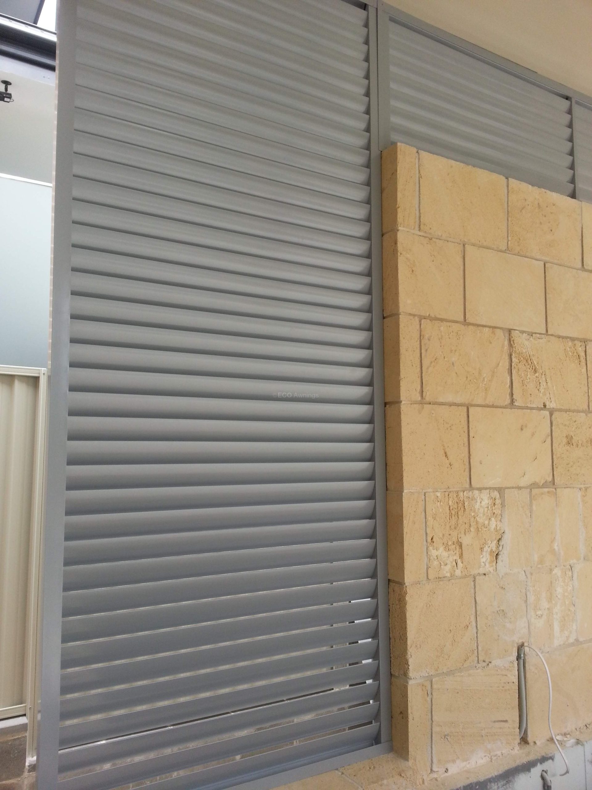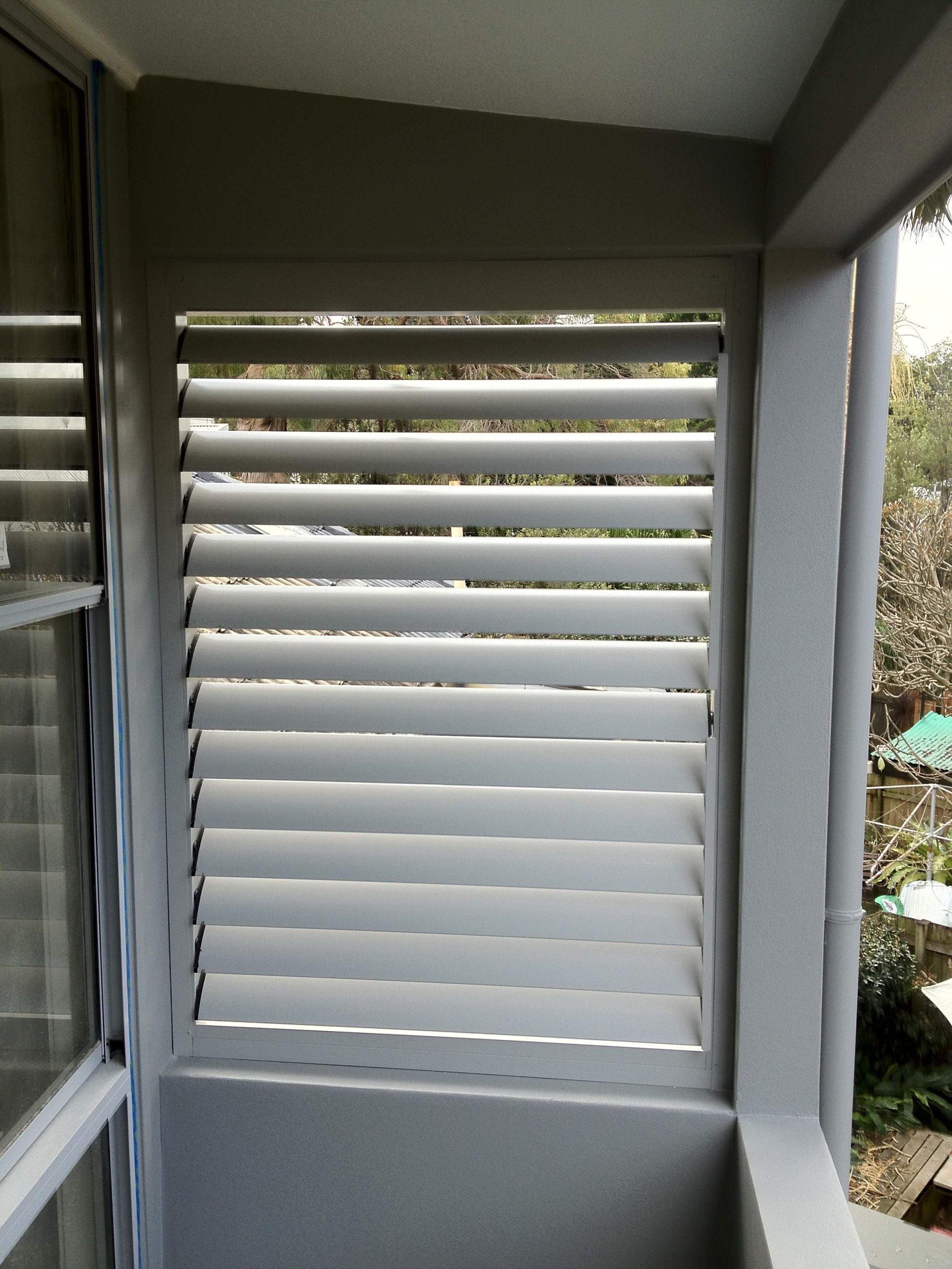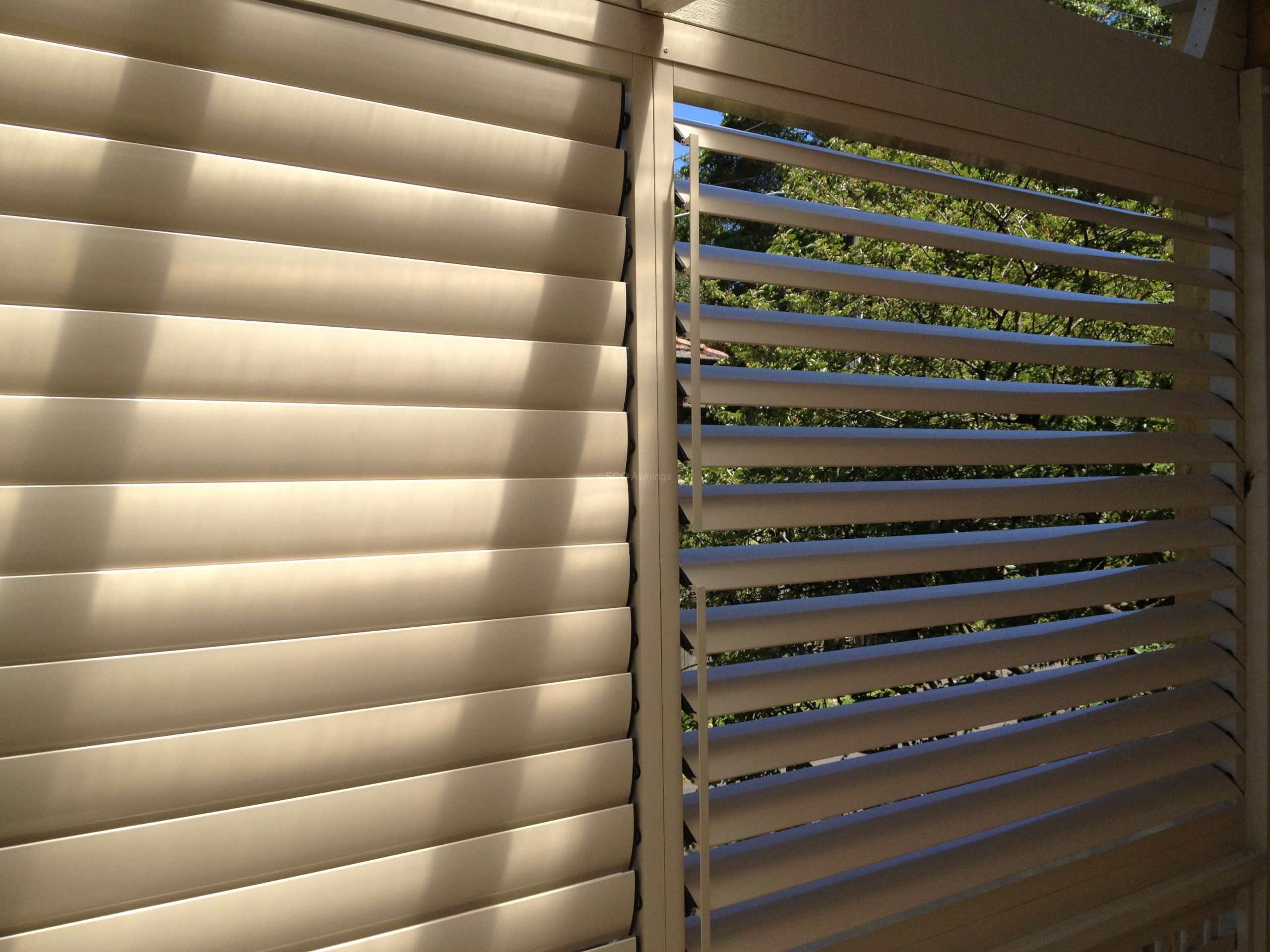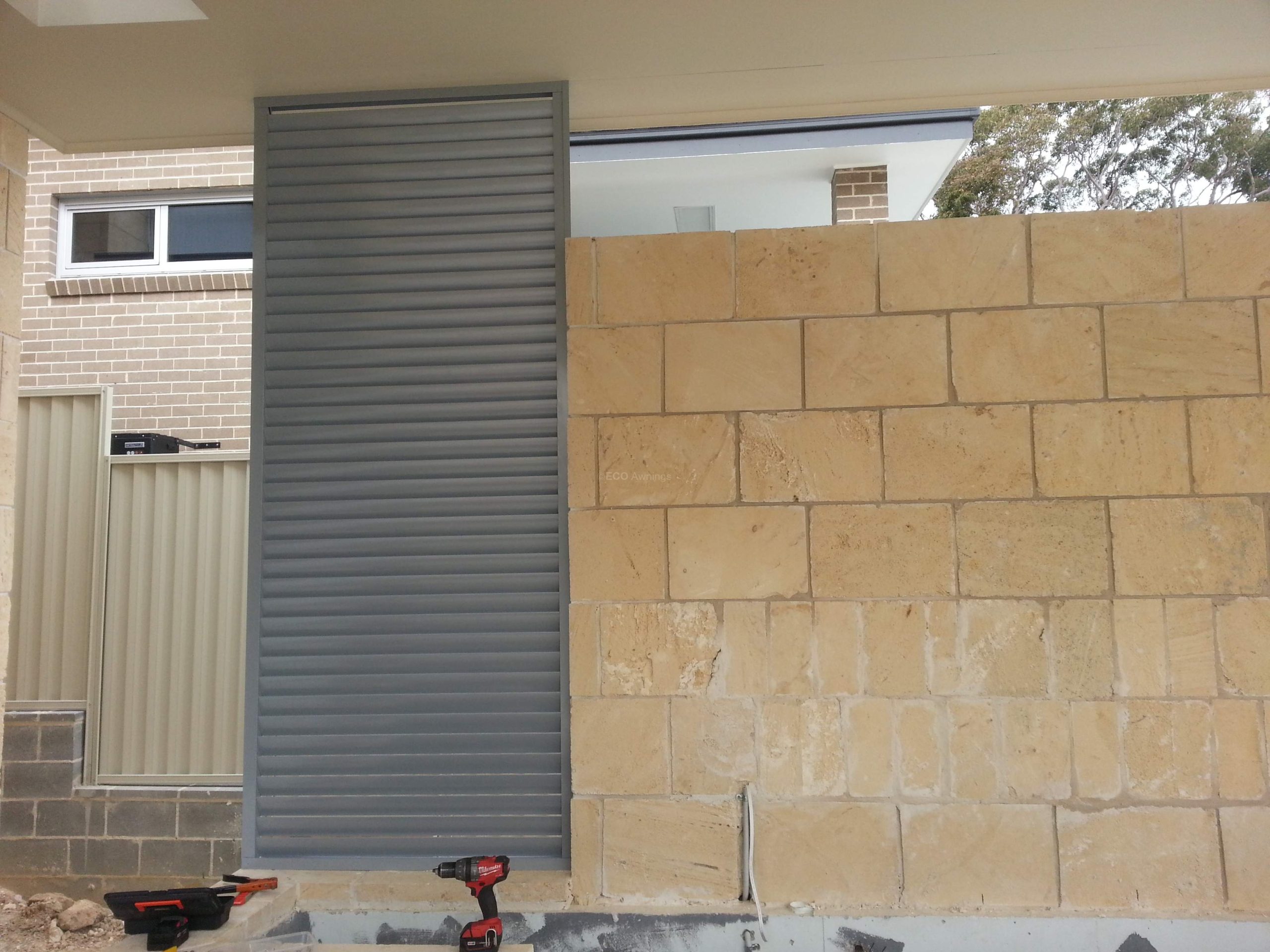 Aluminium sliding louvres on apartment balcony, three dark grey panels on top-hung track, Sydney