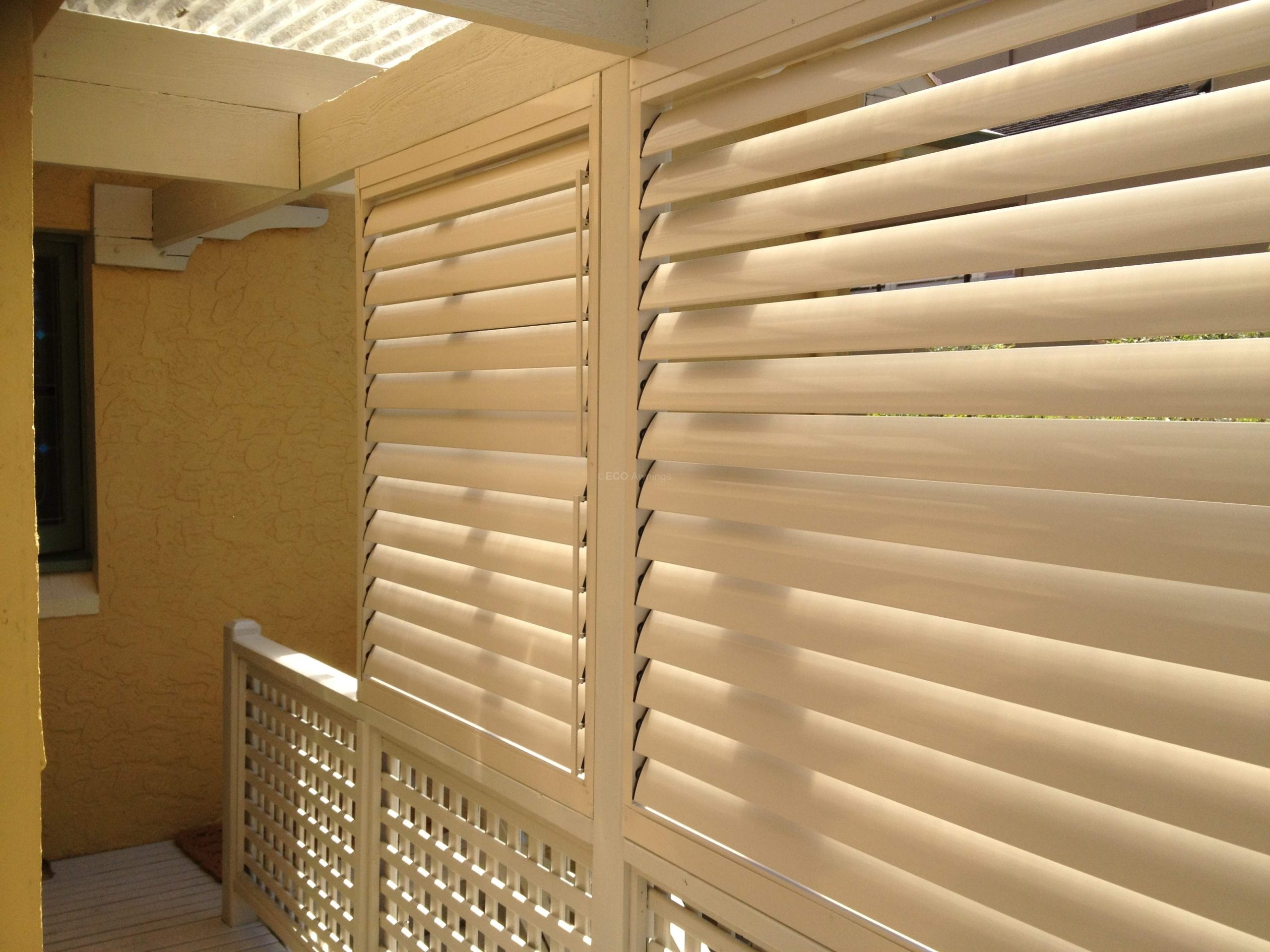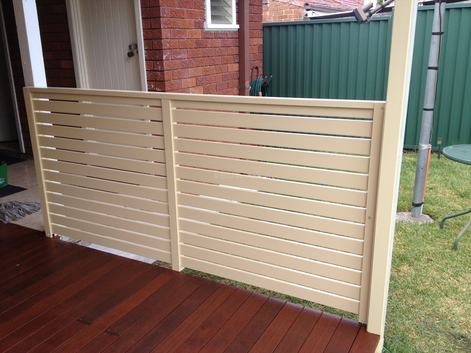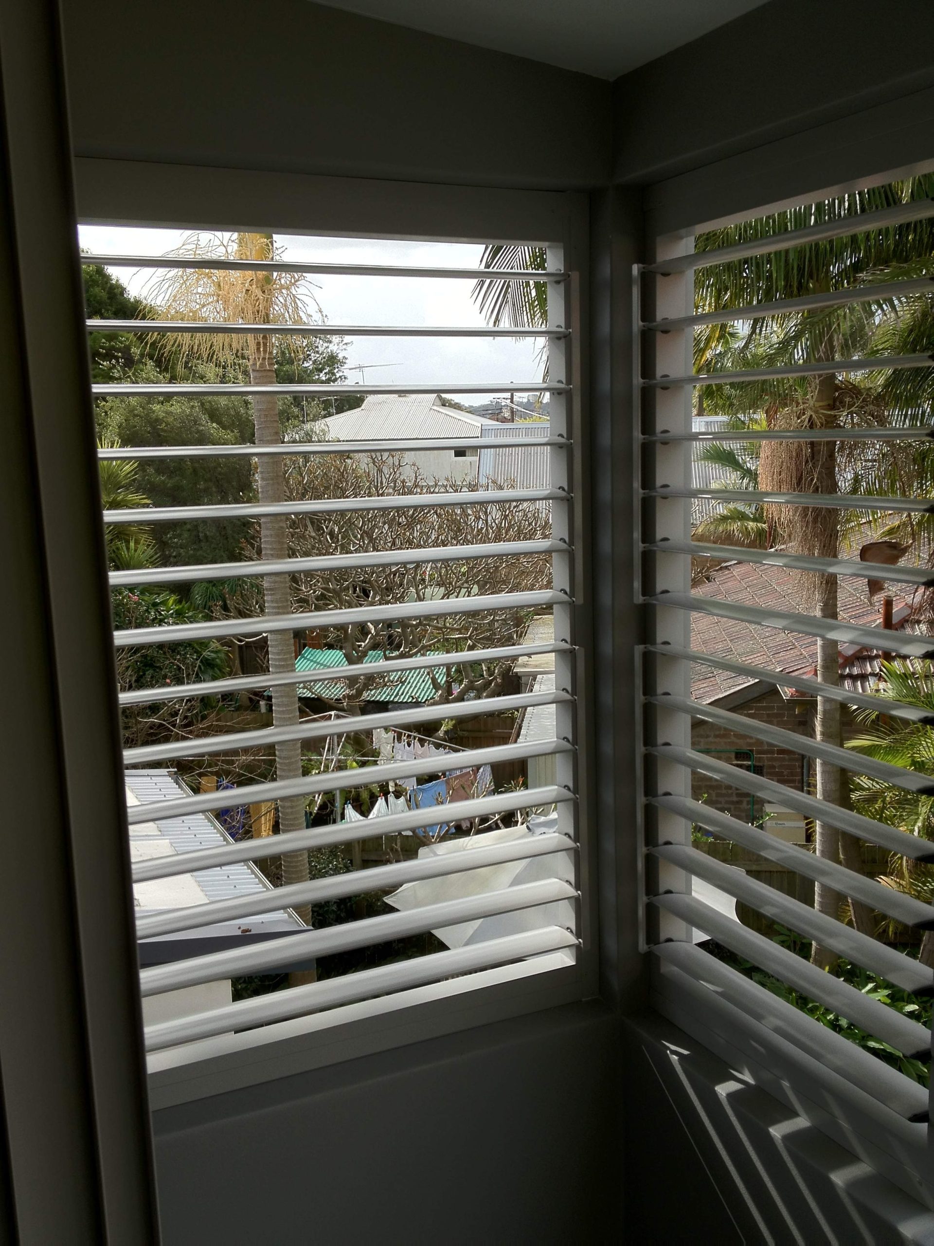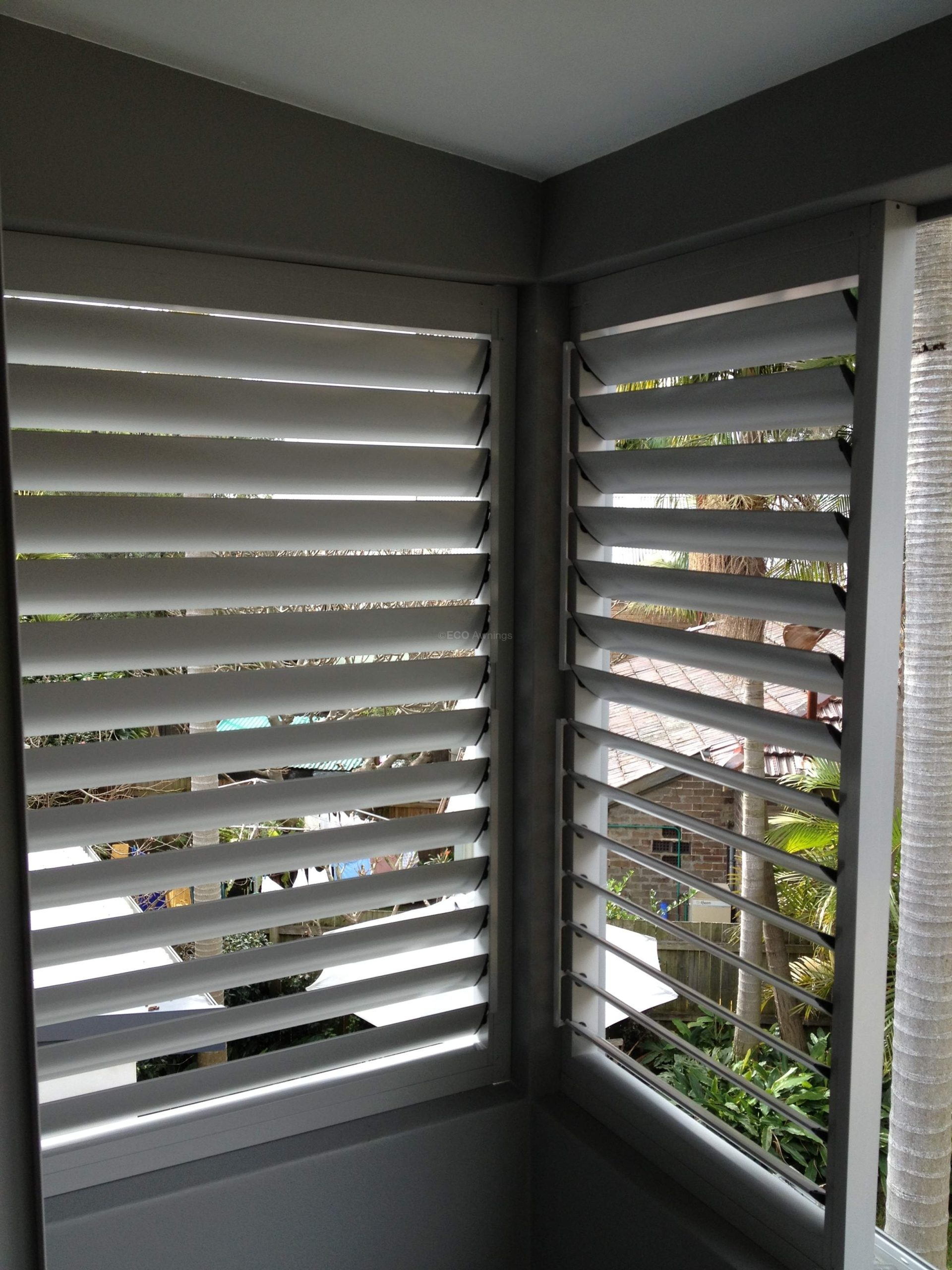 Aluminium sliding louvres on apartment balcony, three dark grey panels on top-hung track, Sydney