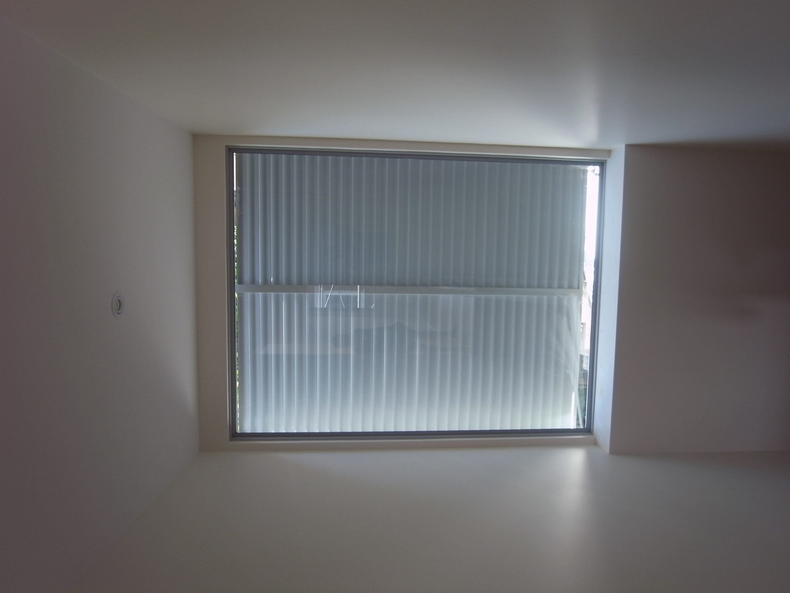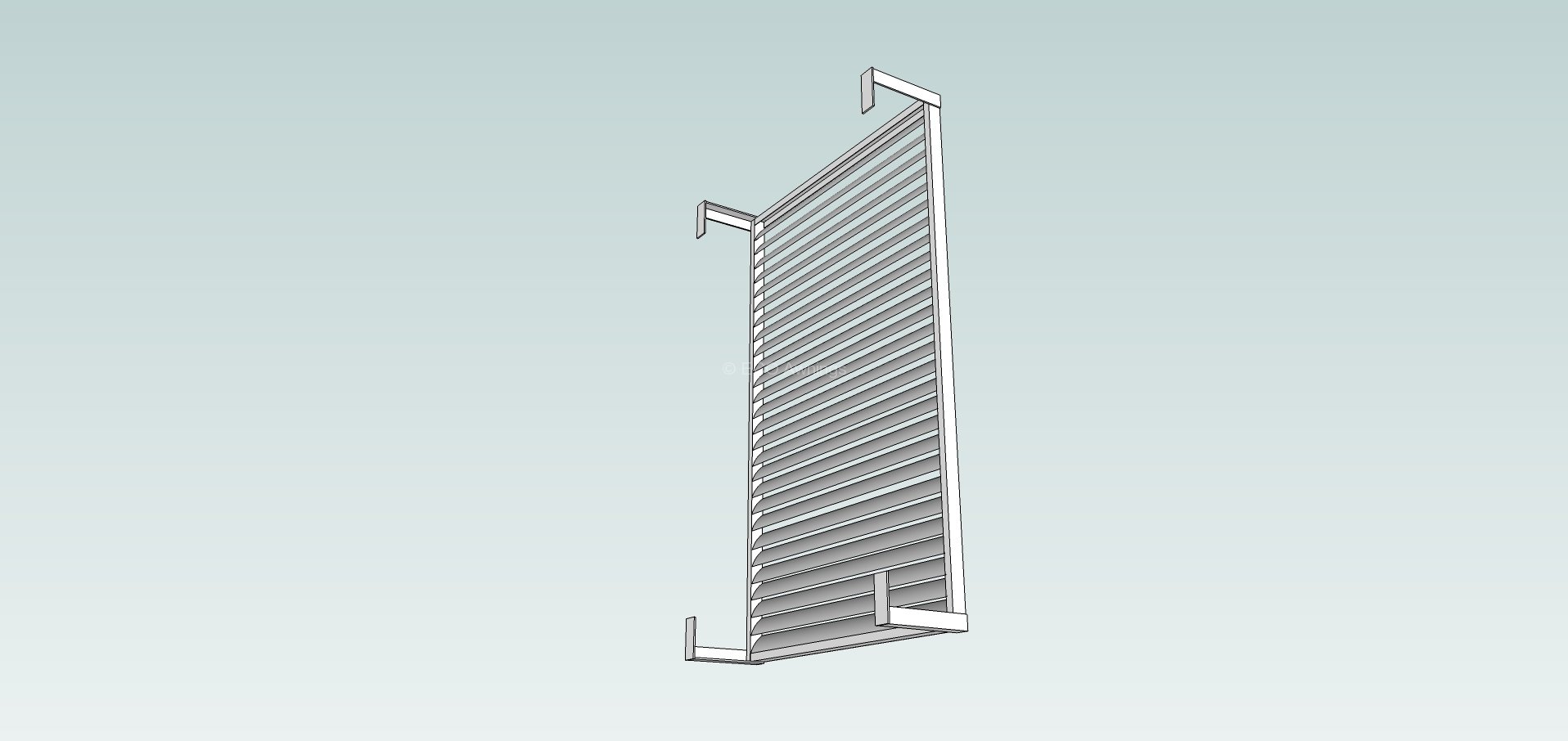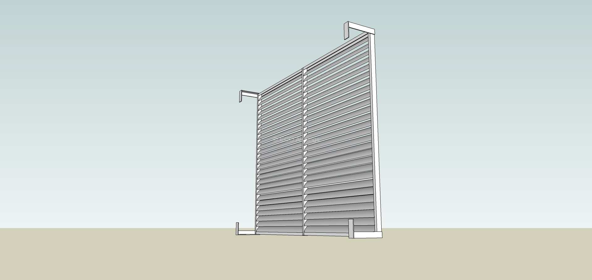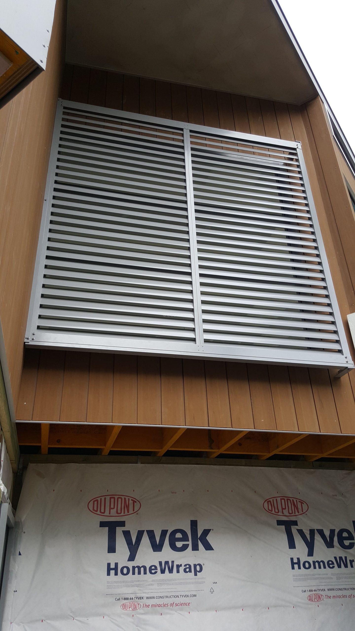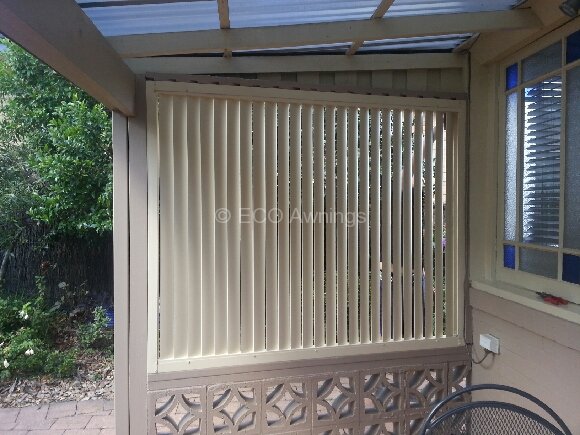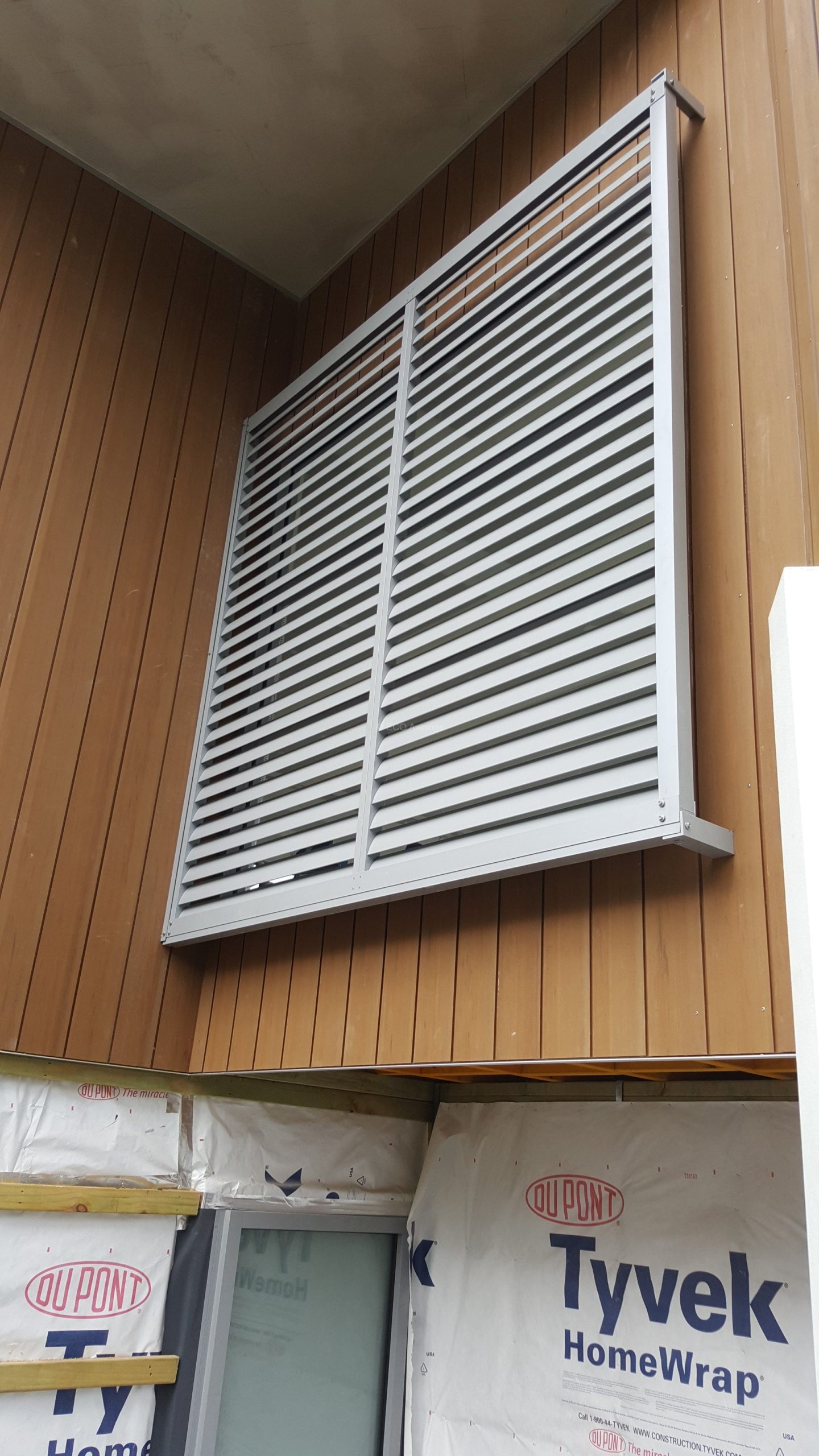 Aluminium sliding louvres on apartment balcony, three dark grey panels on top-hung track, Sydney