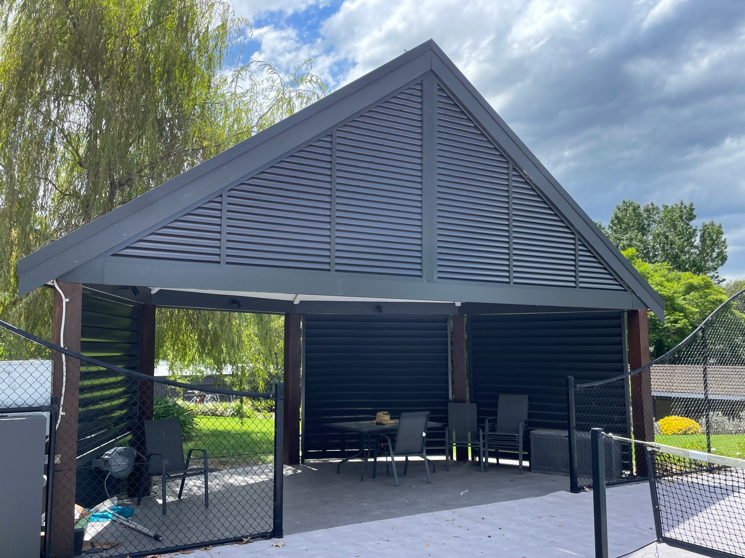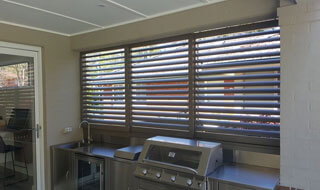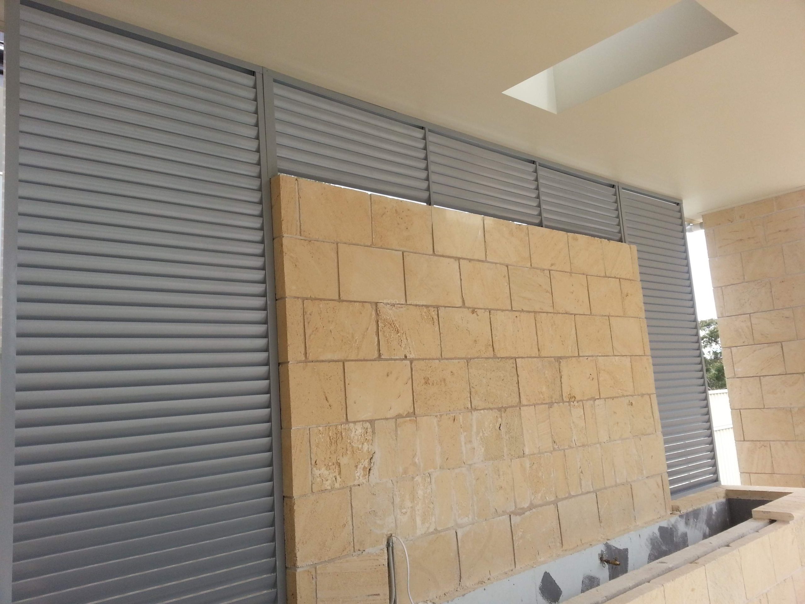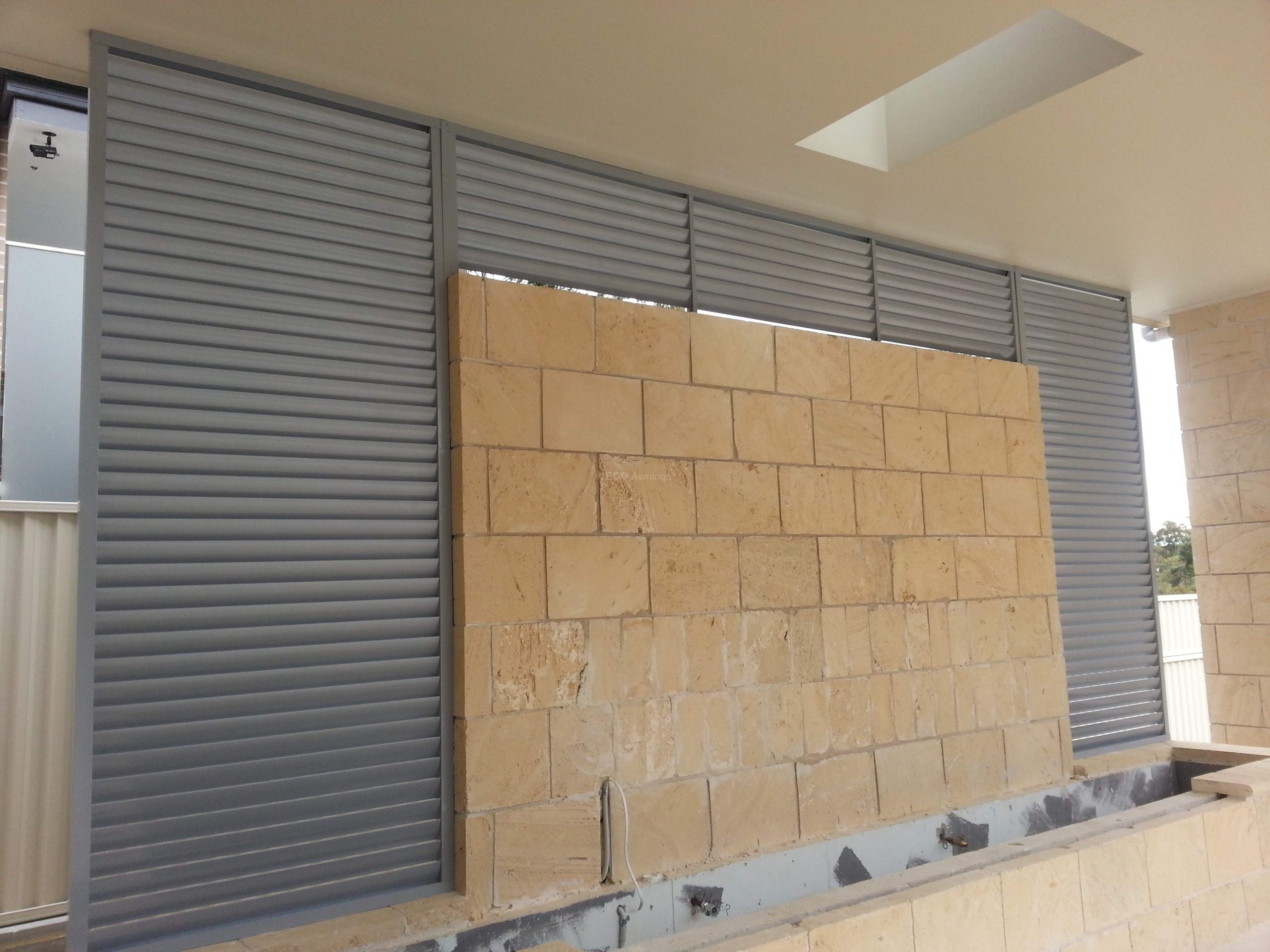 Aluminium 160mm privacy screen louvres in outdoor BBQ area, dark grey vertical blades, Sydney