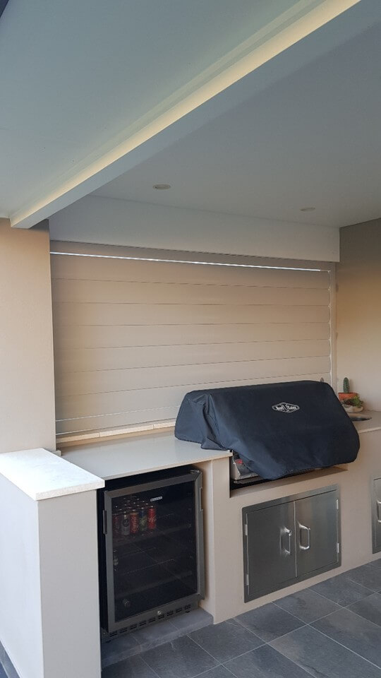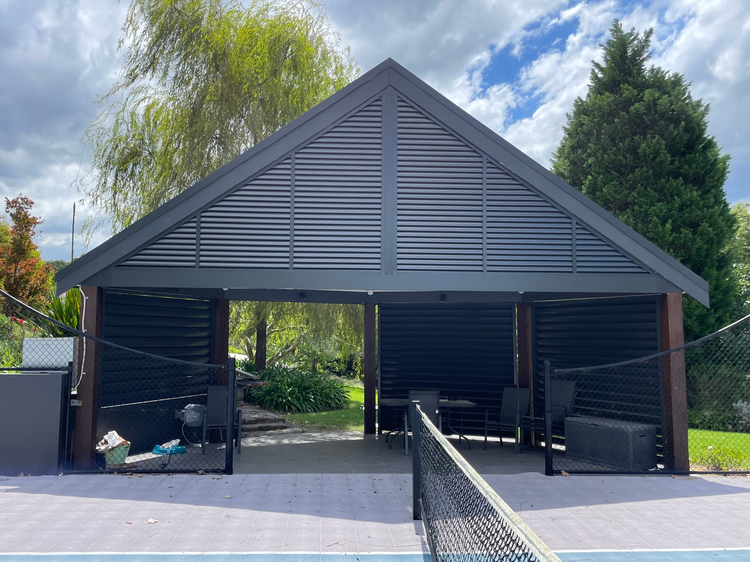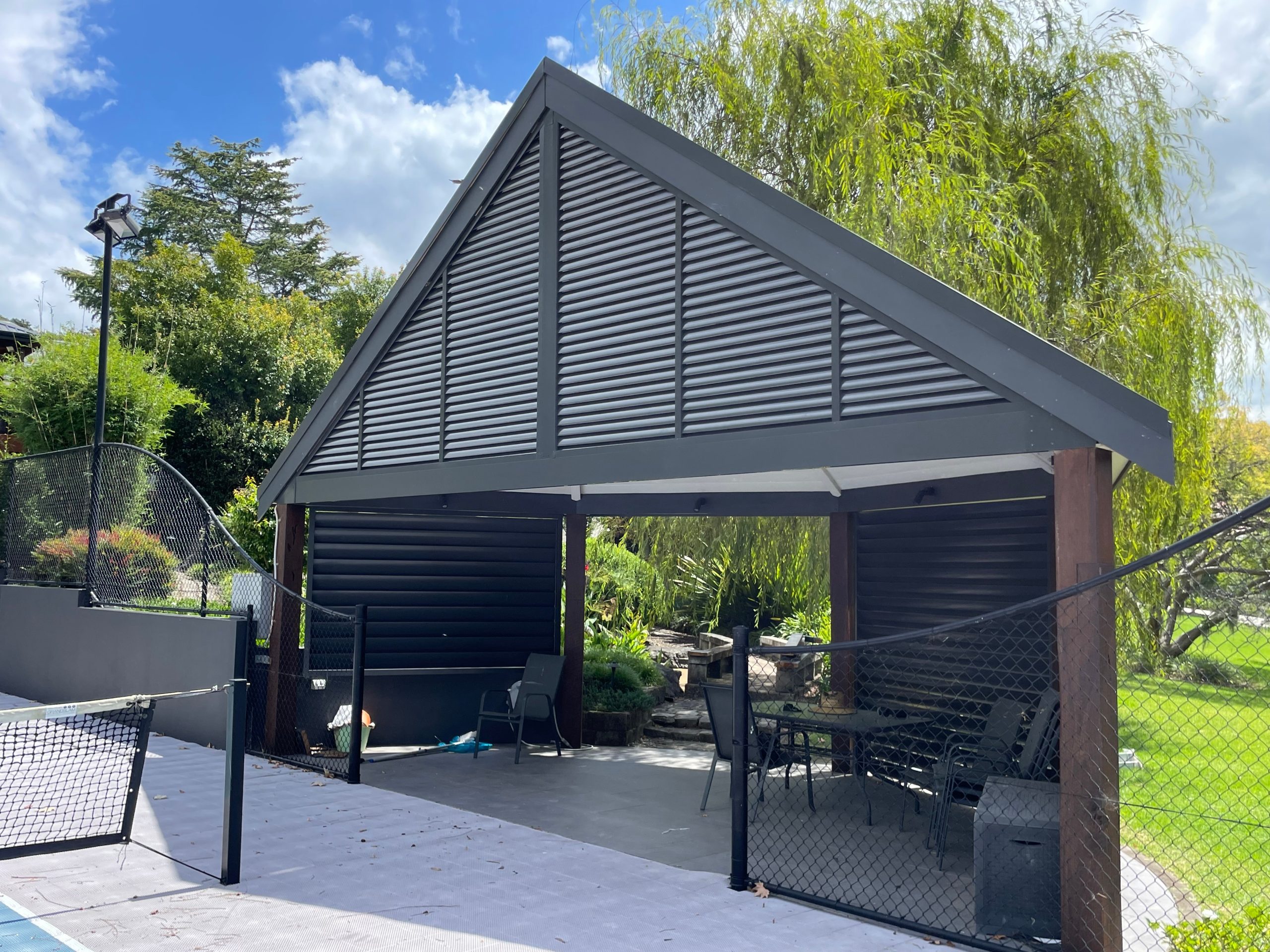 Aluminium 160mm privacy screen louvres in outdoor BBQ area, dark grey vertical blades, Sydney