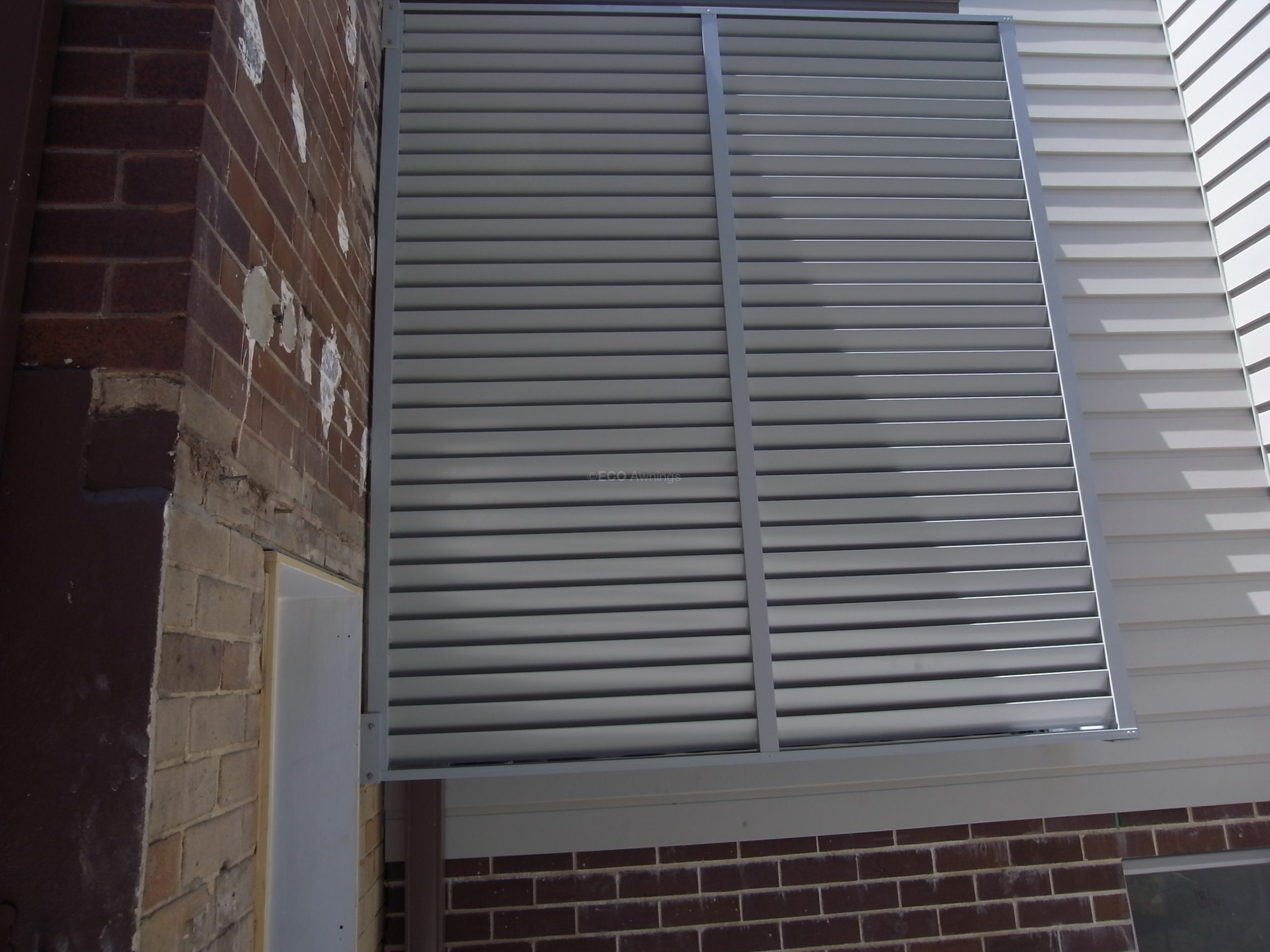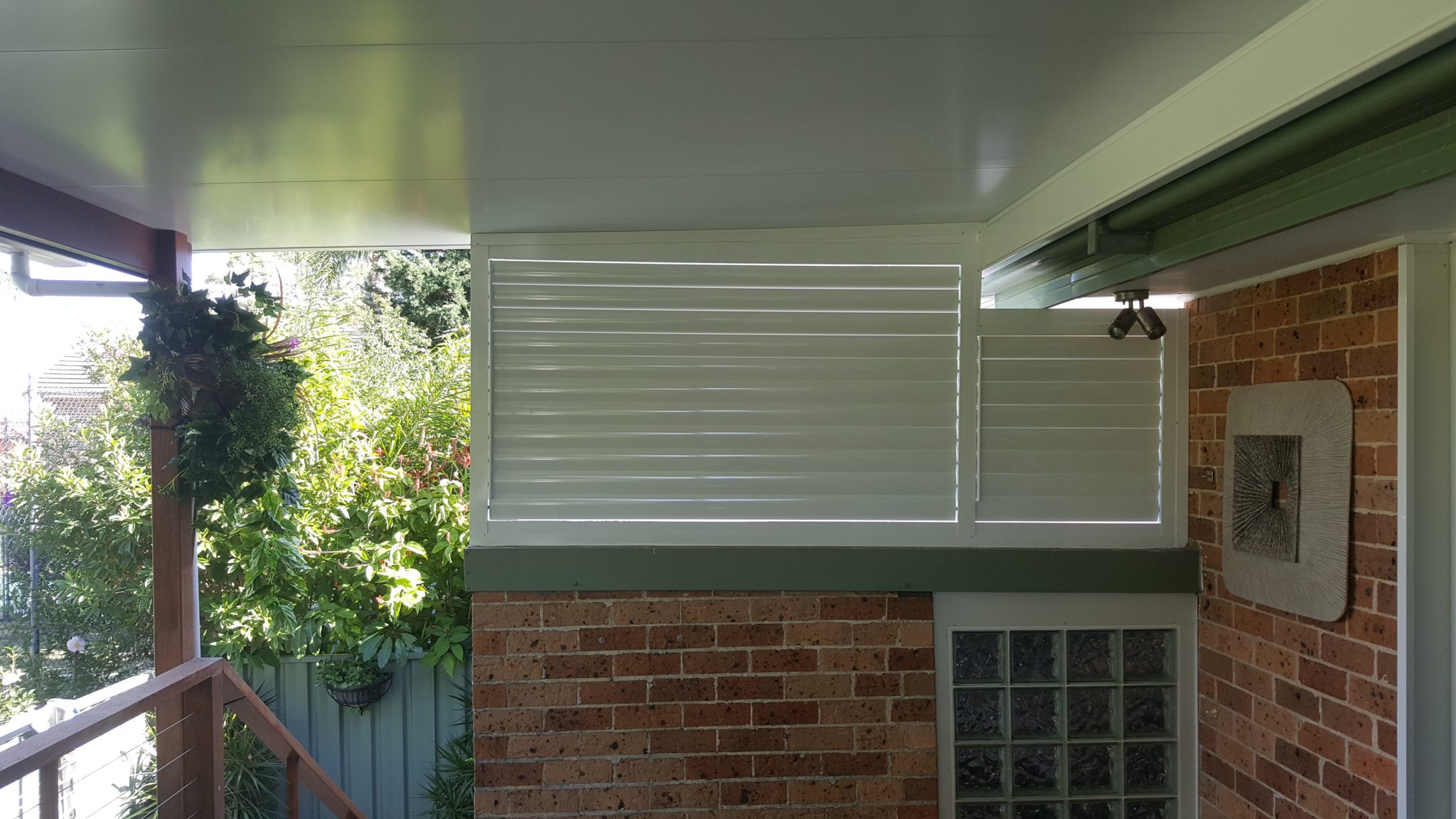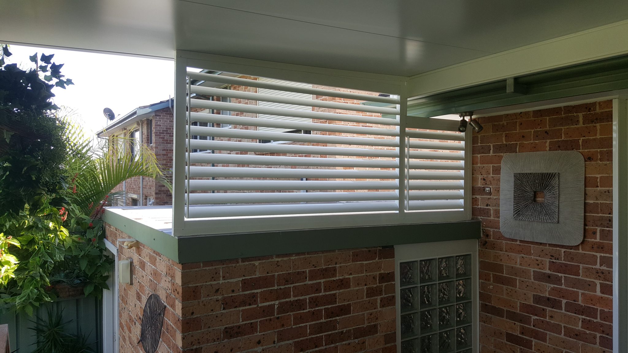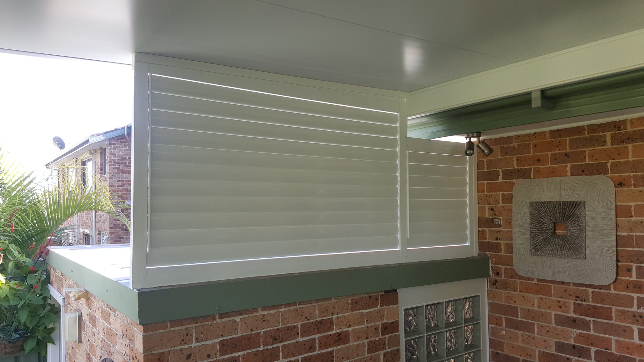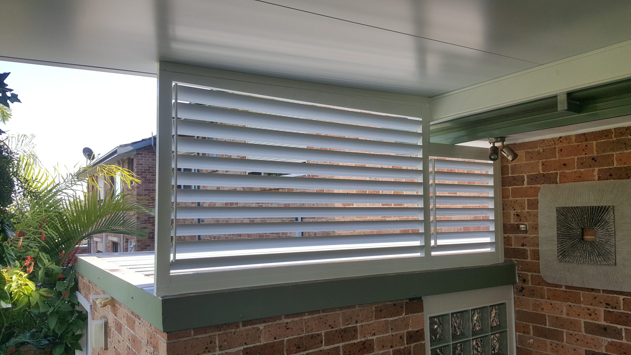 Aluminium cantilever louvres over sliding doors and windows, white powder coat, no front posts, Sydney home