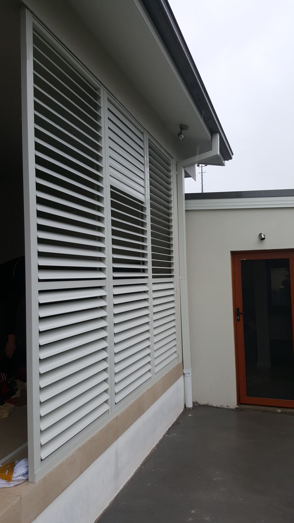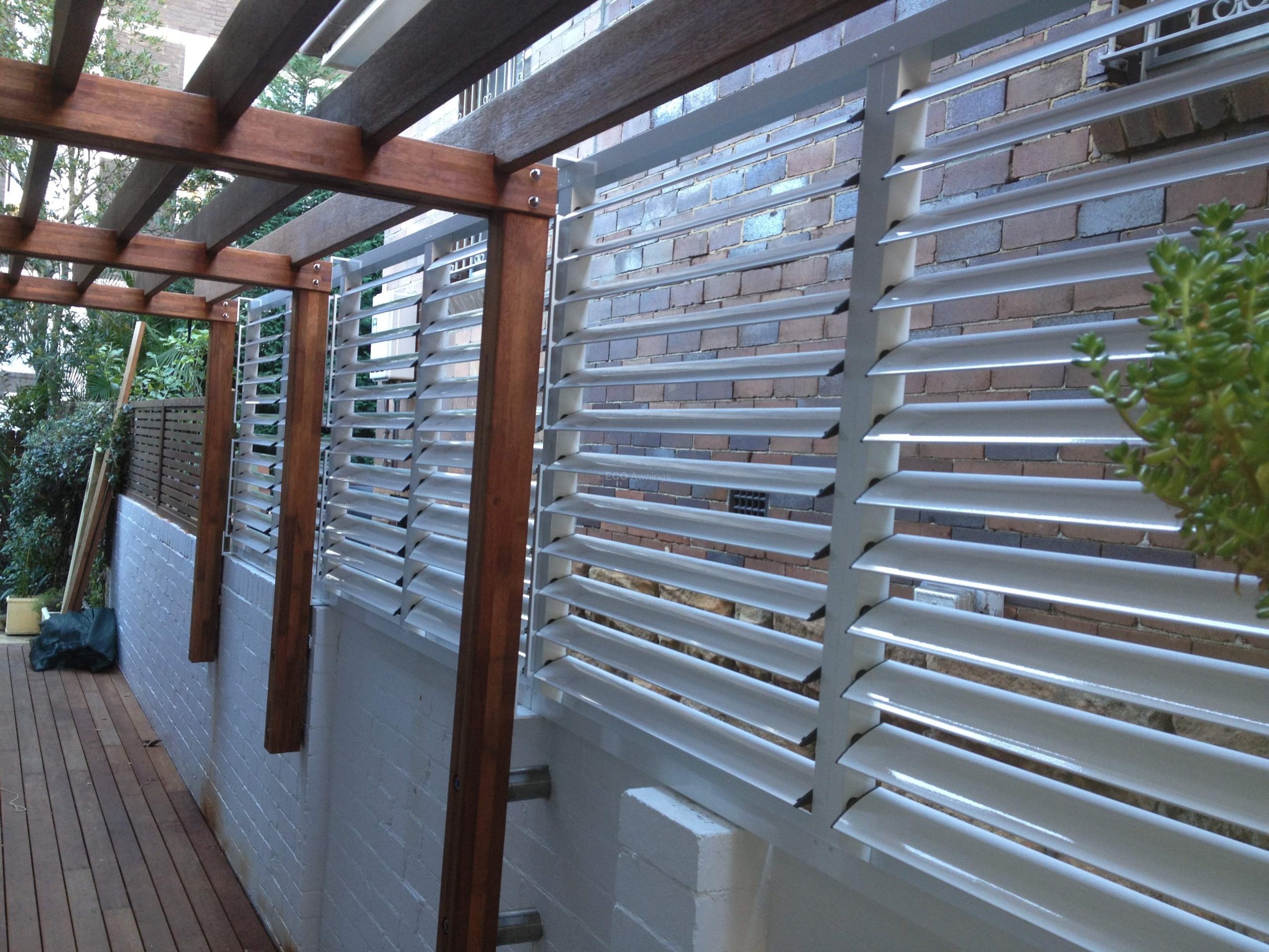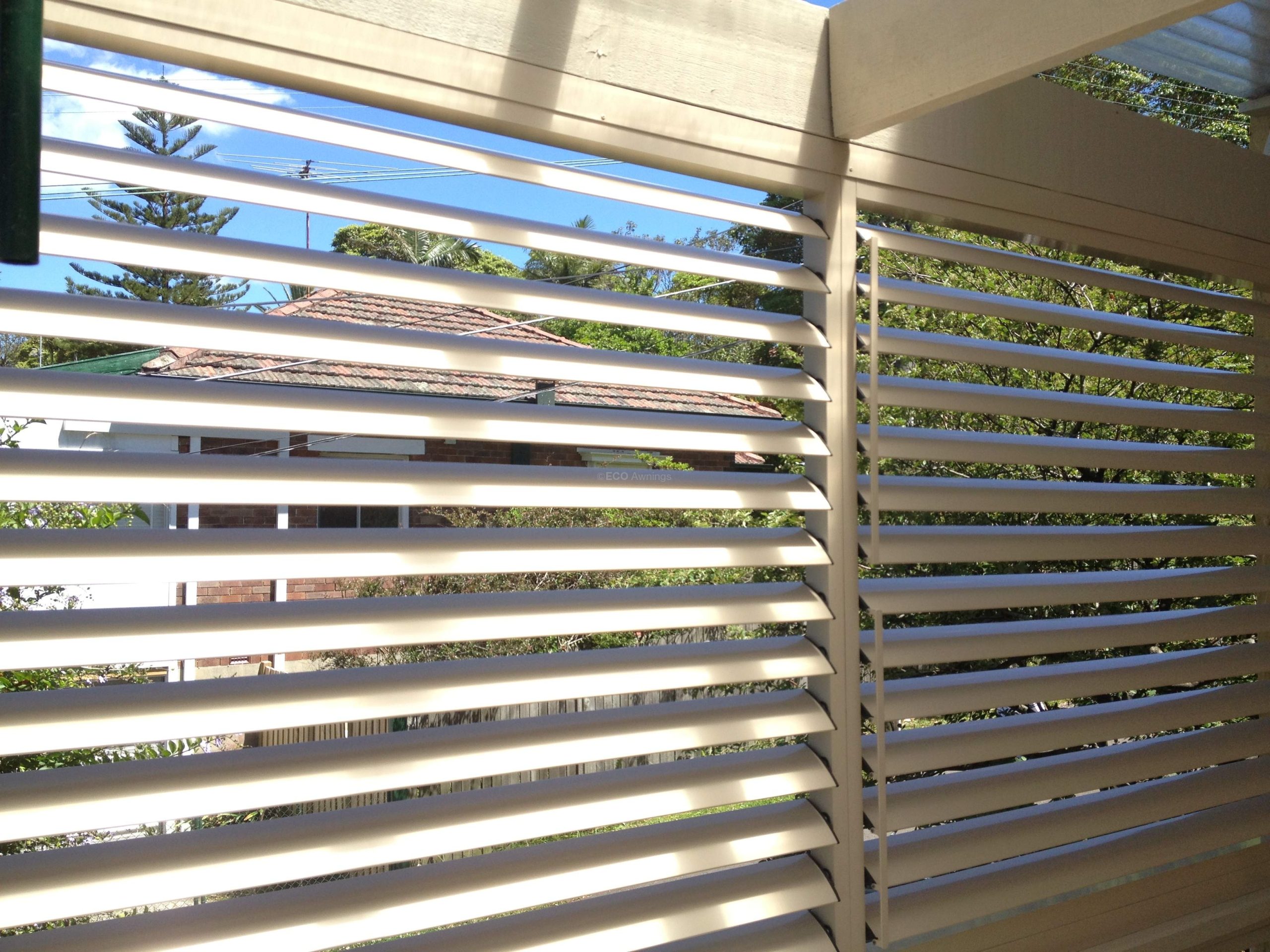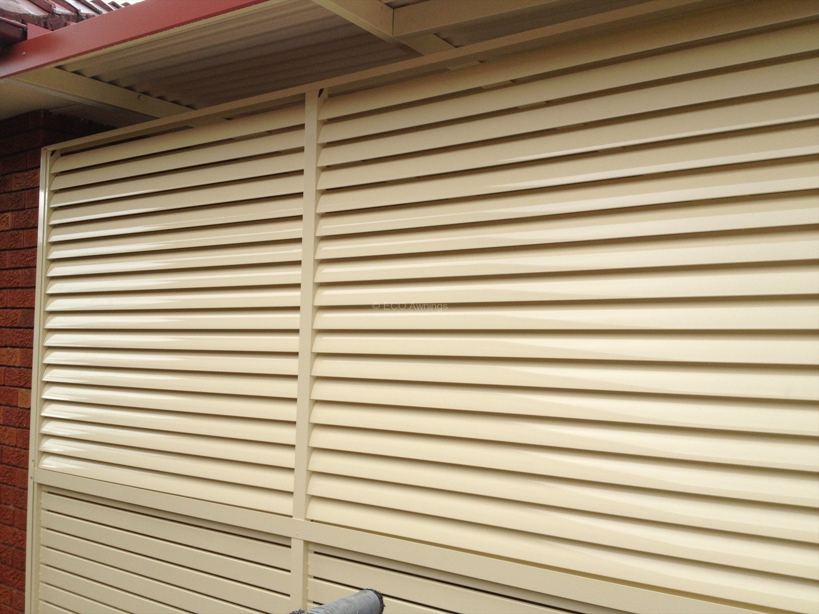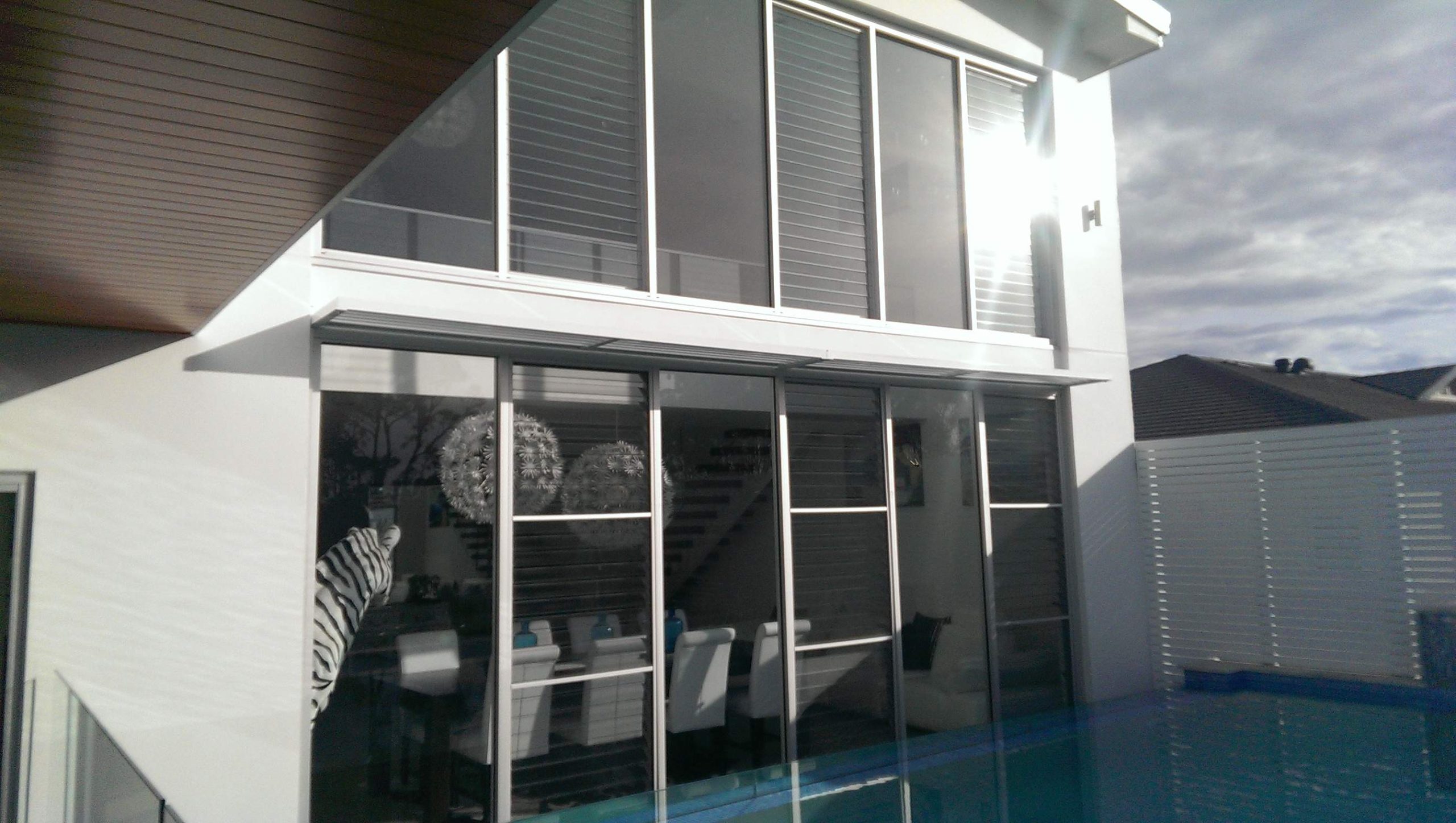 Aluminium cantilever louvres over sliding doors and windows, white powder coat, no front posts, Sydney home