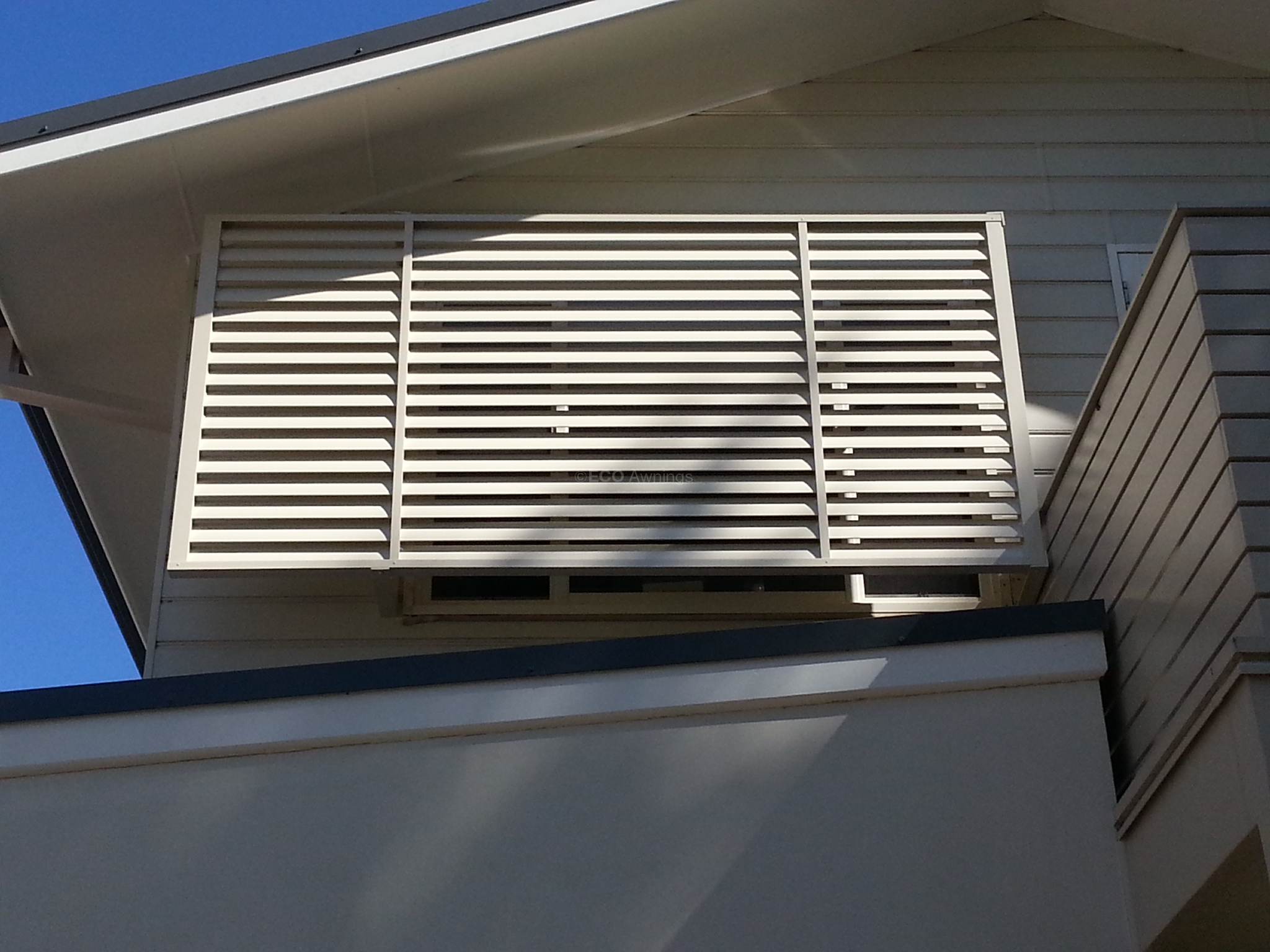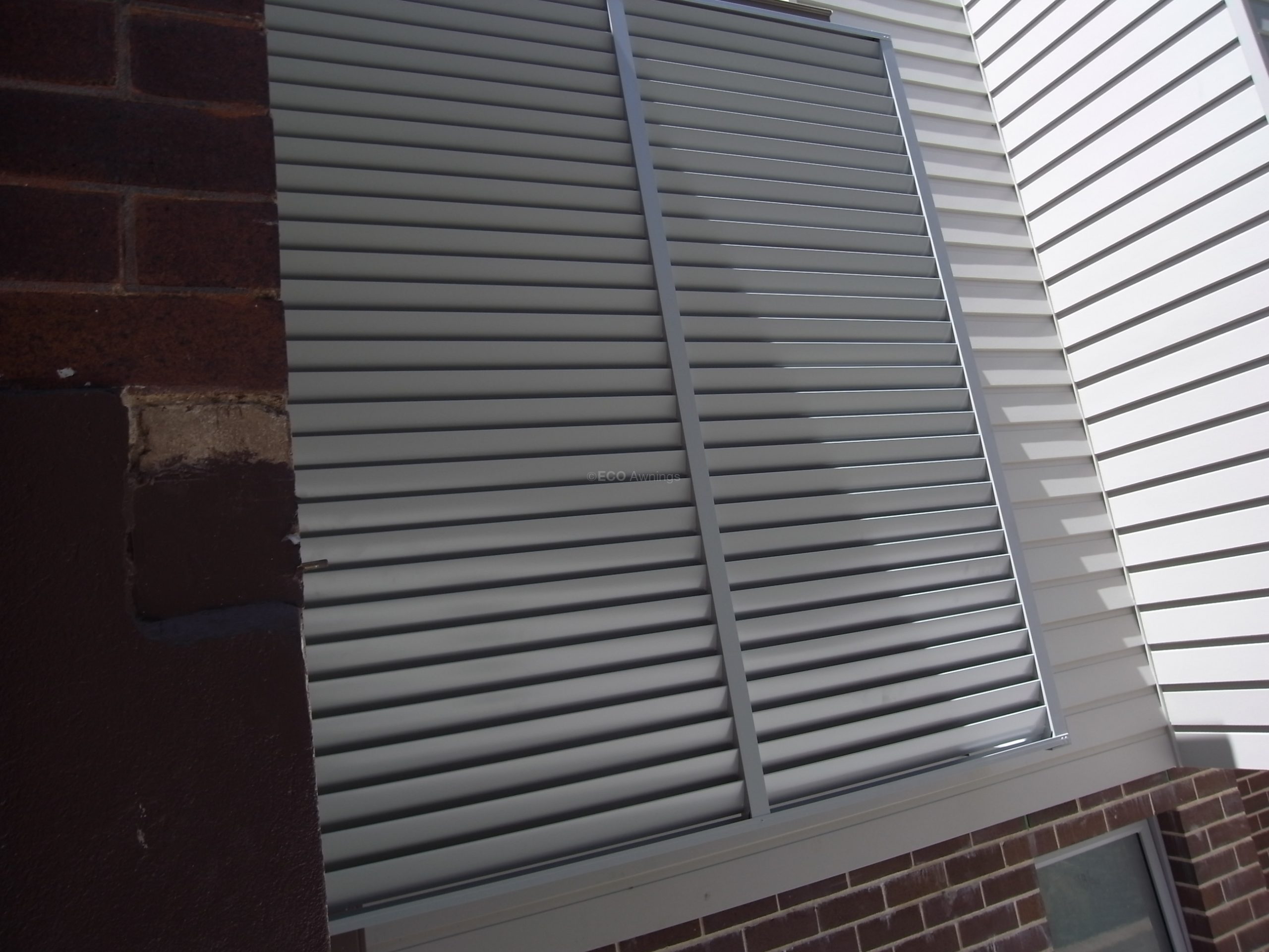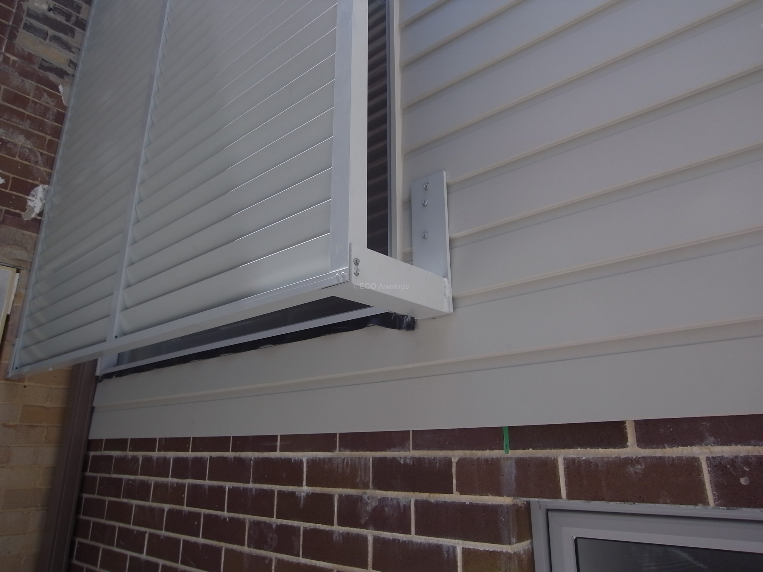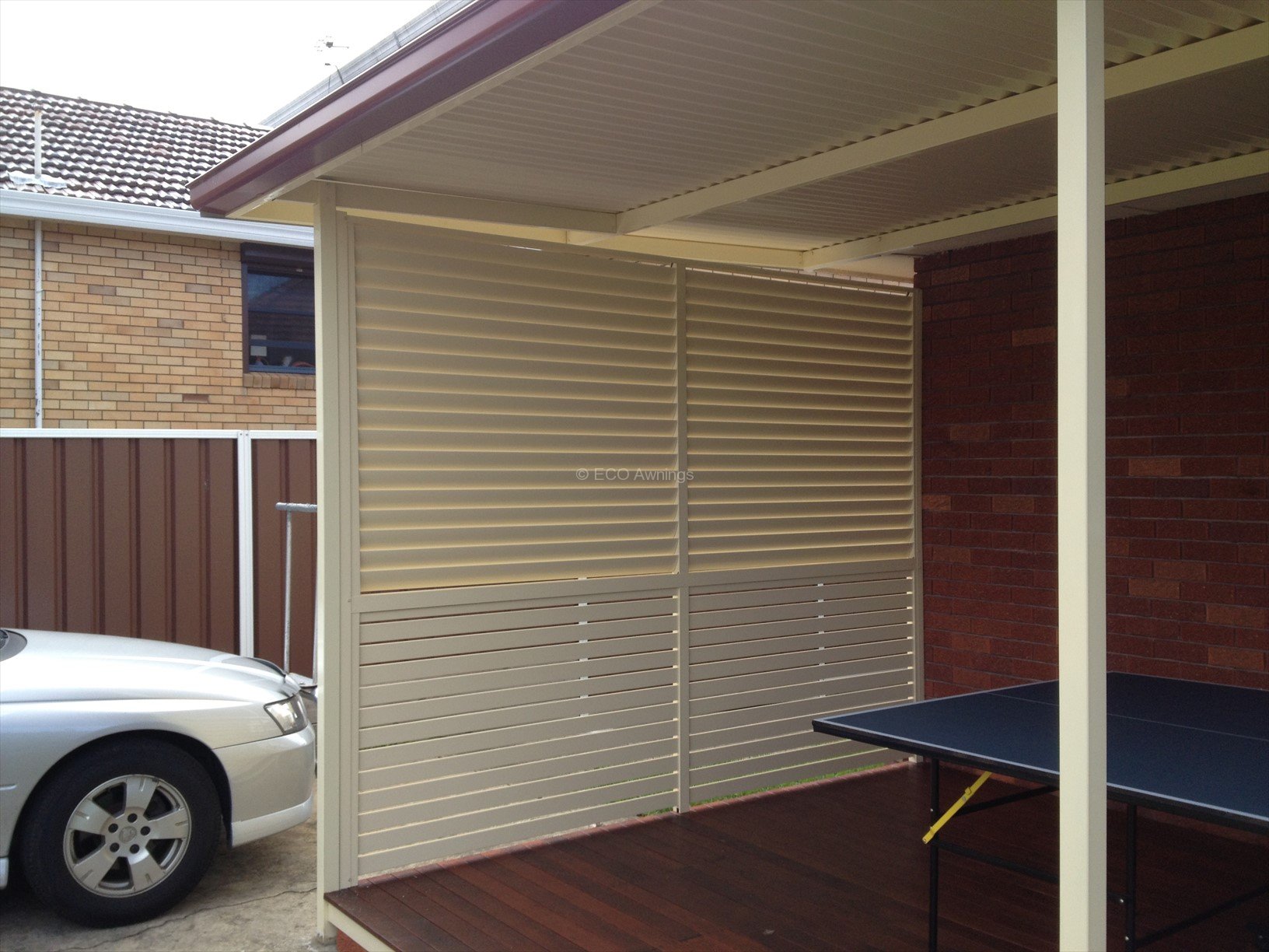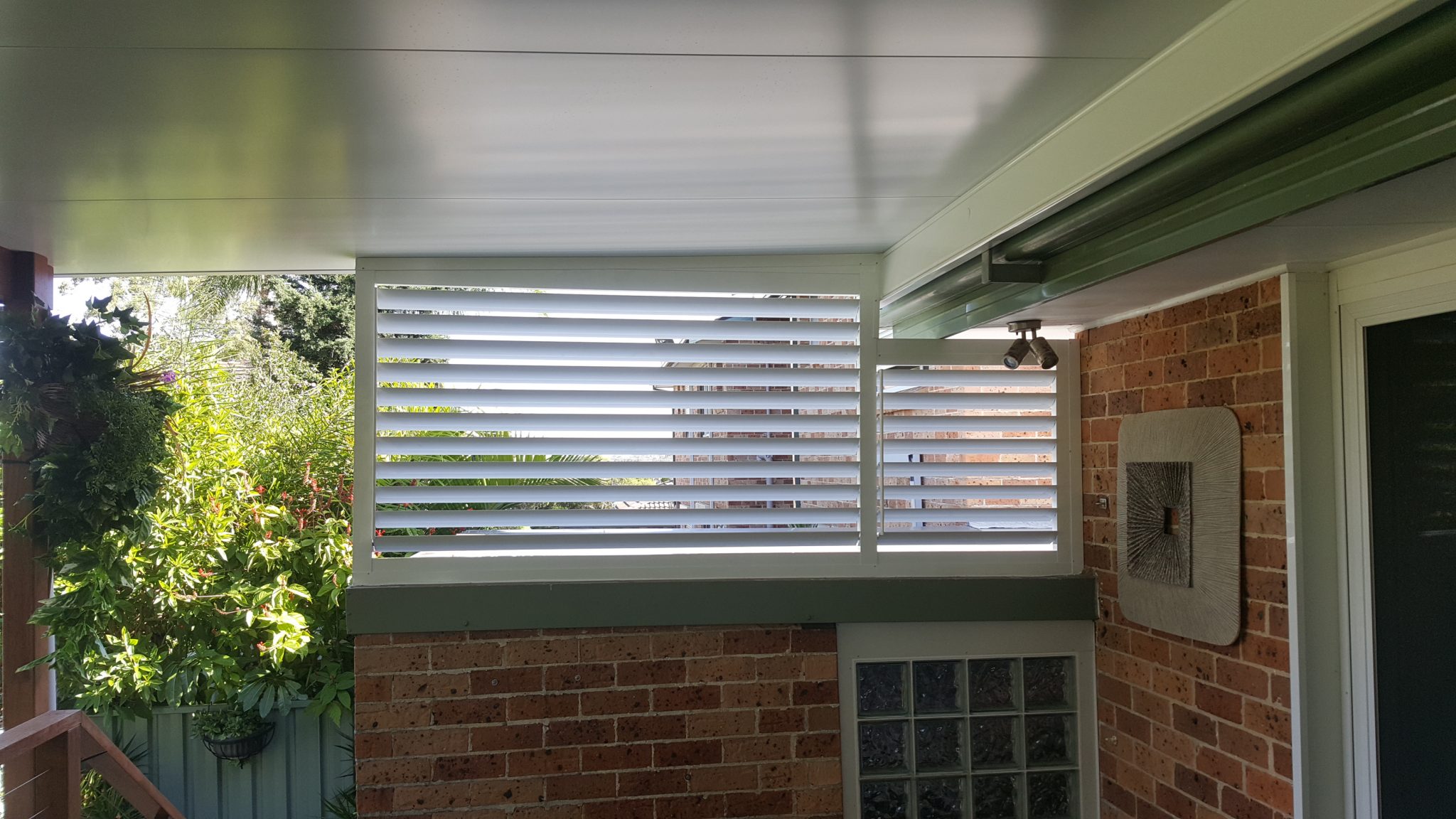 Aluminium cantilever louvres over sliding doors and windows, white powder coat, no front posts, Sydney home