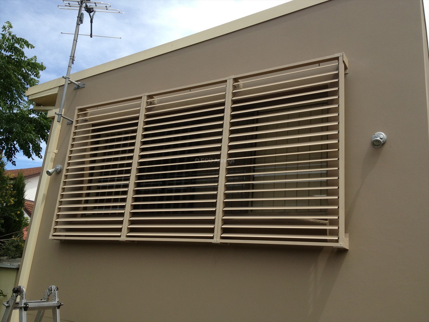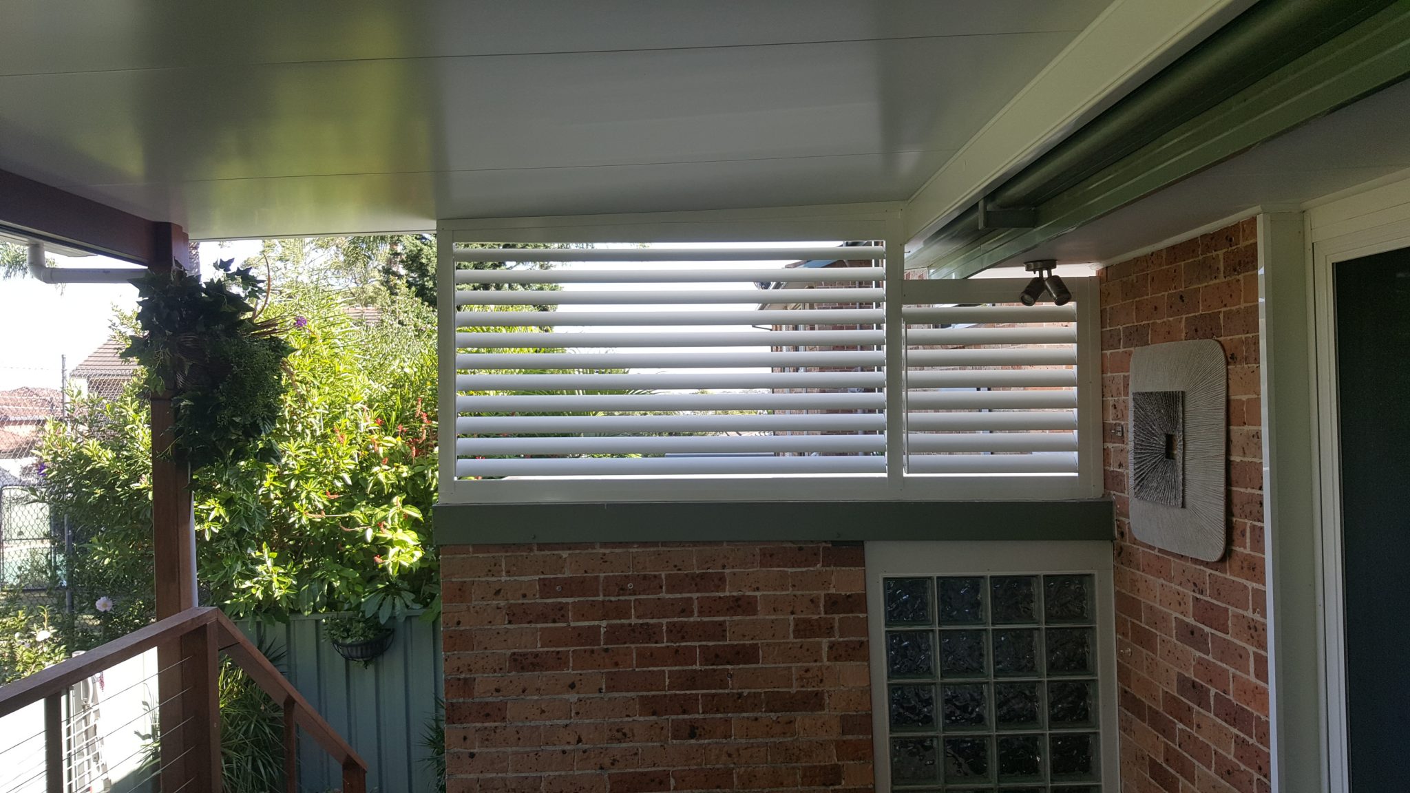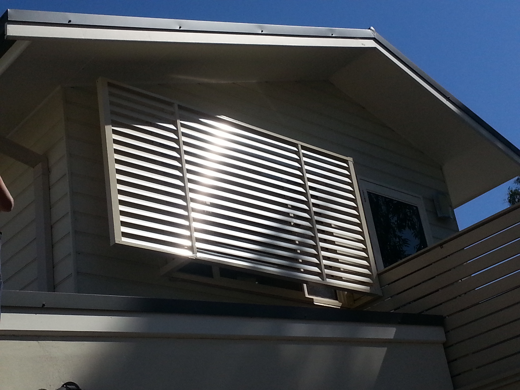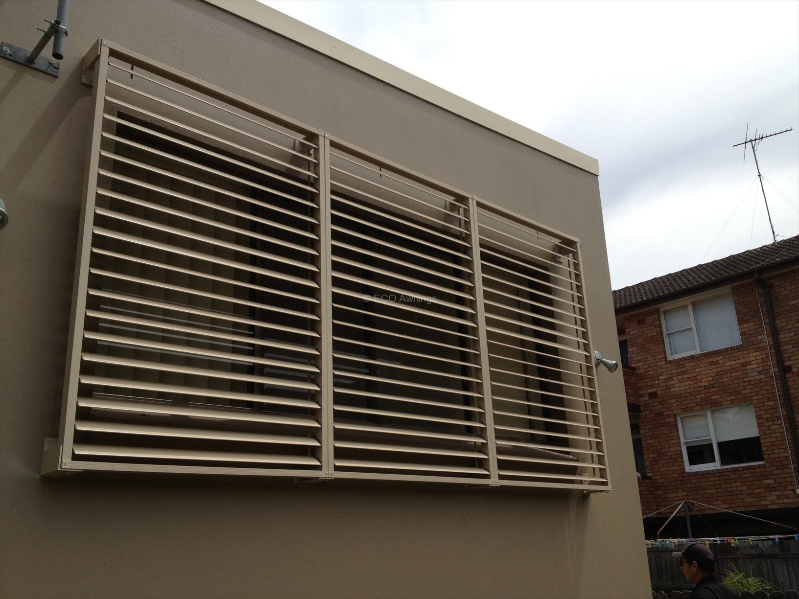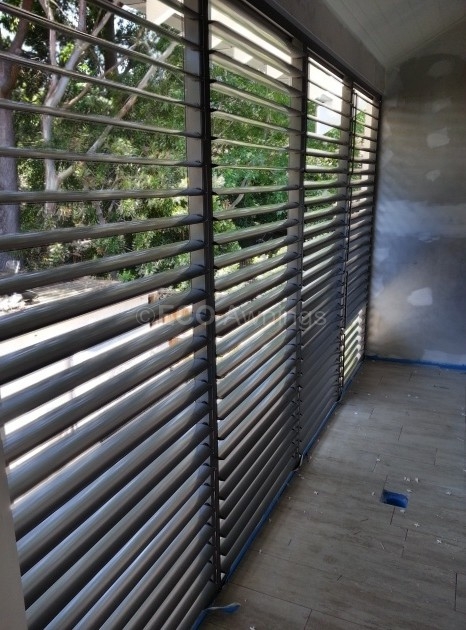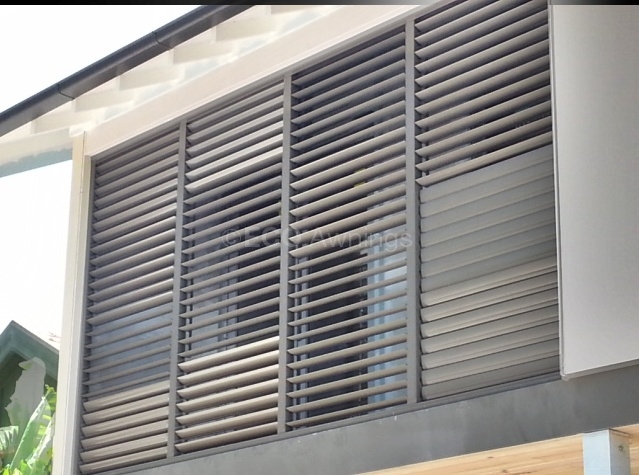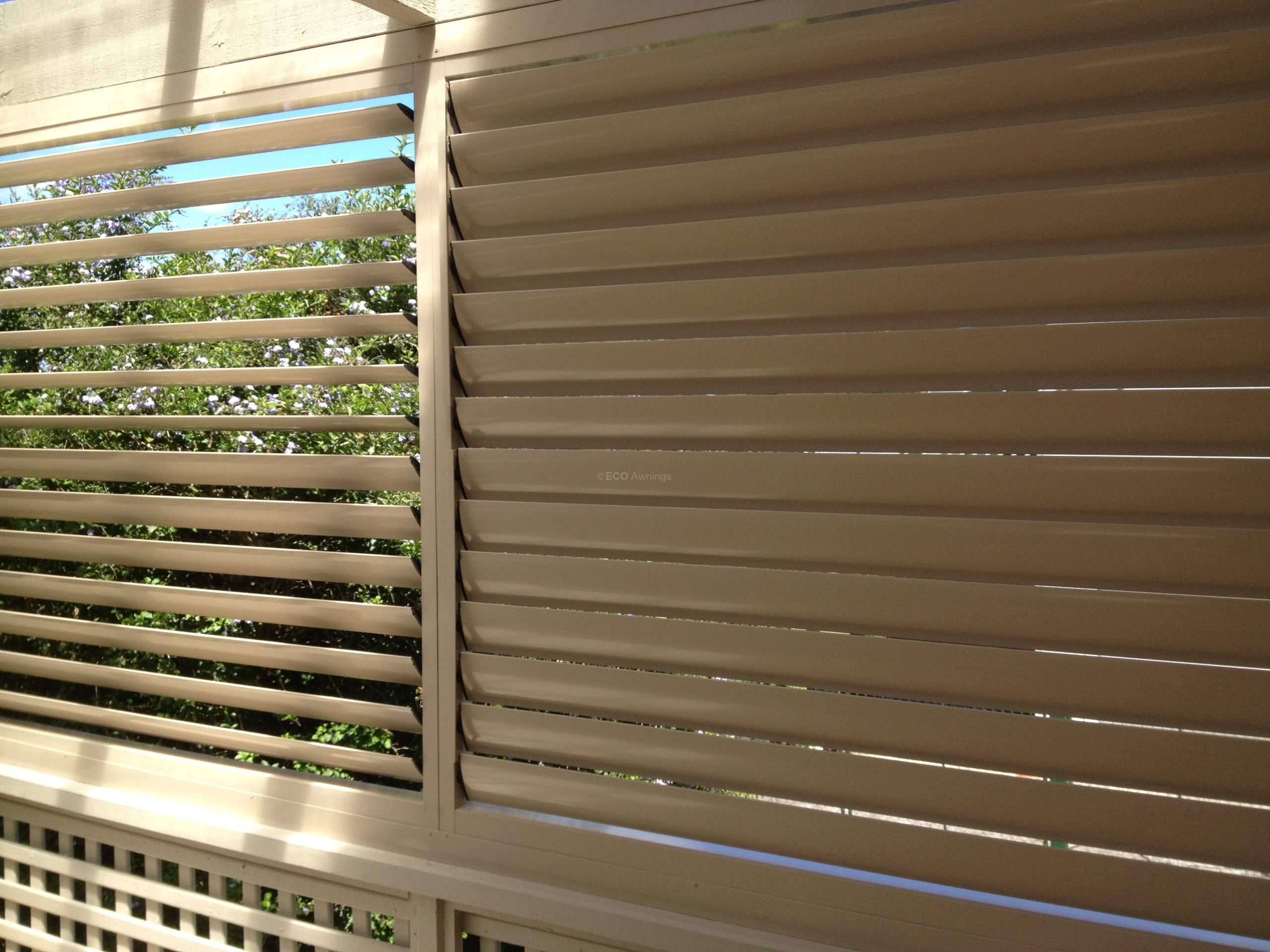 Aluminium cantilever louvres over sliding doors and windows, white powder coat, no front posts, Sydney home