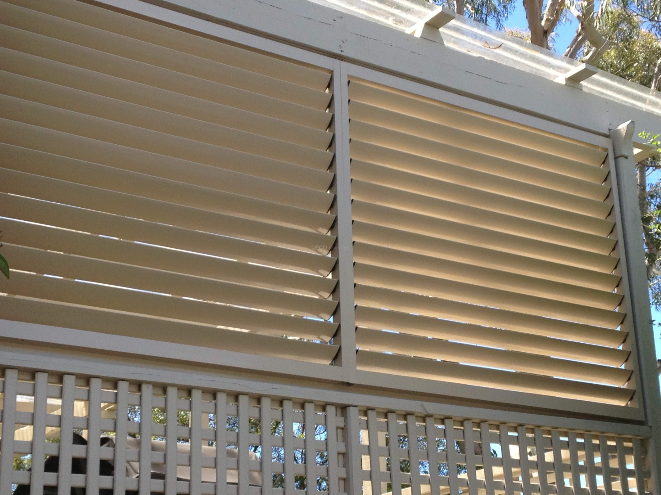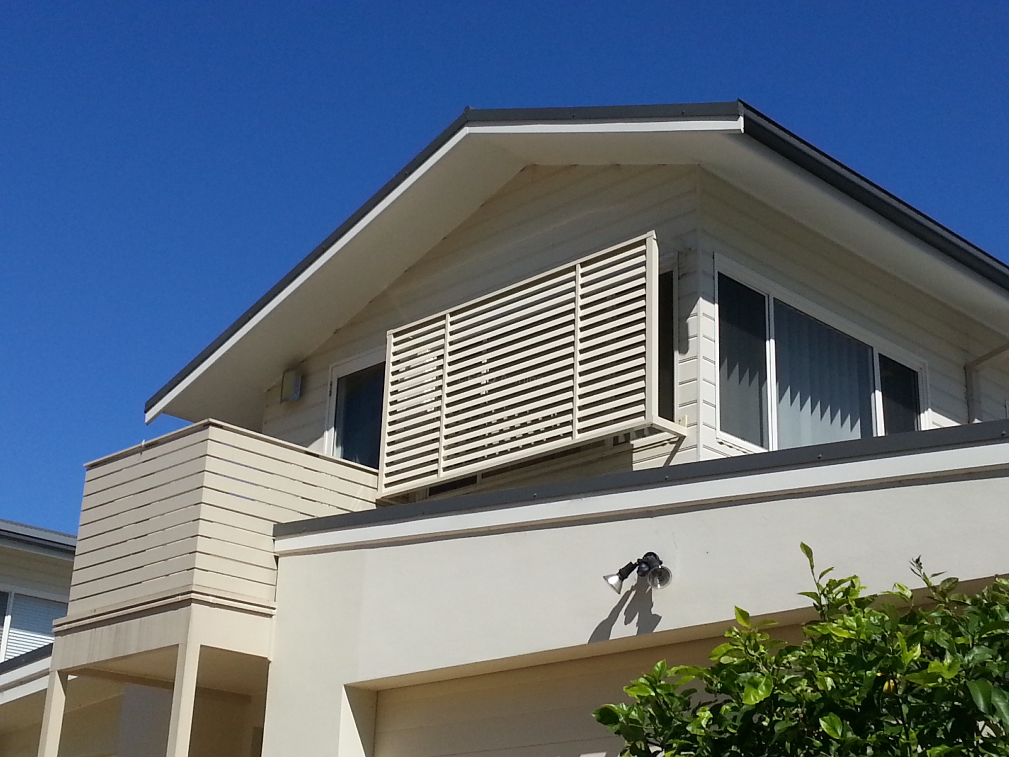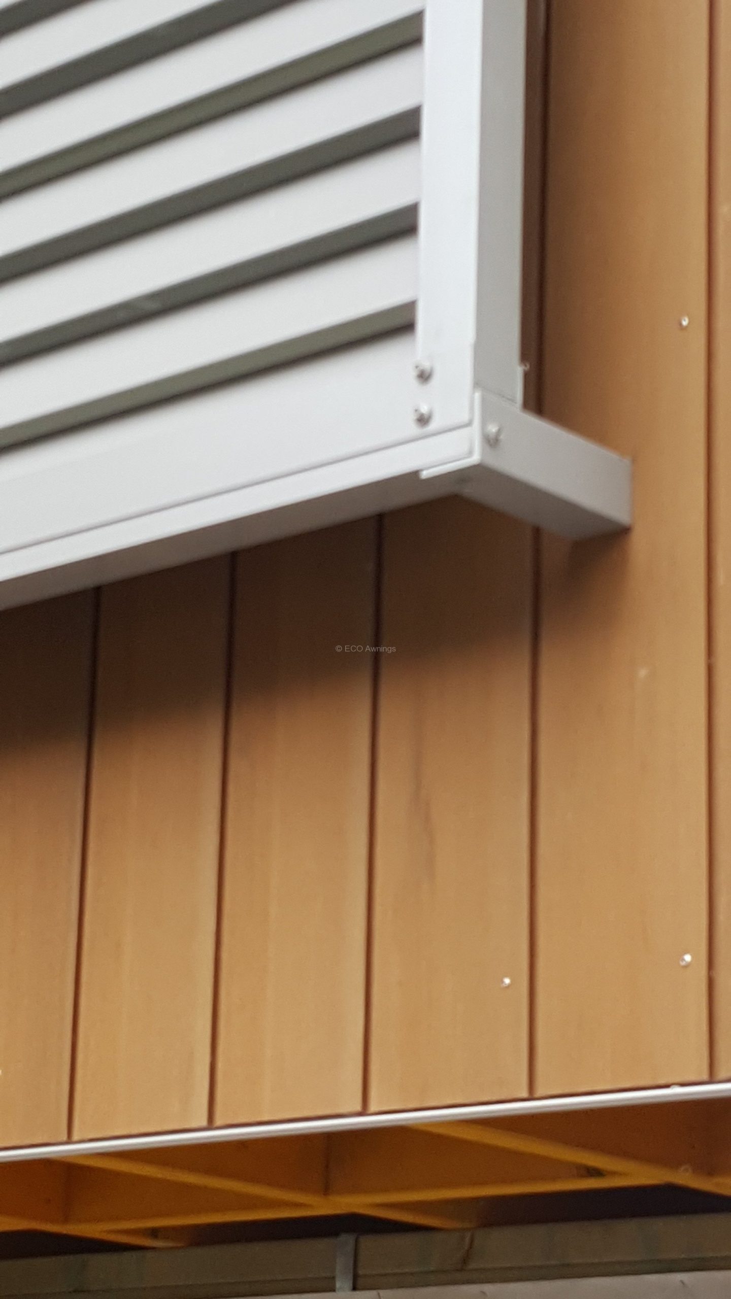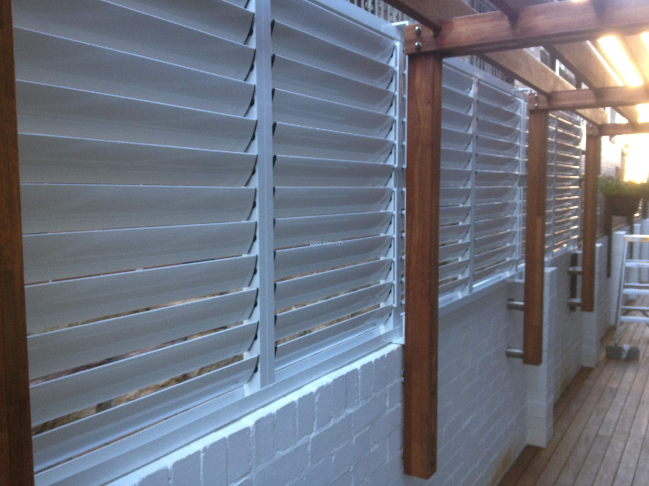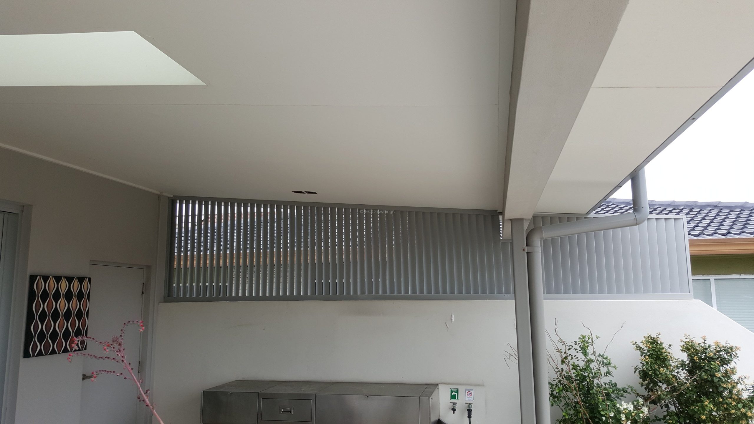 Aluminium cantilever louvres over sliding doors and windows, white powder coat, no front posts, Sydney home
