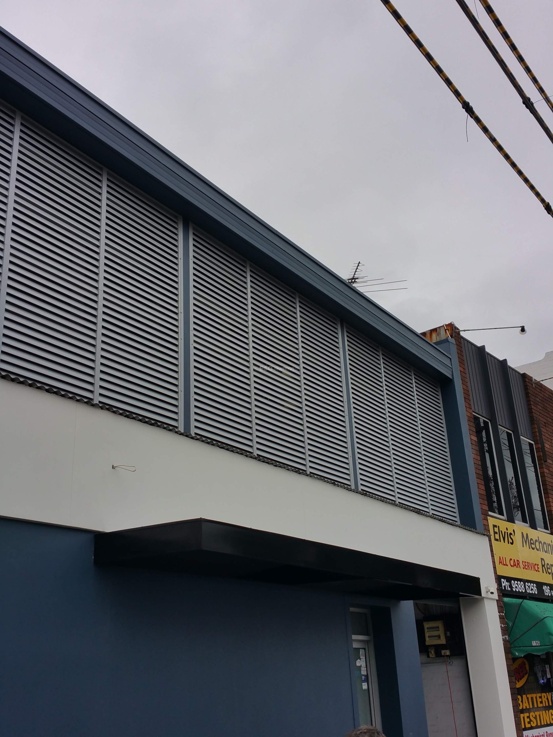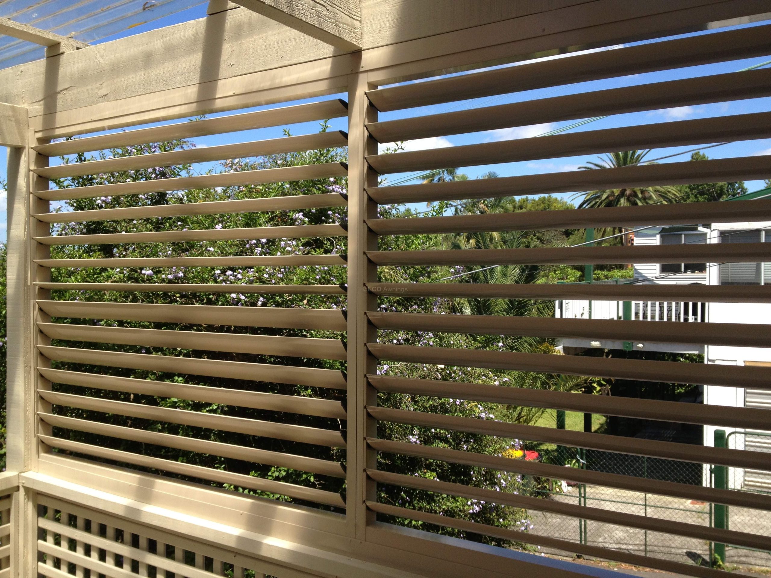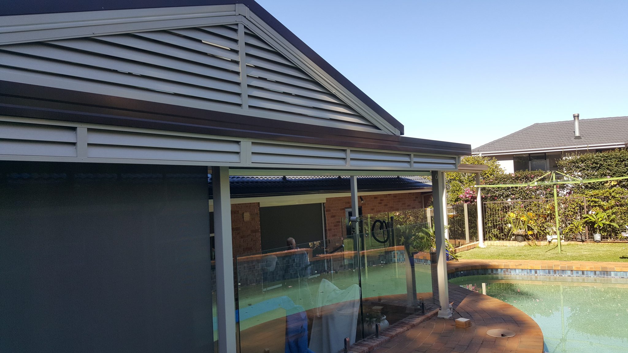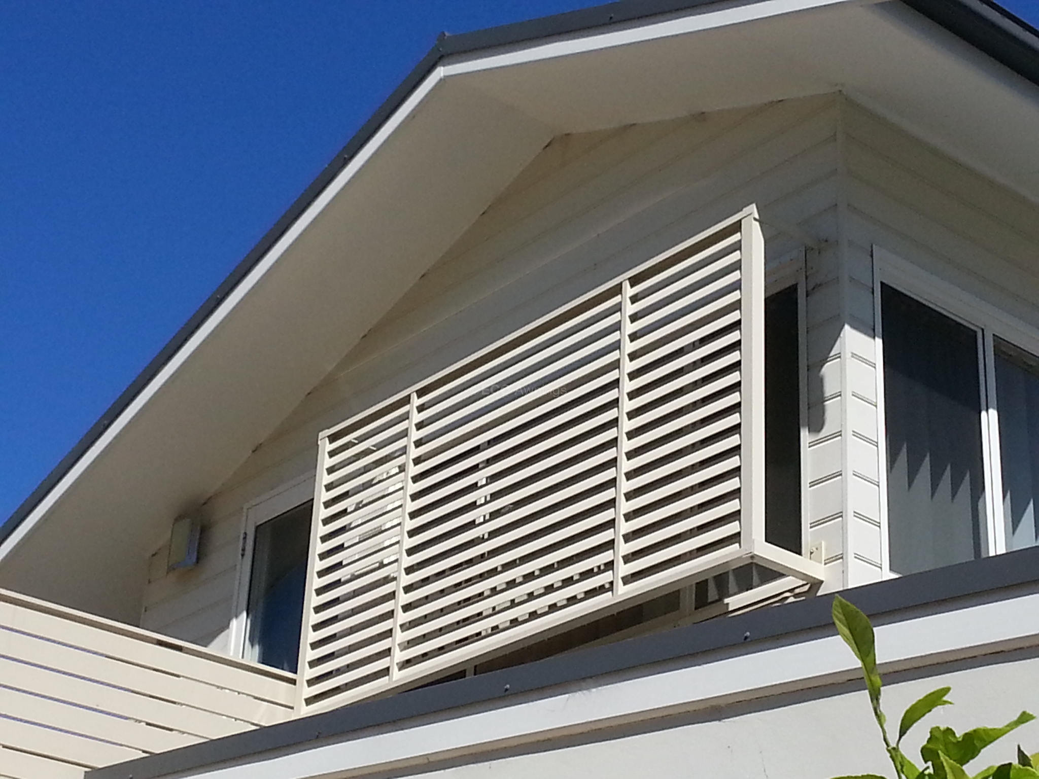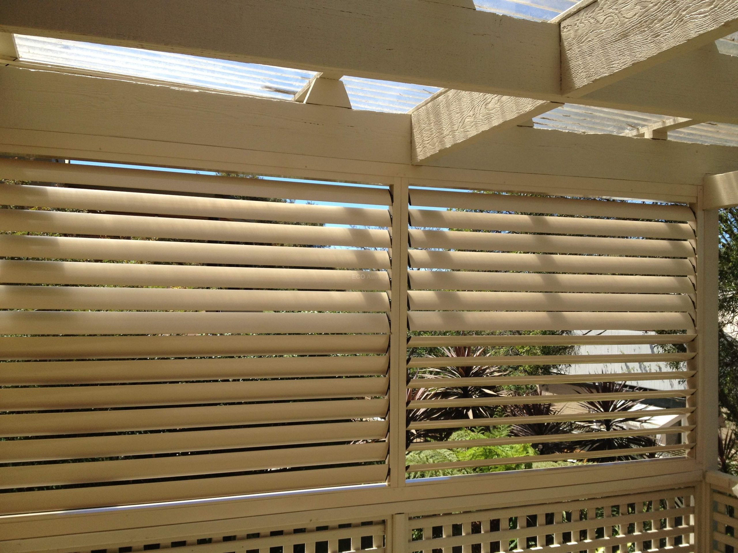 Aluminium cantilever louvres over sliding doors and windows, white powder coat, no front posts, Sydney home