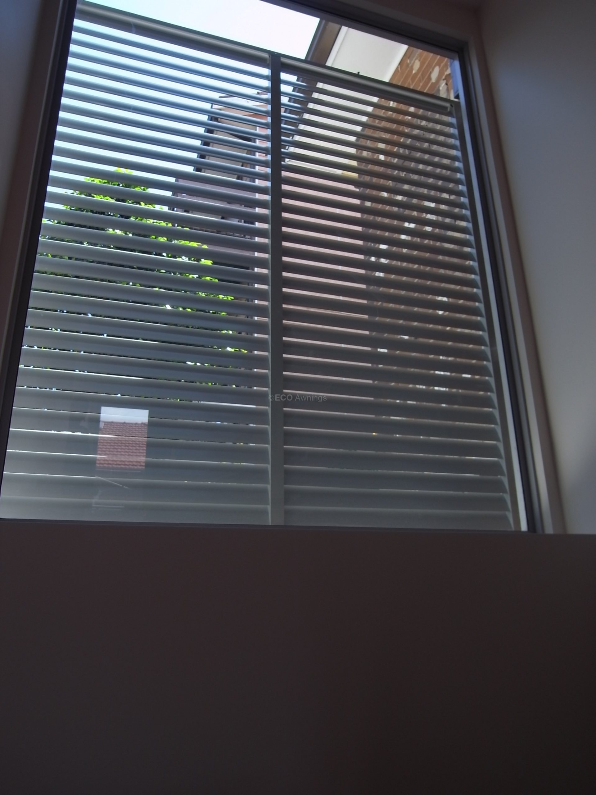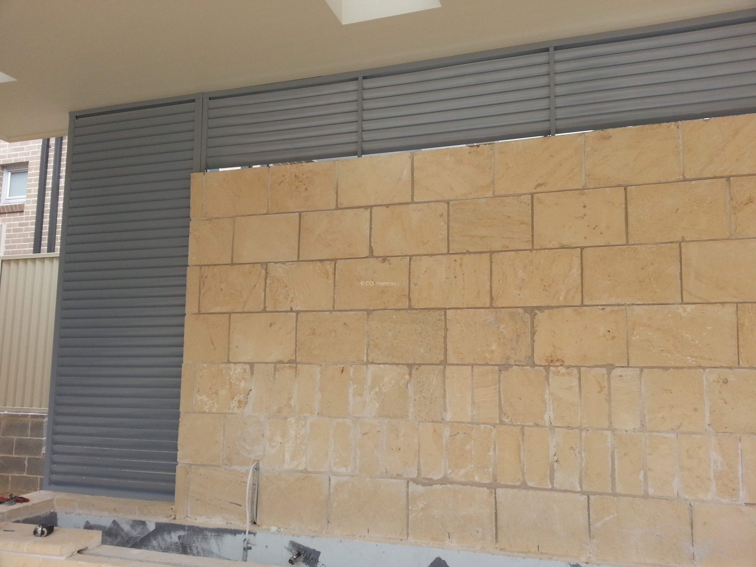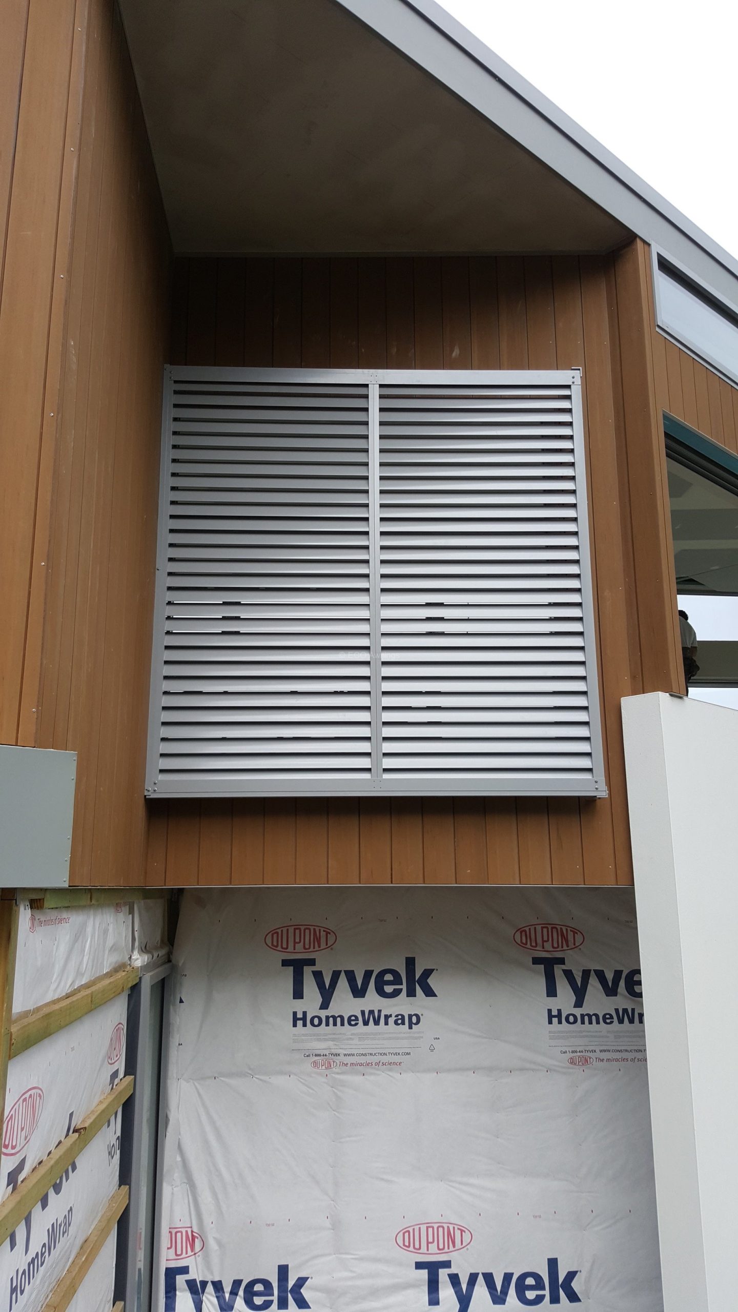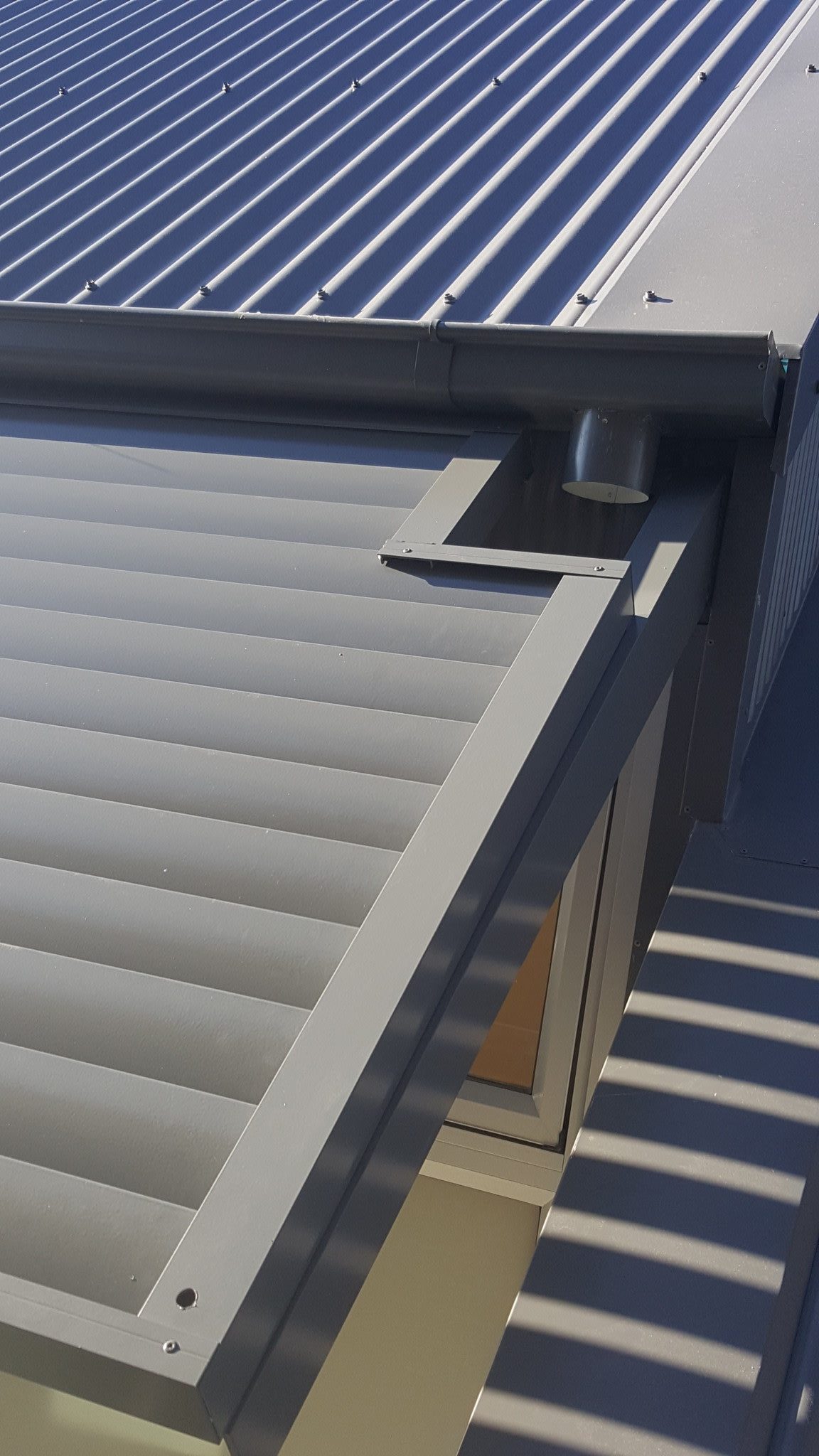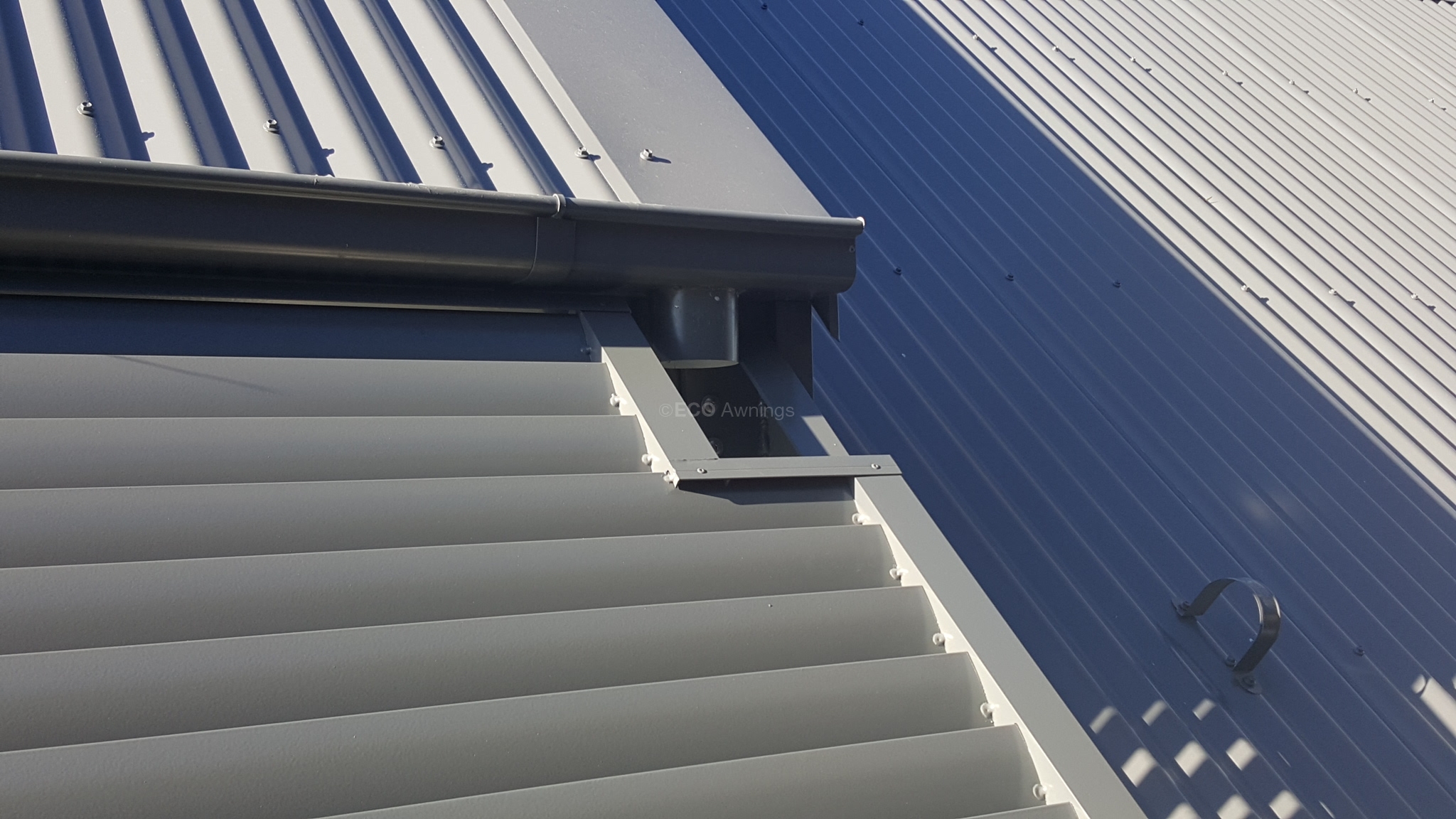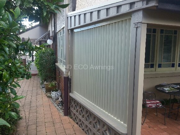 Aluminium cantilever louvres over sliding doors and windows, white powder coat, no front posts, Sydney home