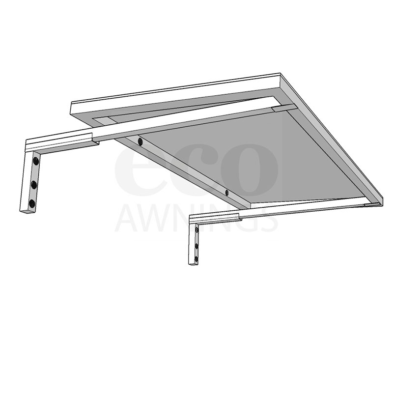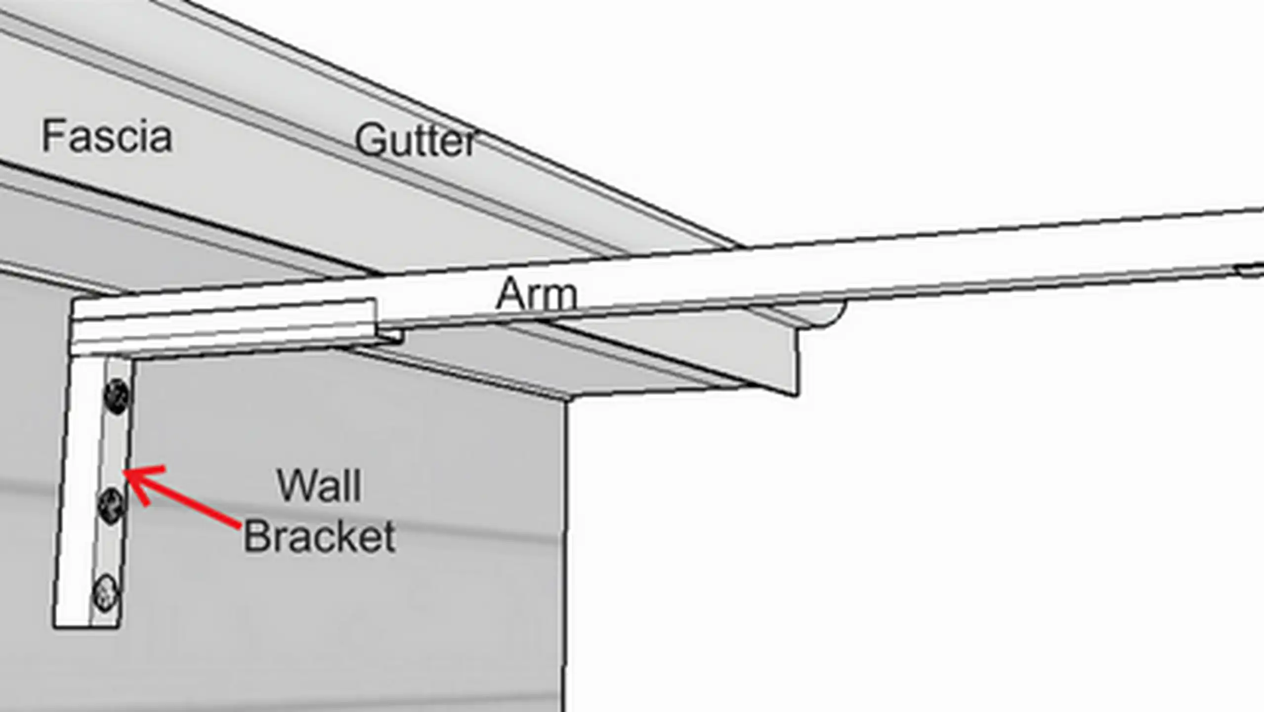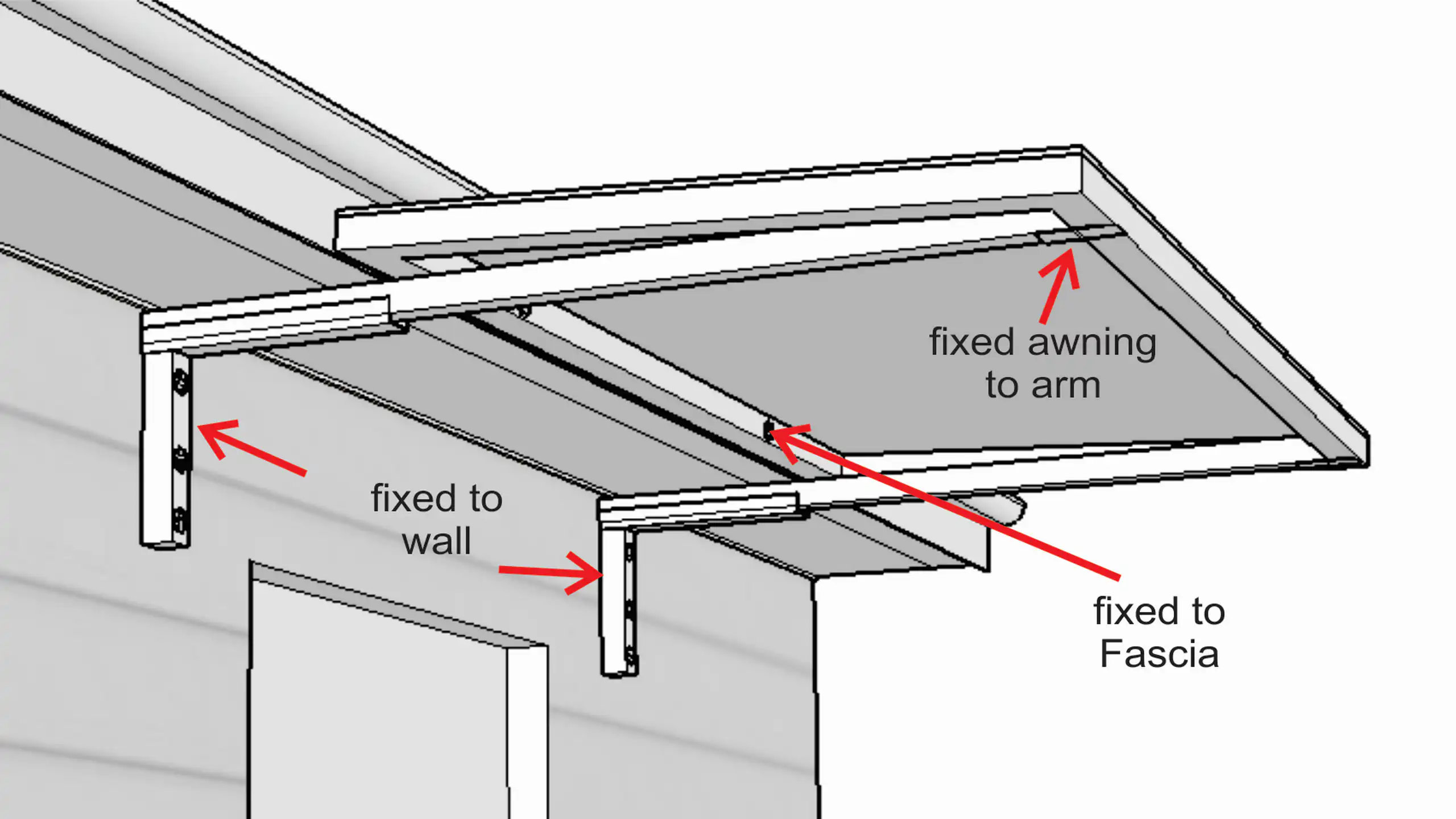 The awning panel sits on the arms and is fixed to the fascia just below the gutter.